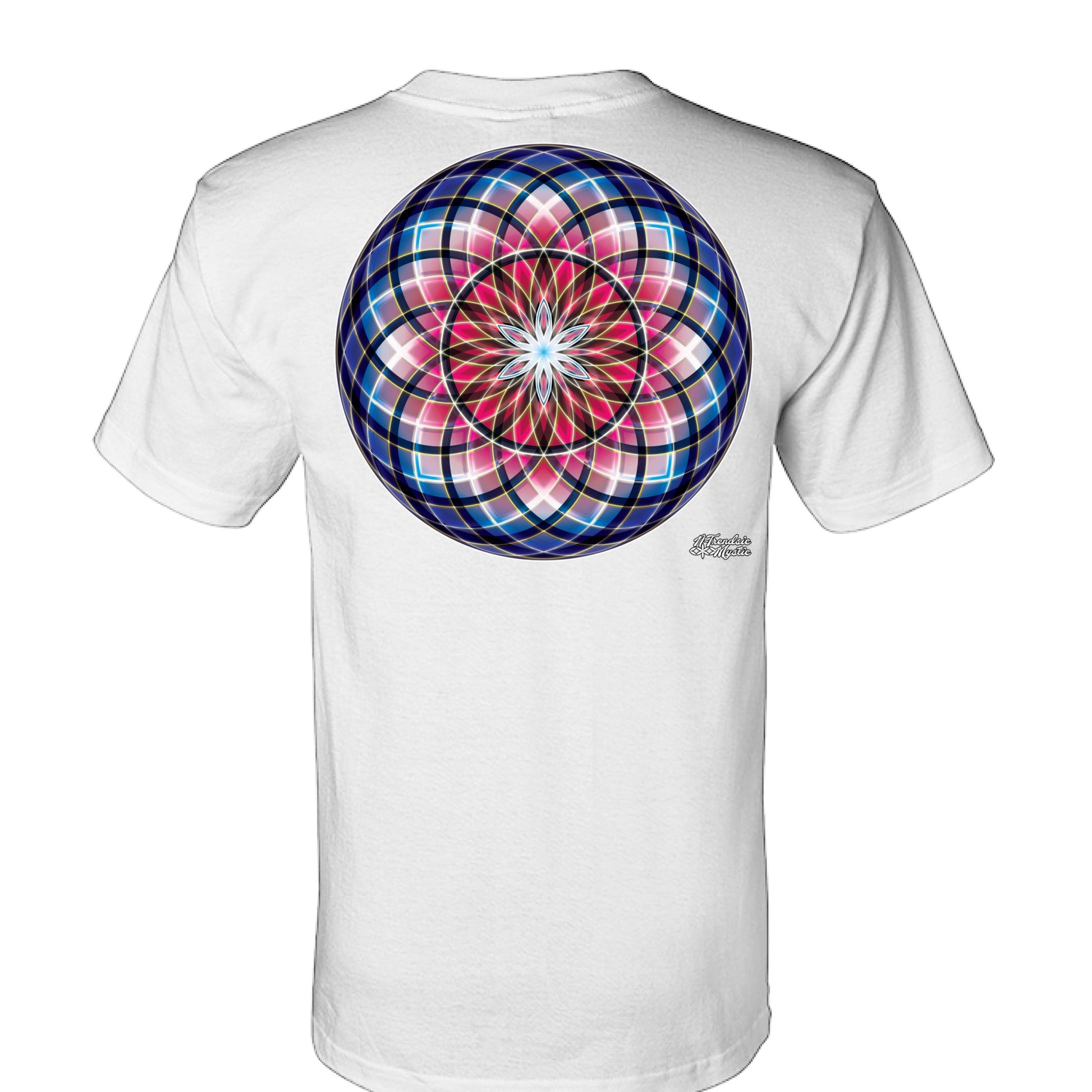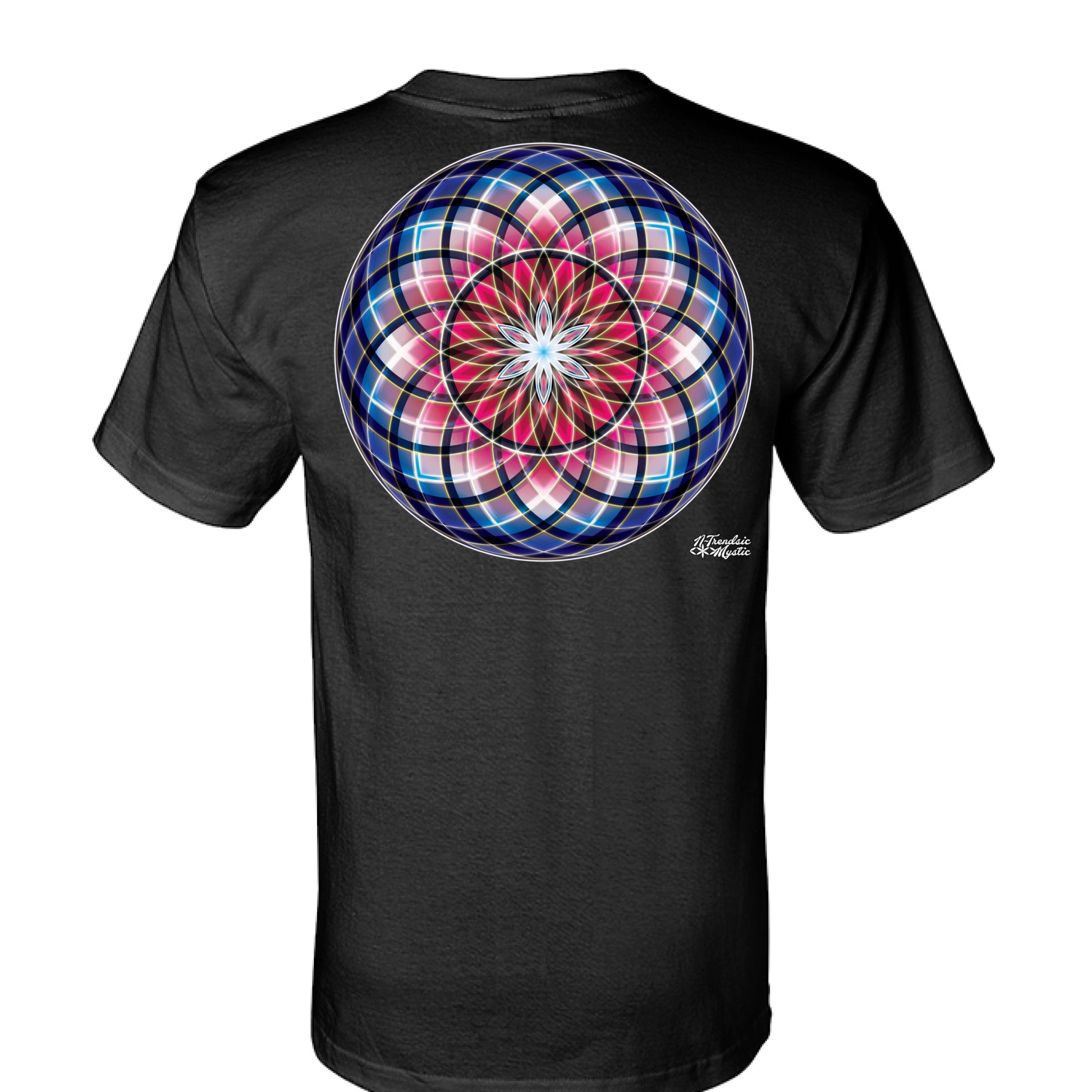 Step into the luminous pull of the Blood Moon. This sacred geometry t-shirt features a radiant crystalline sphere rendered in red, black, and blue tones with golden grid lines, converging into a glowing six-petaled star at its center. The design evokes the timeless Flower of Life pattern — a symbol of unity, harmony, and infinite possibility.