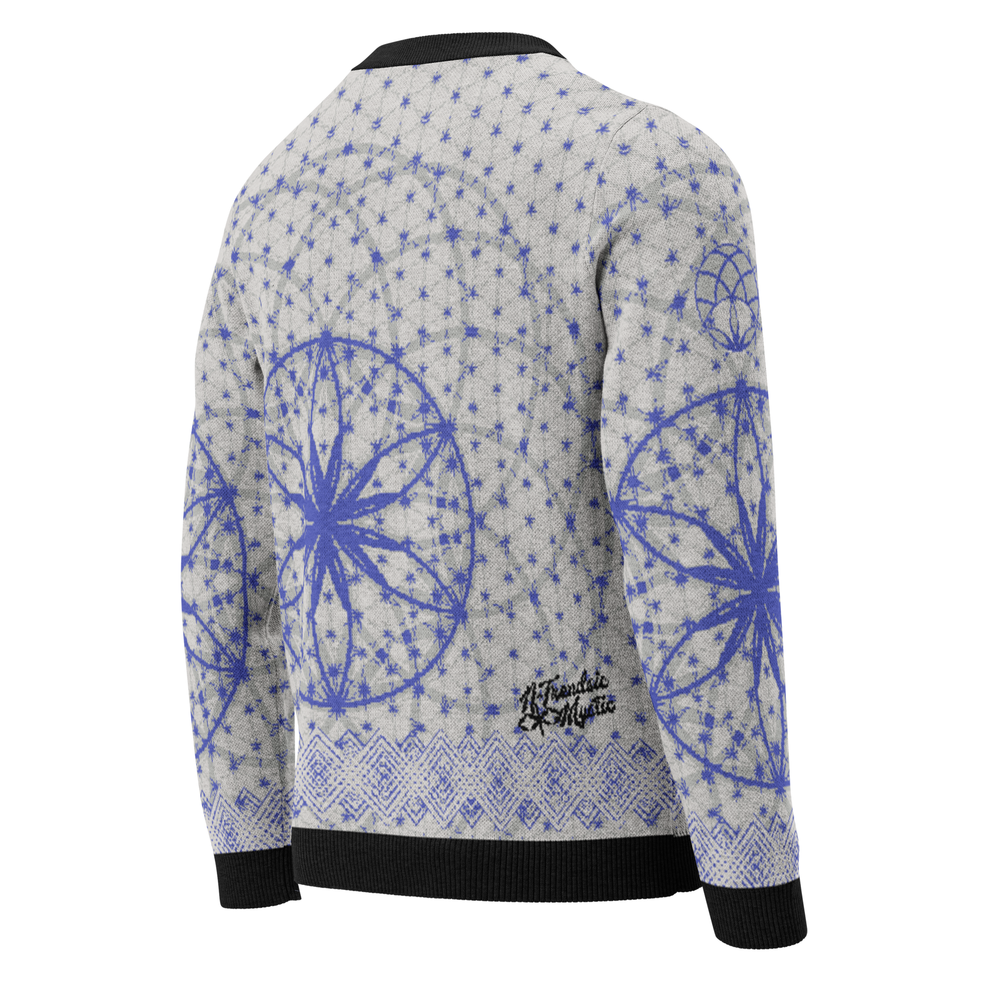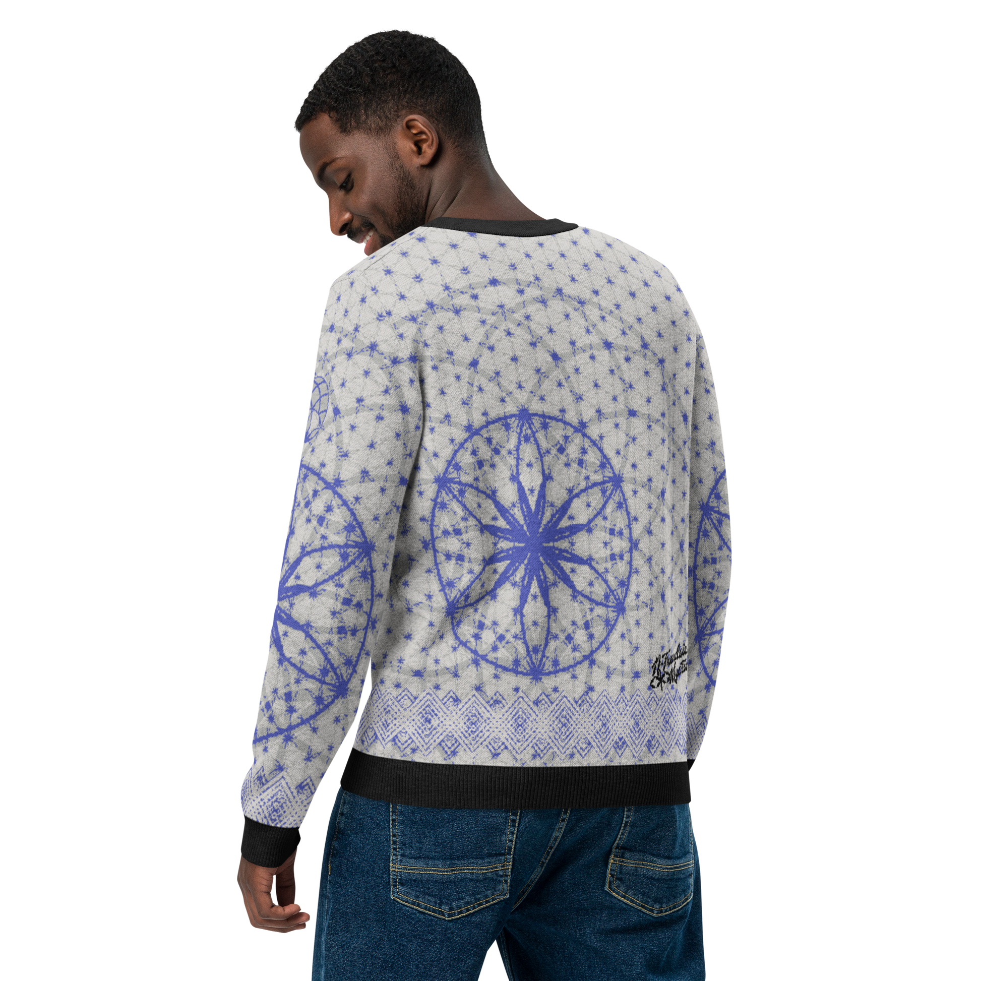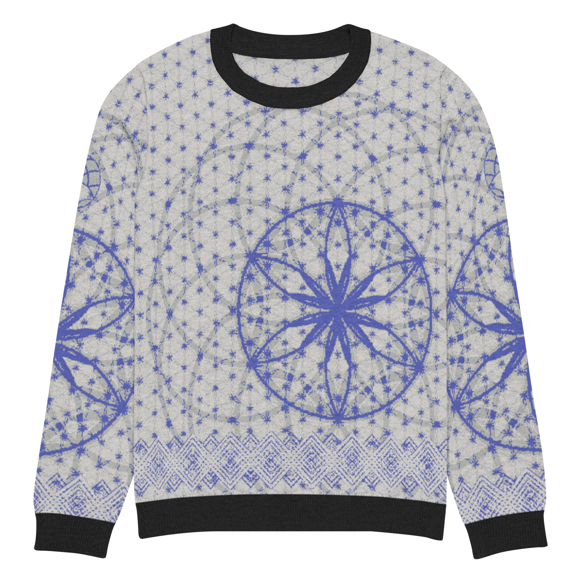 Elevate your wardrobe with the Blue Prima Mystica | Knitted Crew Neck Sweater. Crafted via Knit-On-Demand technology, this piece blends visionary design with advanced textile craftsmanship. A radiant blue tapestry unfolds across the knit, rooted in sacred geometry and modern streetwear aesthetics.