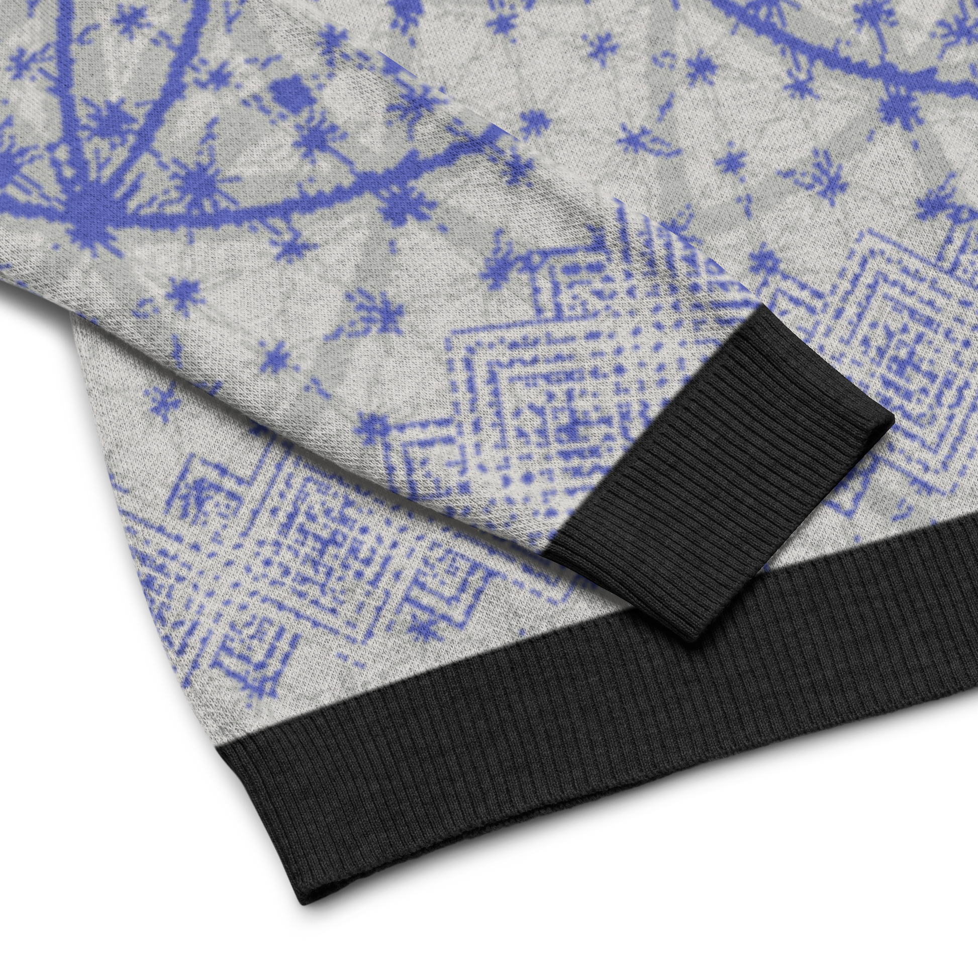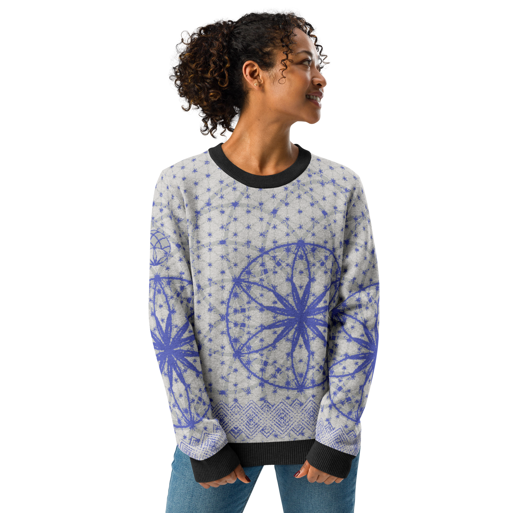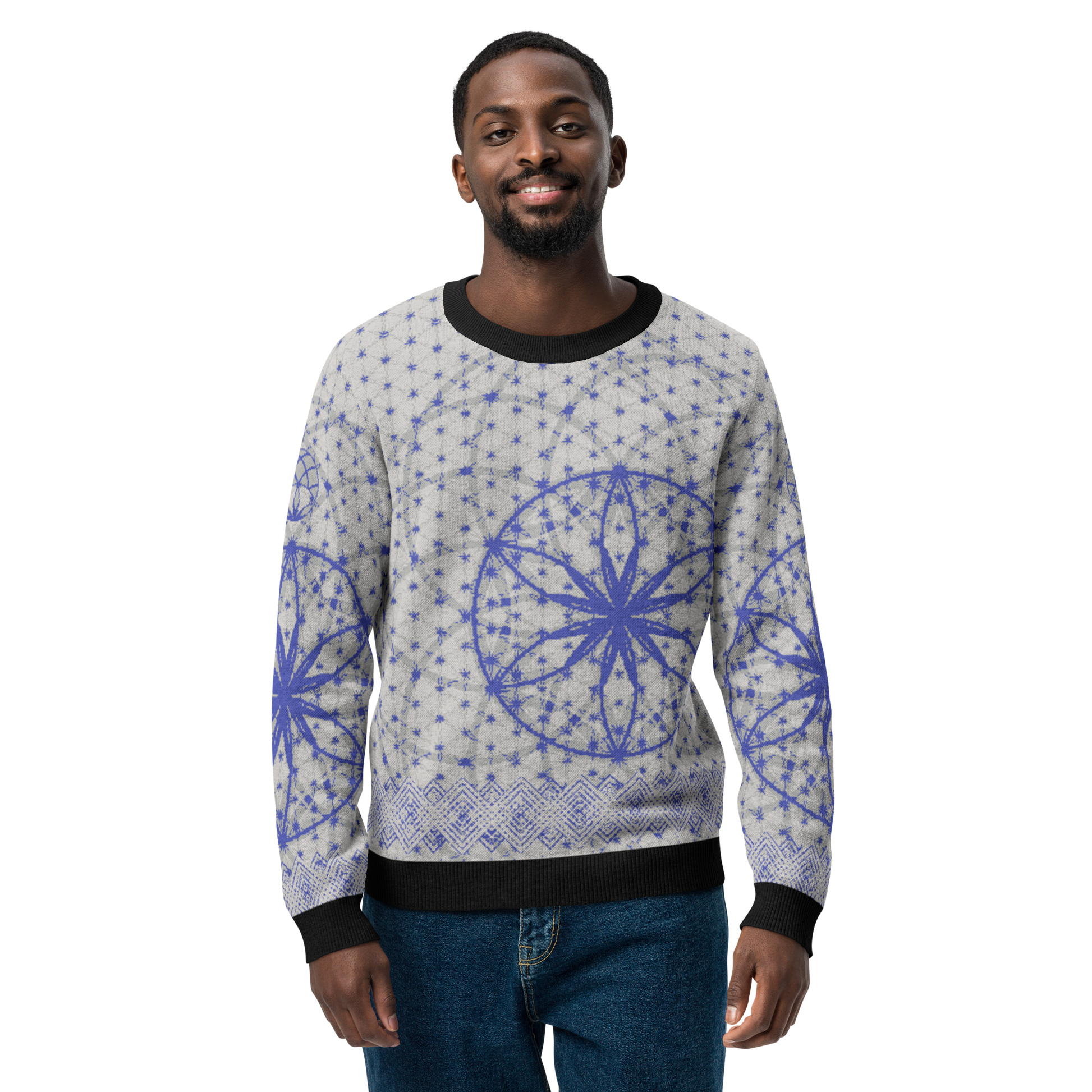 Elevate your wardrobe with the Blue Prima Mystica | Knitted Crew Neck Sweater. Crafted via Knit-On-Demand technology, this piece blends visionary design with advanced textile craftsmanship. A radiant blue tapestry unfolds across the knit, rooted in sacred geometry and modern streetwear aesthetics.