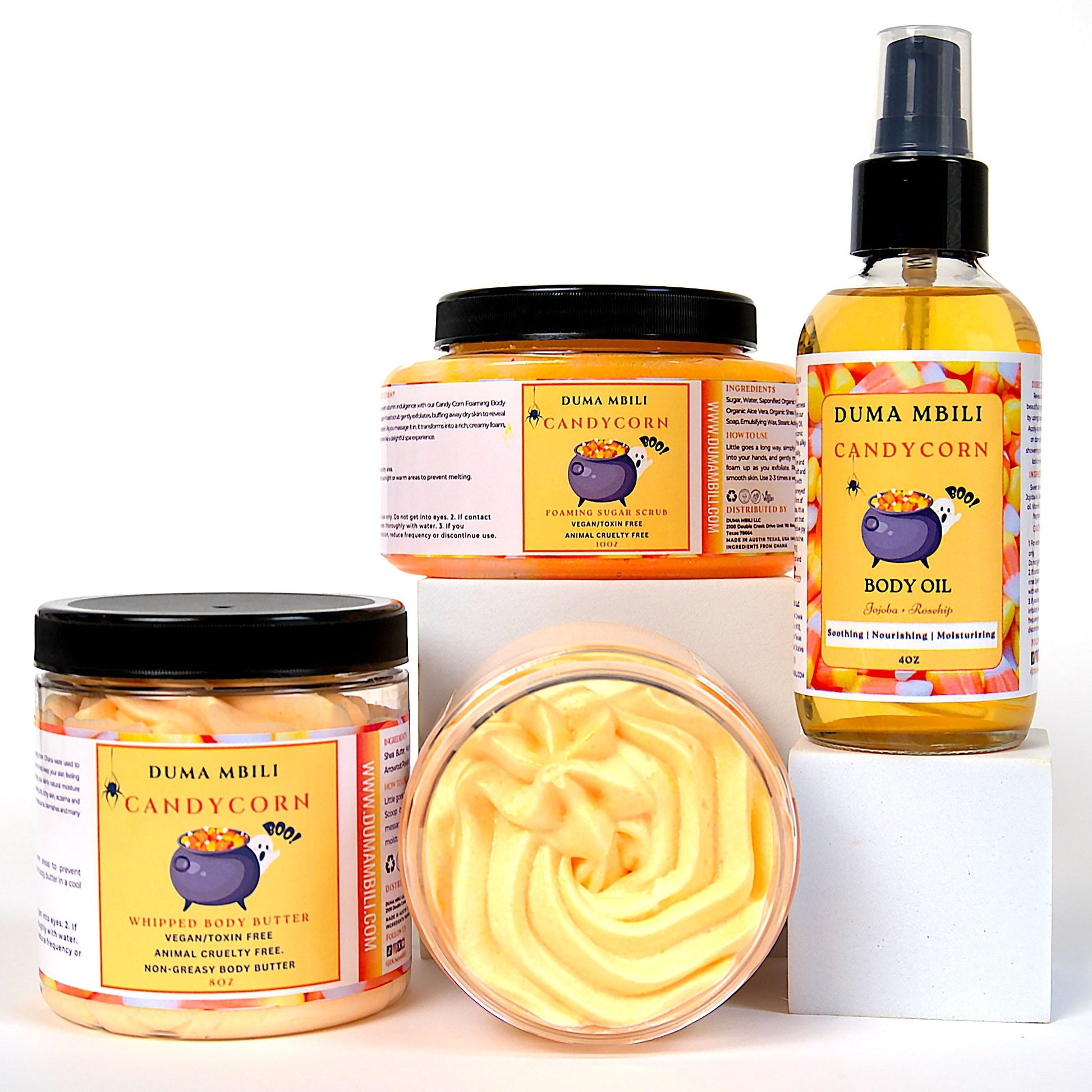 Satisfy your sweet tooth with our Candy Corn Bundle, a playful trio that brings the nostalgic fun of Halloween to your skincare routine. Infused with the delightful, sugary scent of candy corn, this bundle includes our Body Oil, Body Butter, and Foaming Sugar Scrub, each crafted to nourish, hydrate, and leave your skin as soft and sweet as your favorite fall treat.