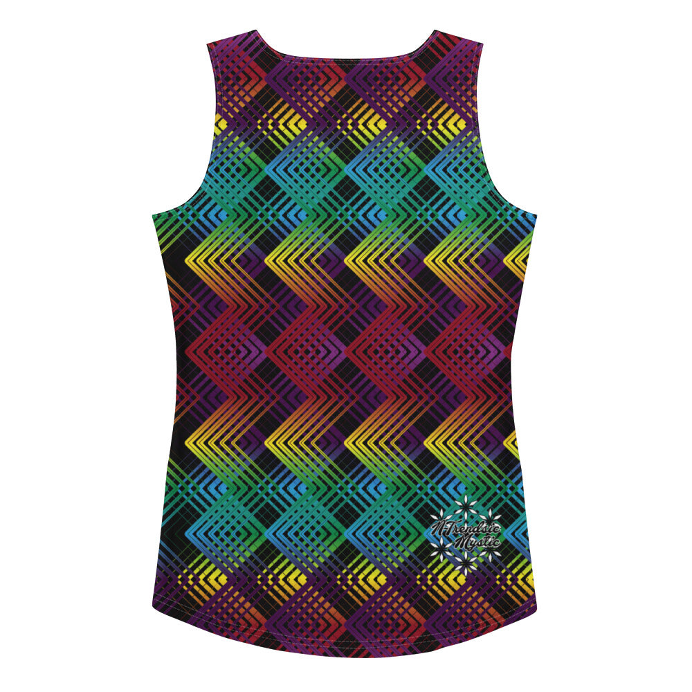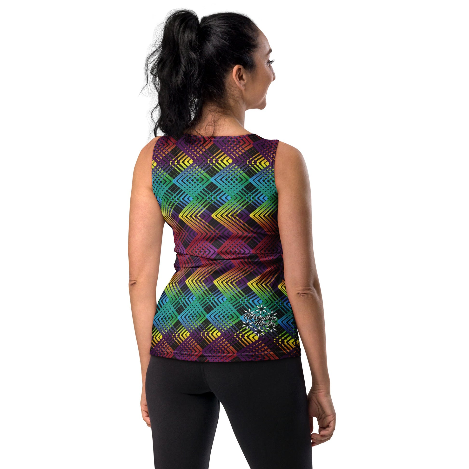 Color in motion, minus the sleeves. The Chakra Zig-Zag tank carries root-to-crown hues in a kinetic lightning line—cool, breathable, and made to move from yoga mat to rooftop set.