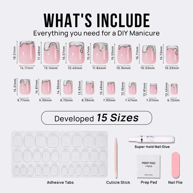 - Includes 32 tip nails, nail glue, nail file, alcohol pad, adhesive tabs,and nail removing/cuticle pusher tool