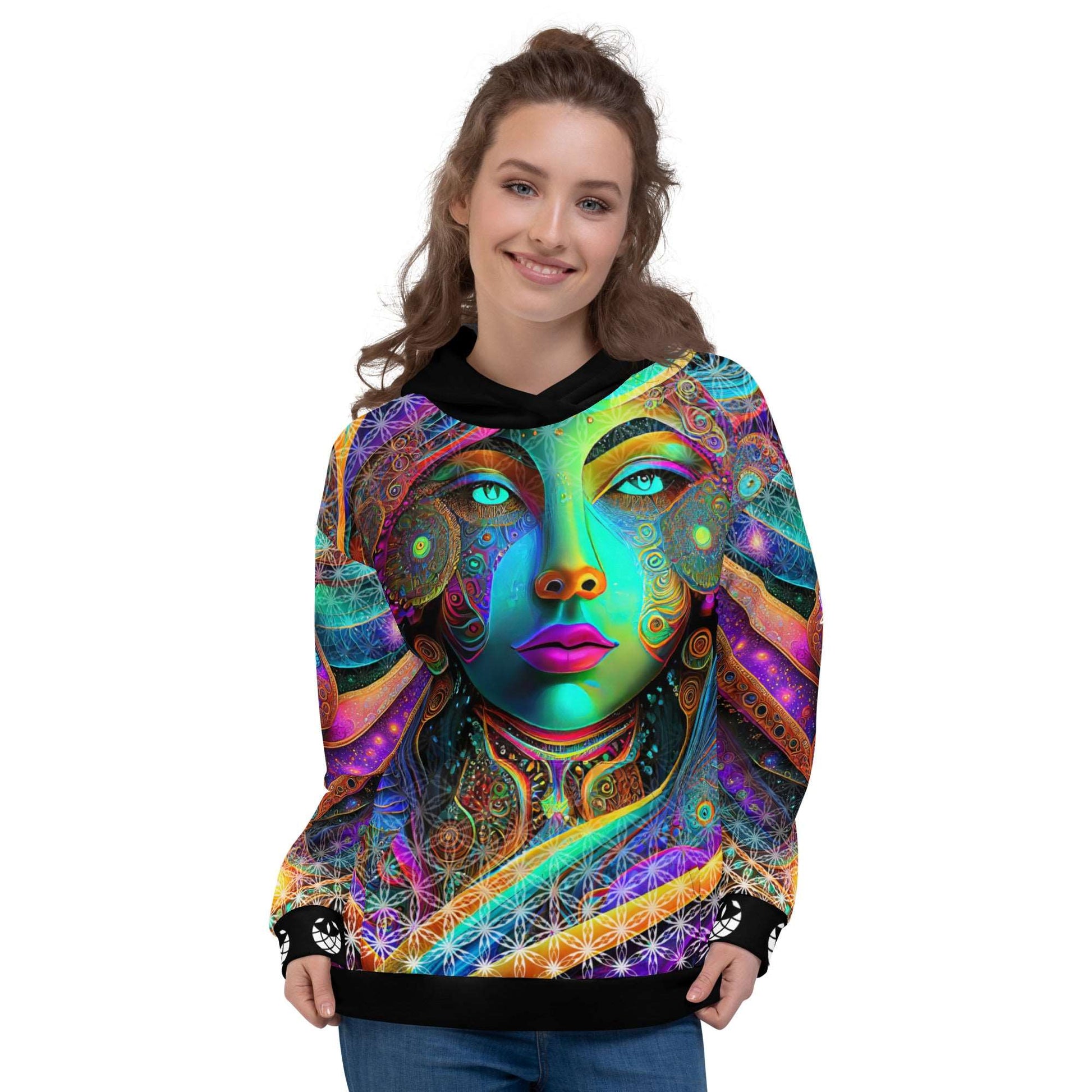 Layer over dark denim, joggers, or festival fits. Whether on a winter street or a summer night at a gathering, this hoodie’s vibrant energy draws eyes and sparks conversation.