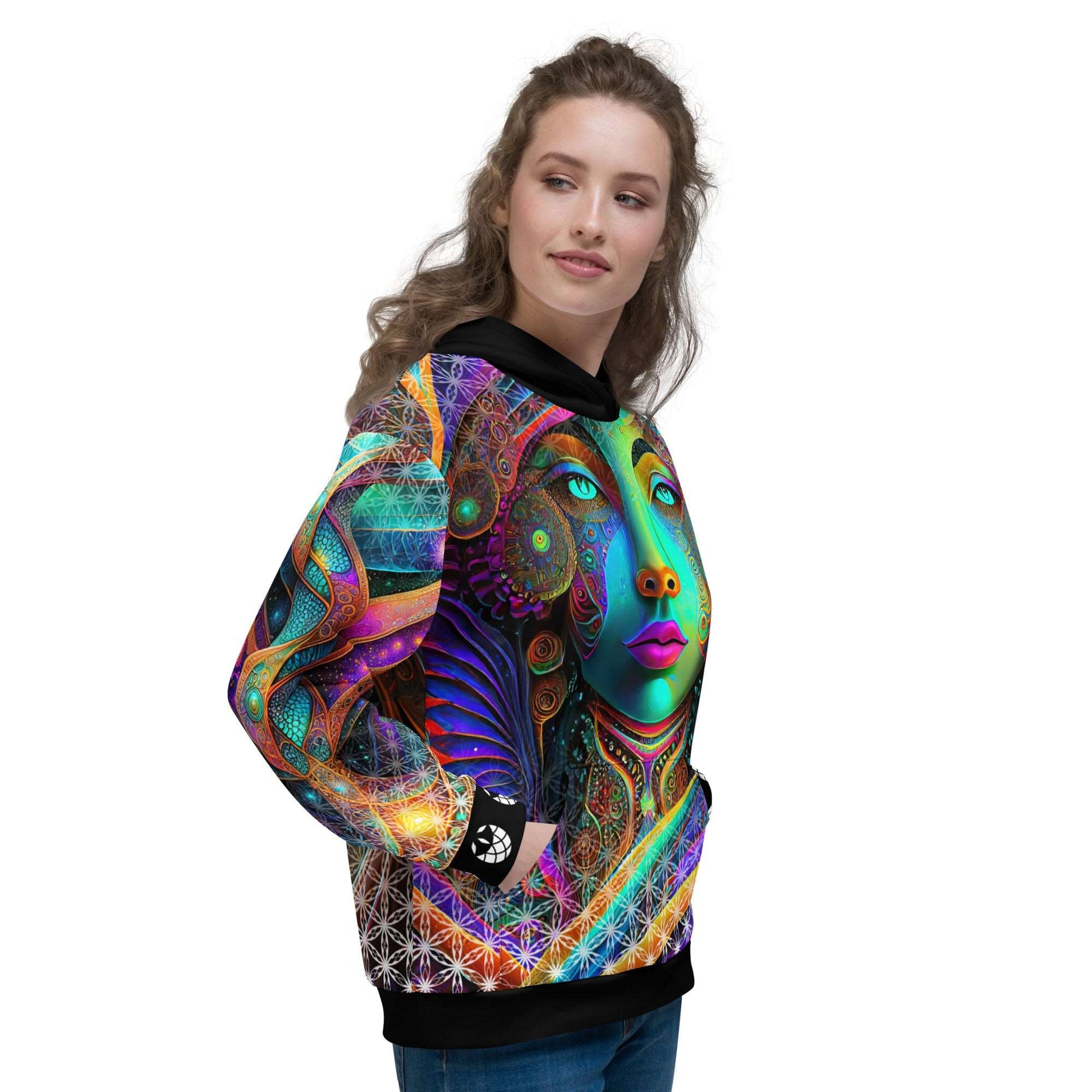 Activate your strands. The Cosmic DNA Restoration hoodie radiates with color, geometry, and archetypal symbolism. The front features a luminous goddess-like face, alive with mandala circuitry and rainbow fractals. The back reveals cosmic wings unfurled, embodying restoration, ascension, and infinite potential.