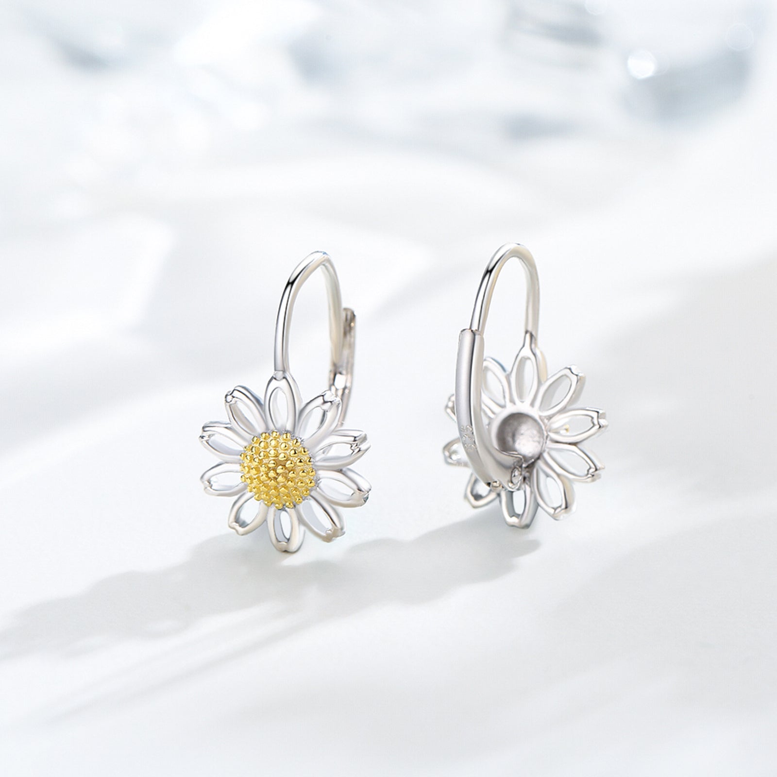 Daisy Leverback Hoop Earrings in White Gold Plated Sterling Silver