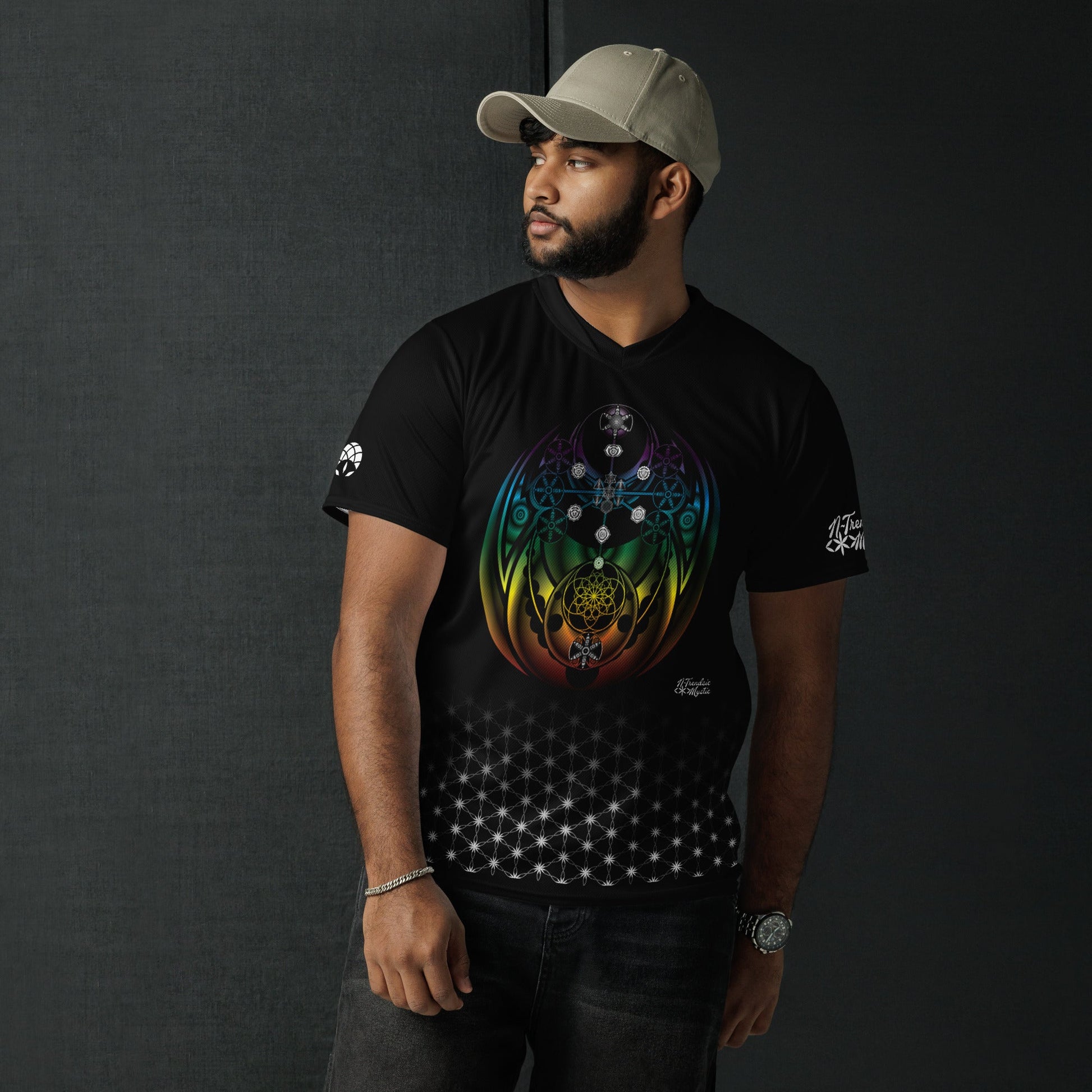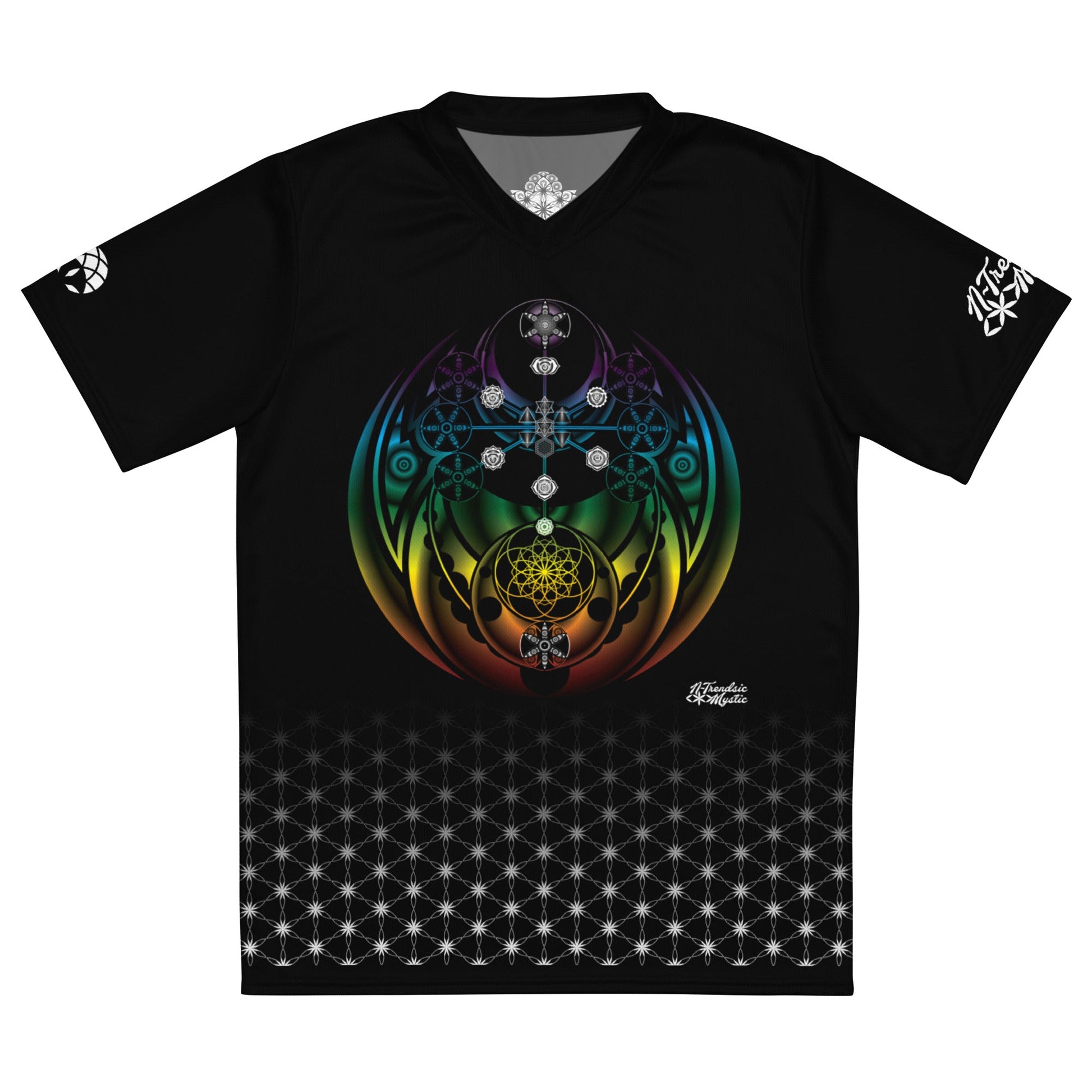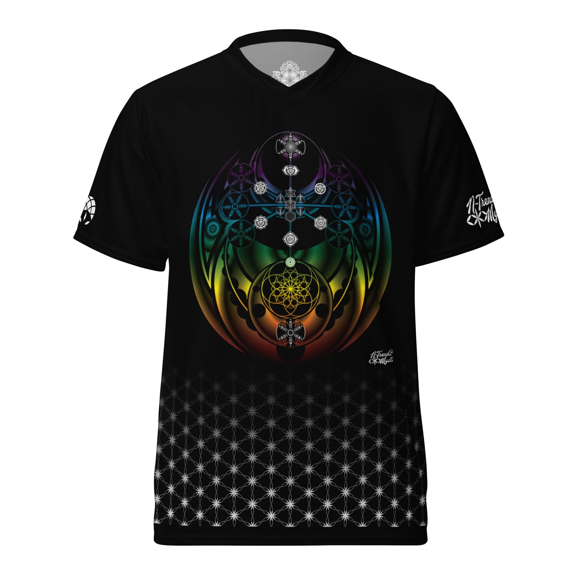 The GeoSpectrum | Recycled Unisex Sports Jersey merges athletic performance with sacred geometry aesthetics. Featuring a radiant multi-spectrum design layered over geometric symmetry, this jersey radiates energy on and off the field. Made from recycled polyester, it’s a mindful choice for eco-conscious athletes and style seekers alike.