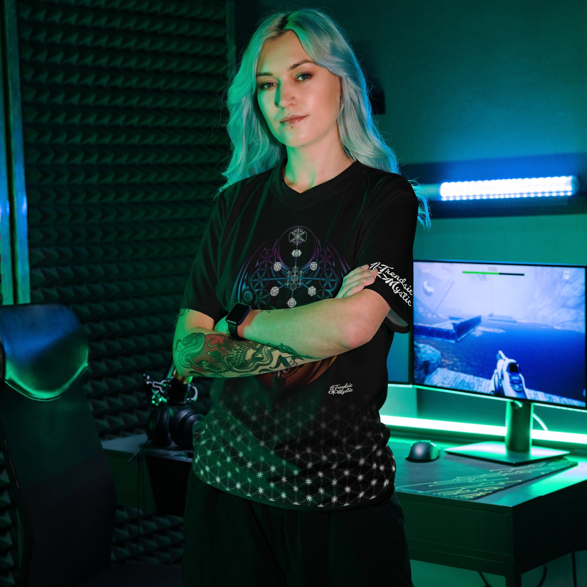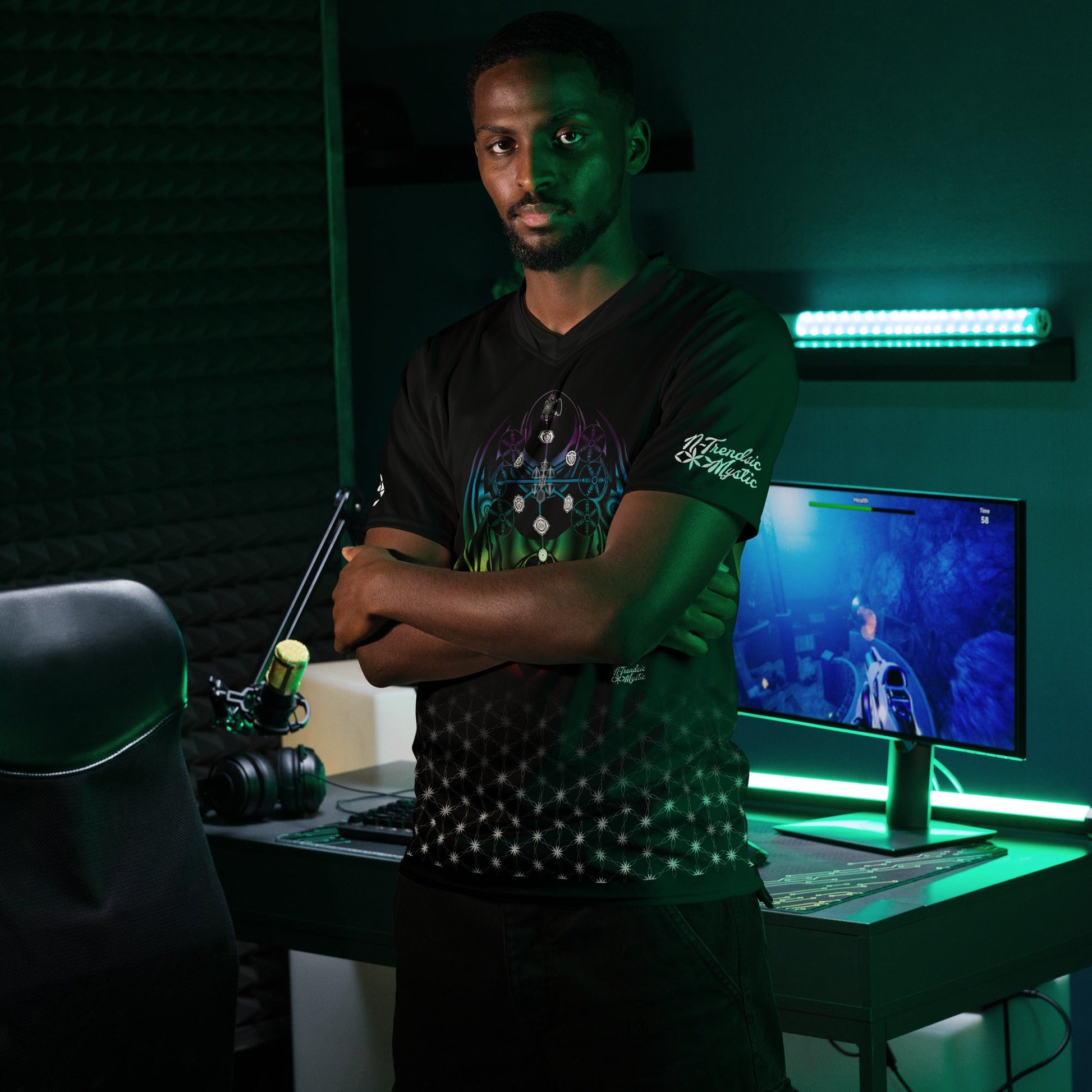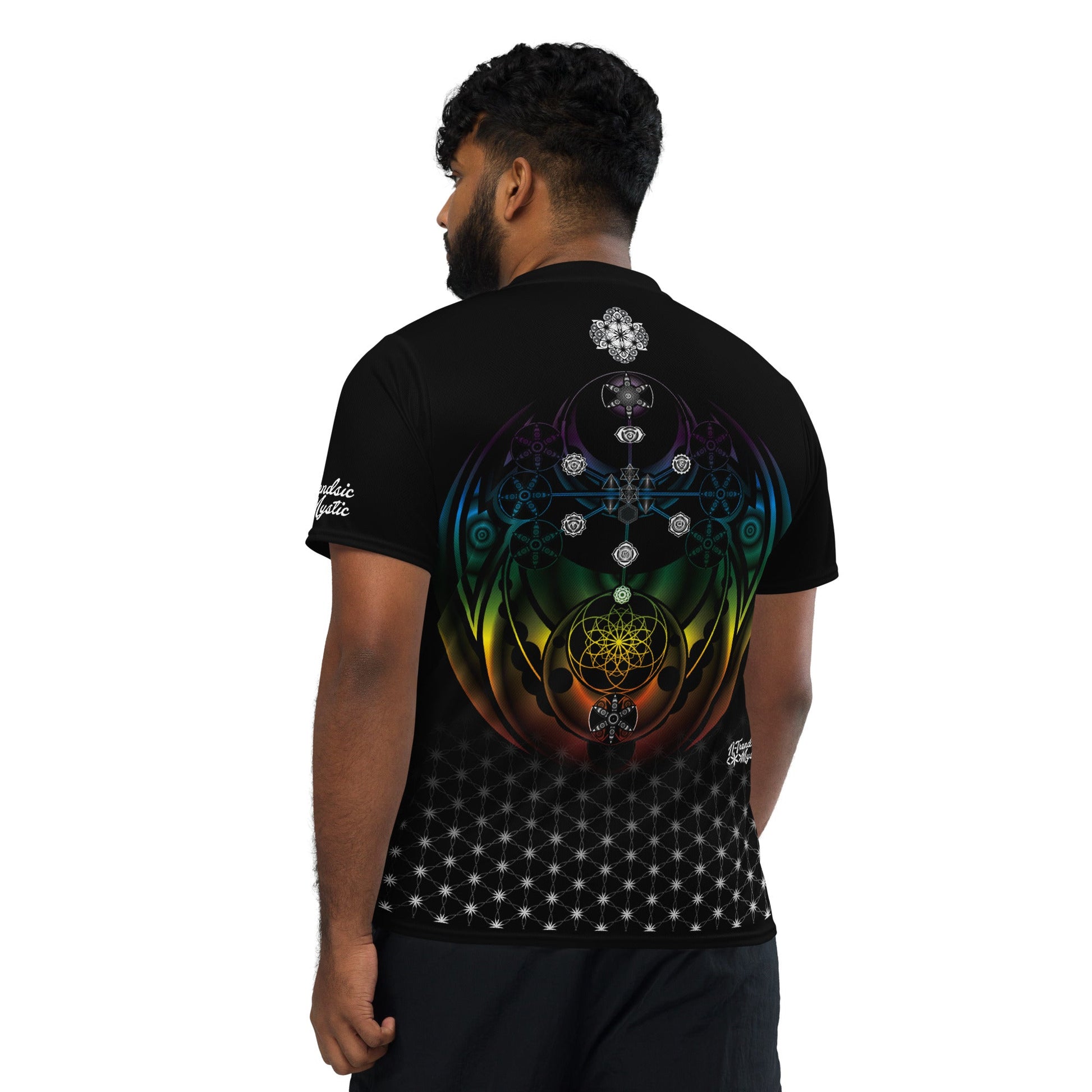 The GeoSpectrum | Recycled Unisex Sports Jersey merges athletic performance with sacred geometry aesthetics. Featuring a radiant multi-spectrum design layered over geometric symmetry, this jersey radiates energy on and off the field. Made from recycled polyester, it’s a mindful choice for eco-conscious athletes and style seekers alike.