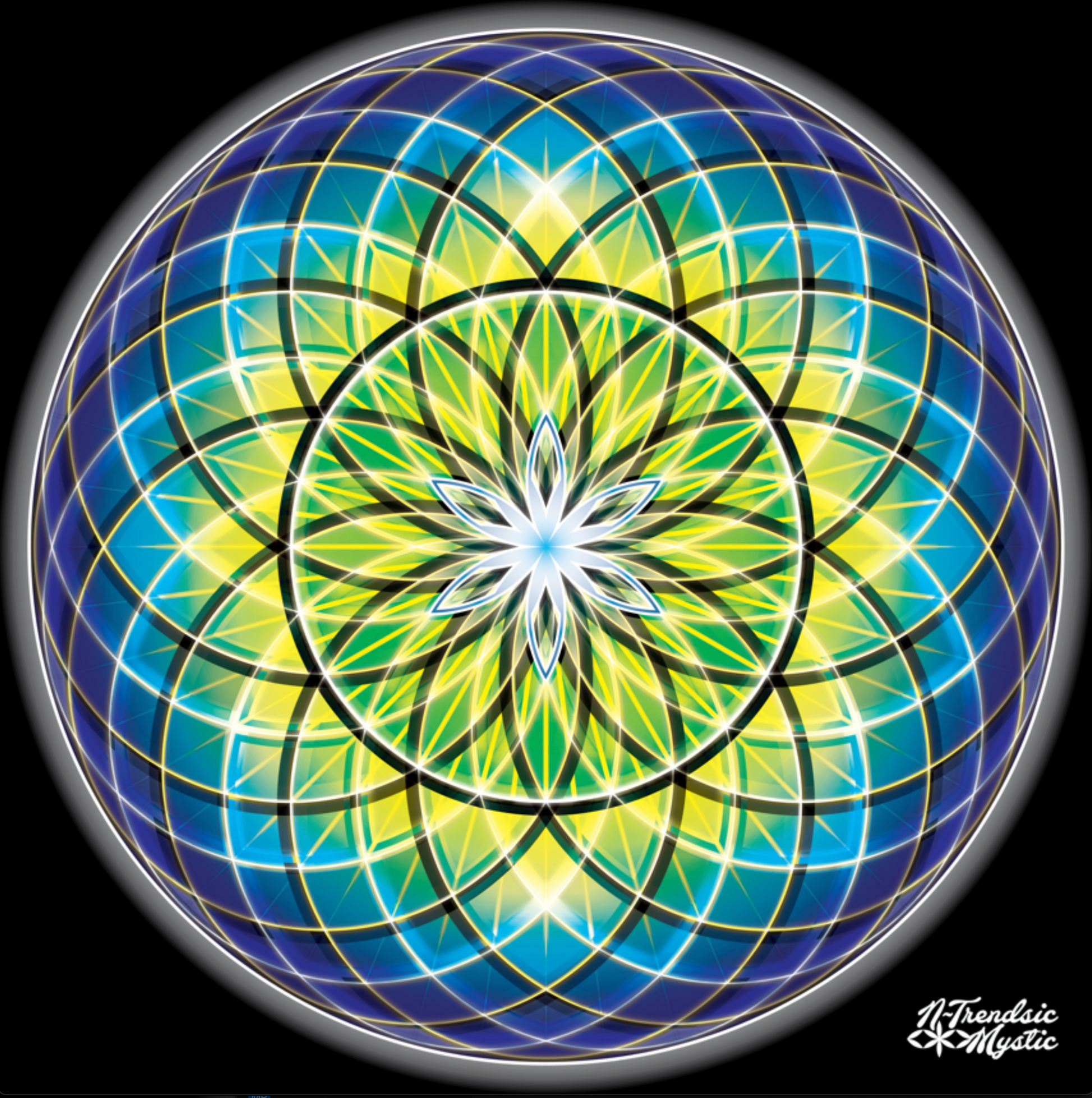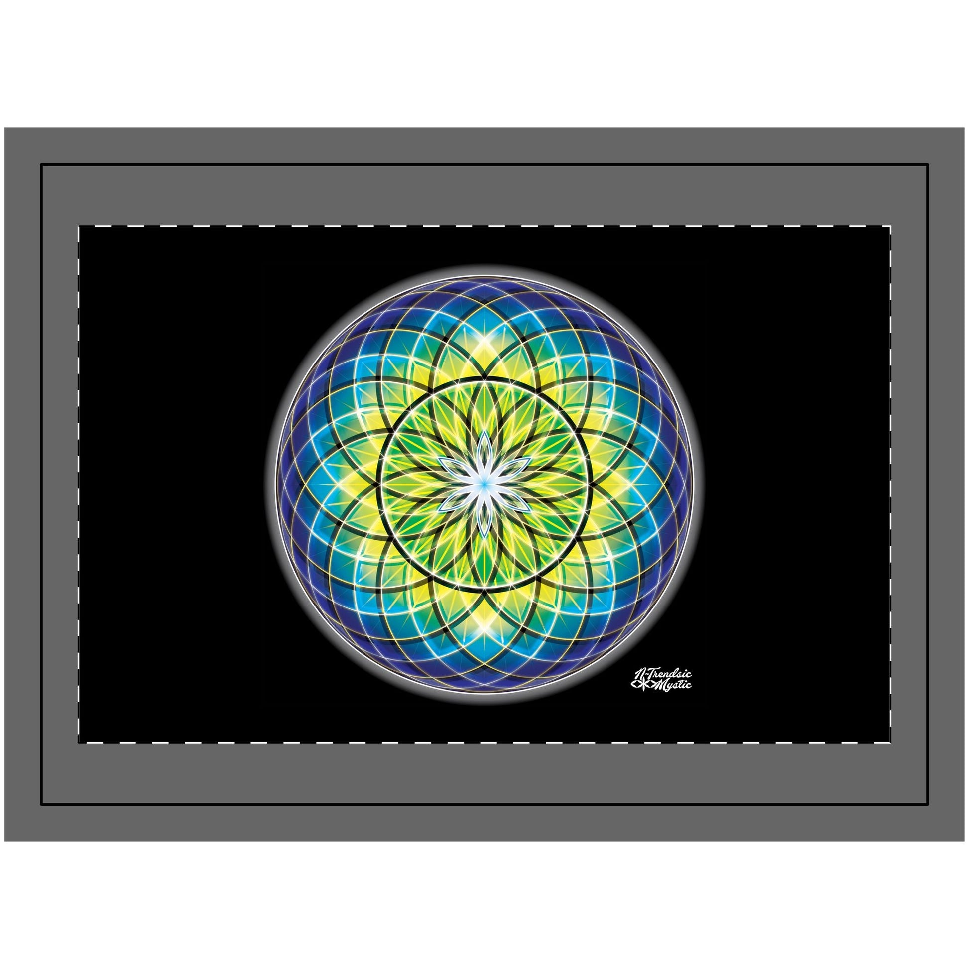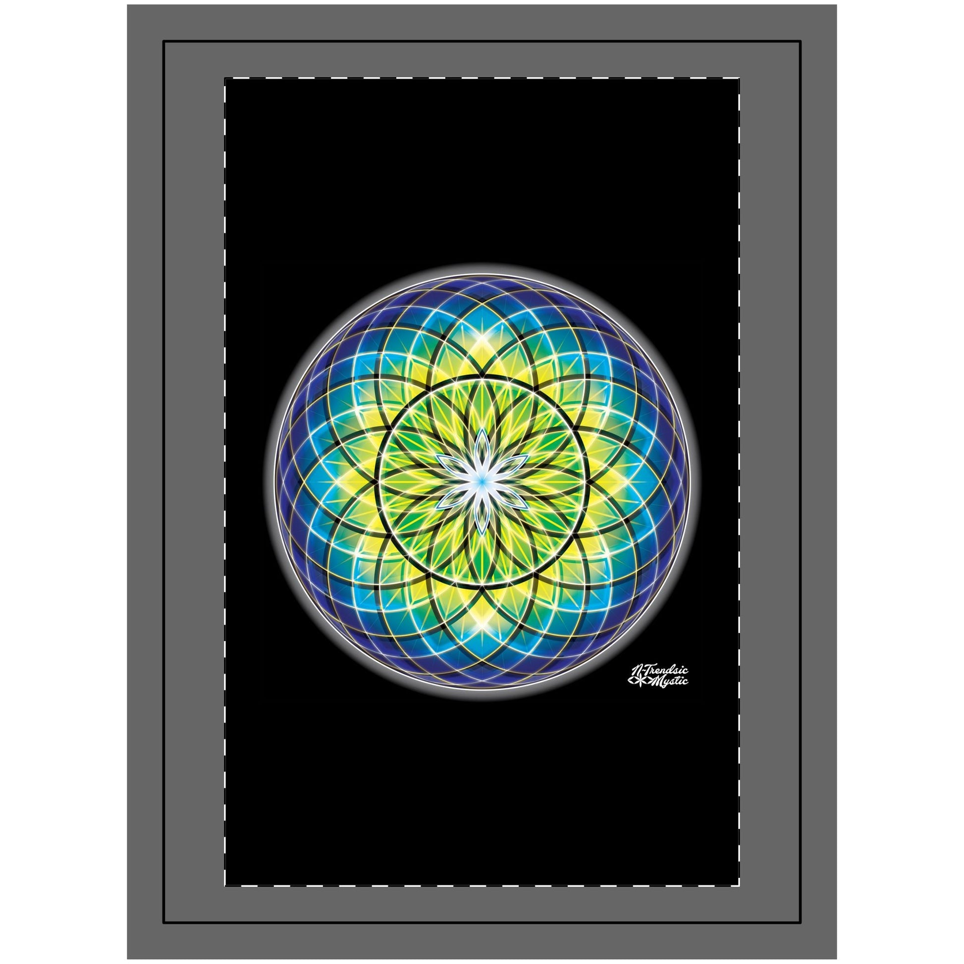 This Wood Topped Mandala Wall Tapestry is a quantum mirror of light and mind—born through action, good Will, and luminous intention. Wrapped in radiant grids of blue, gold, and green, a central golden burst illuminates the heart of the design. At its core, a six-petaled bloom rises outward like the first breath of creation, echoing the Hermetic axiom: “As above, so below. As within, so without.”