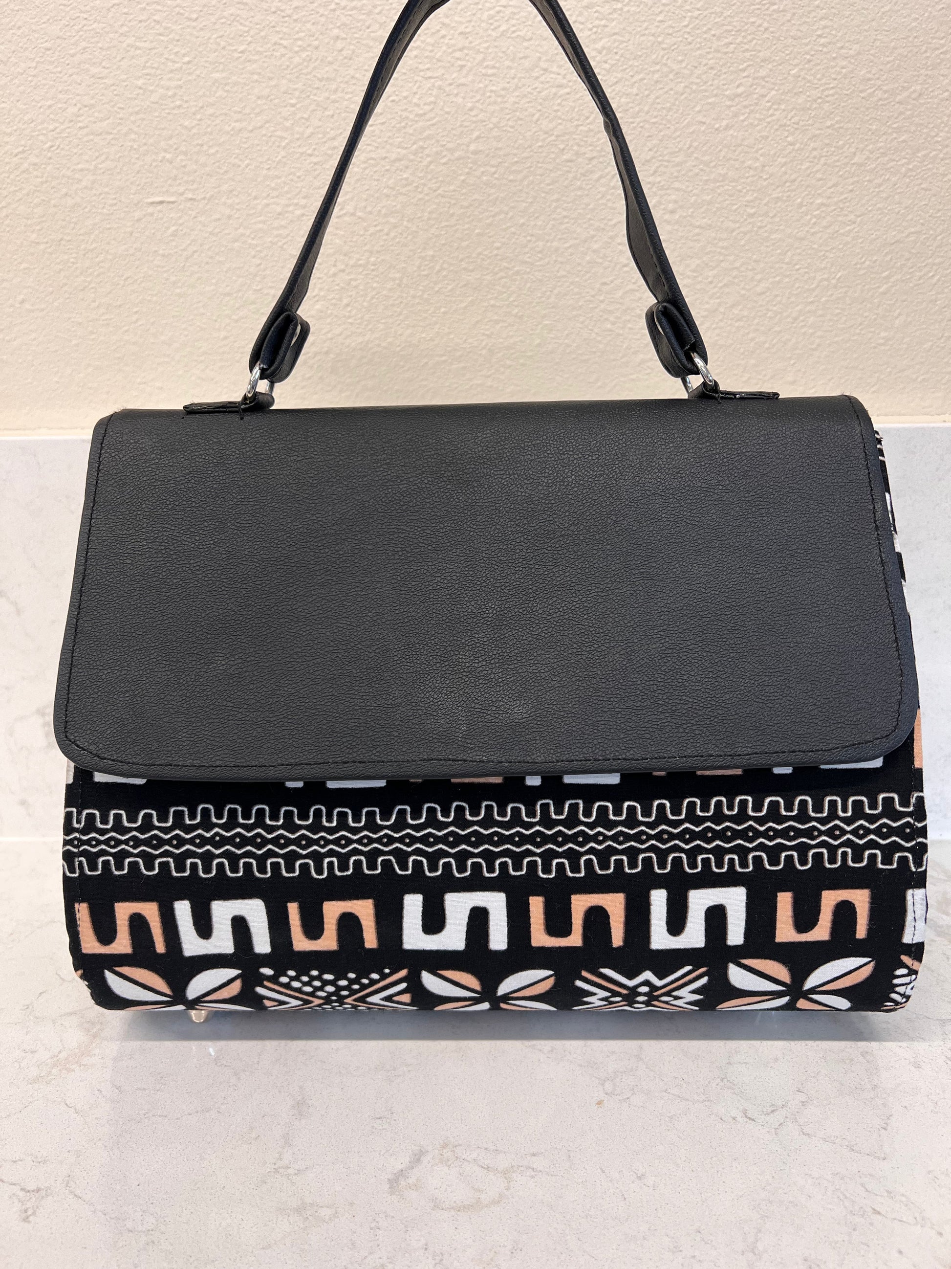 Stylish and elegant, Our Hananie Mud Print Handbag adds an authentically African accent to any ensemble. The hand bag is rectangular with a flap that goes over the top and fastens in front and one handle. It also comes with a strap. It is black and features a distinctive black and white mud print pattern. The body of the purse is fabric with a leather handle and strap. The bag is 6” deep at the base. It is 12” wide and 9” tall. Handle measures 14". Made in Ghana