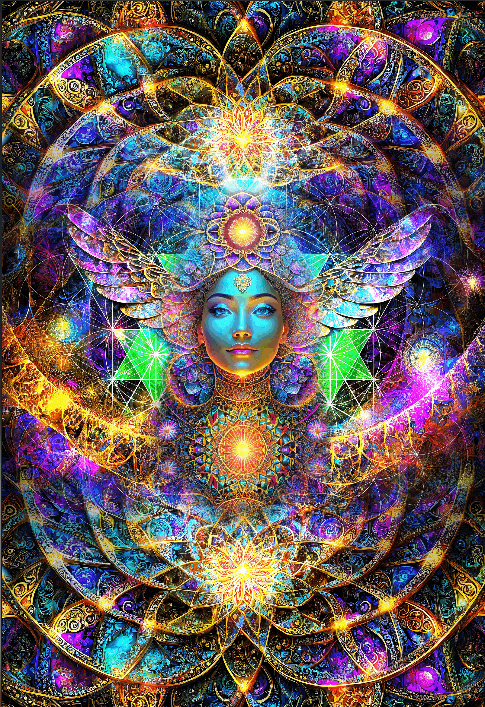 Transmission: The central figure represents the divine healer - harmonizing energies and radiating light into every dimension. Paired with the Flower of Life pattern, it speaks of unity, creation, and eternal renewal.