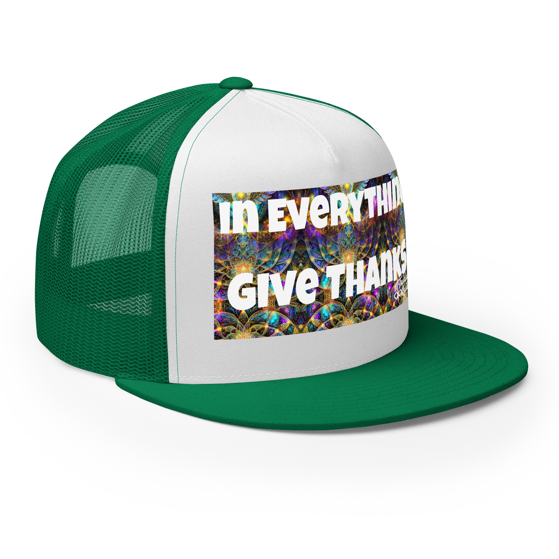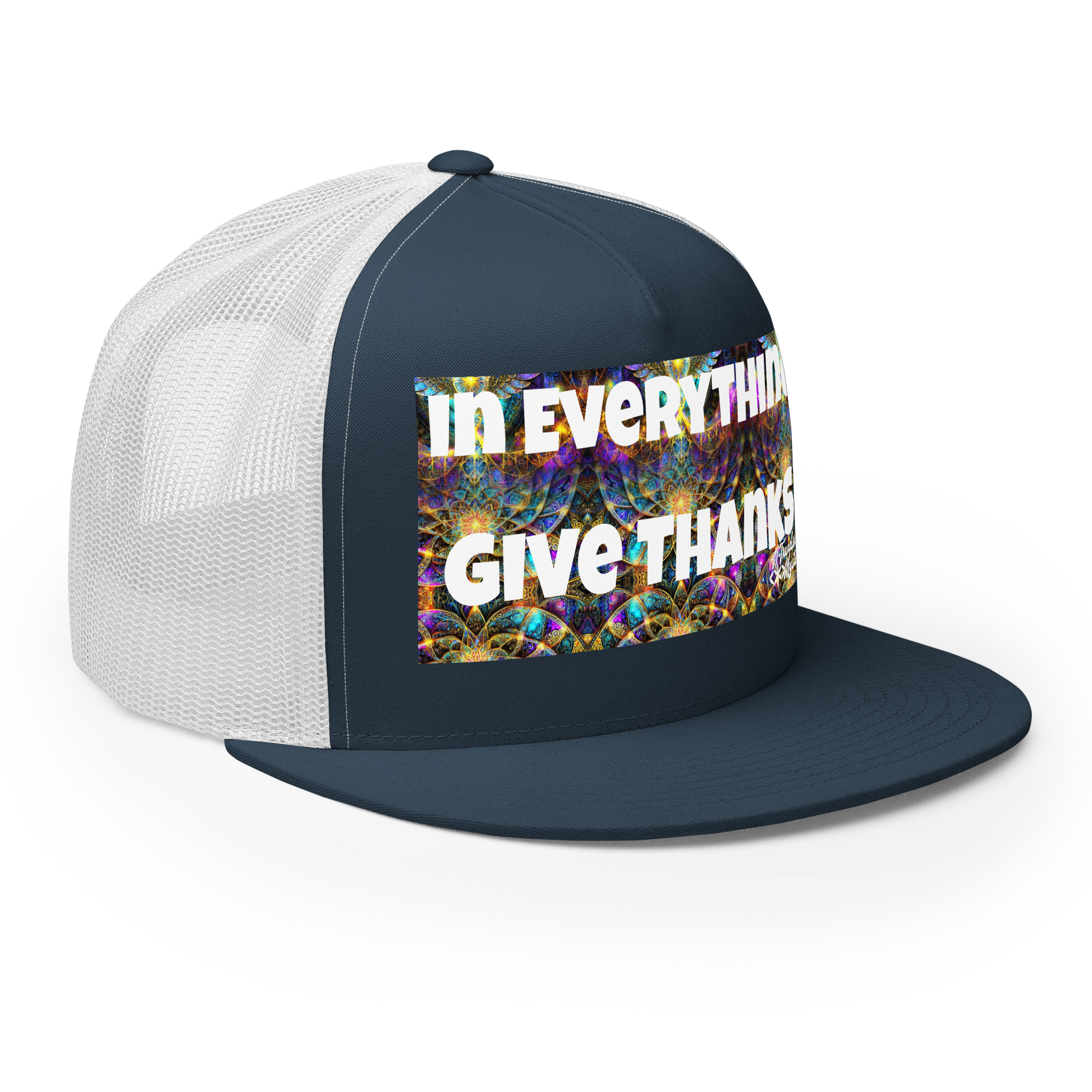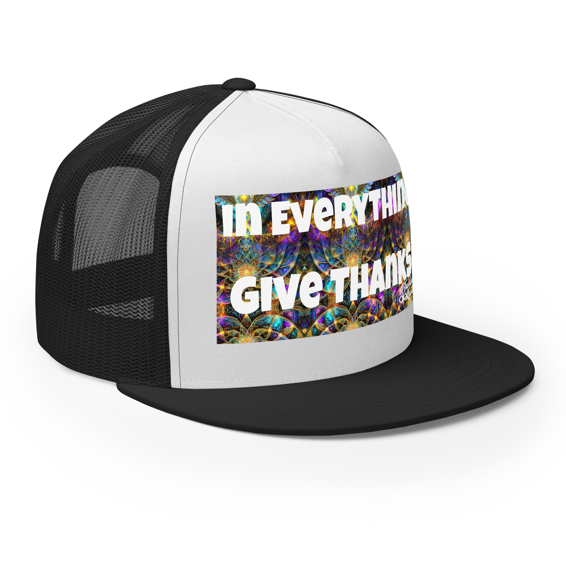 Carry gratitude wherever you go with the In Everything Give Thanks | Trucker Cap. Featuring a vivid kaleidoscopic backdrop layered with bold white lettering, this hat is a wearable reminder to embrace life with appreciation. Designed for comfort and style, it’s perfect for festivals, casual days, or as a meaningful gift.