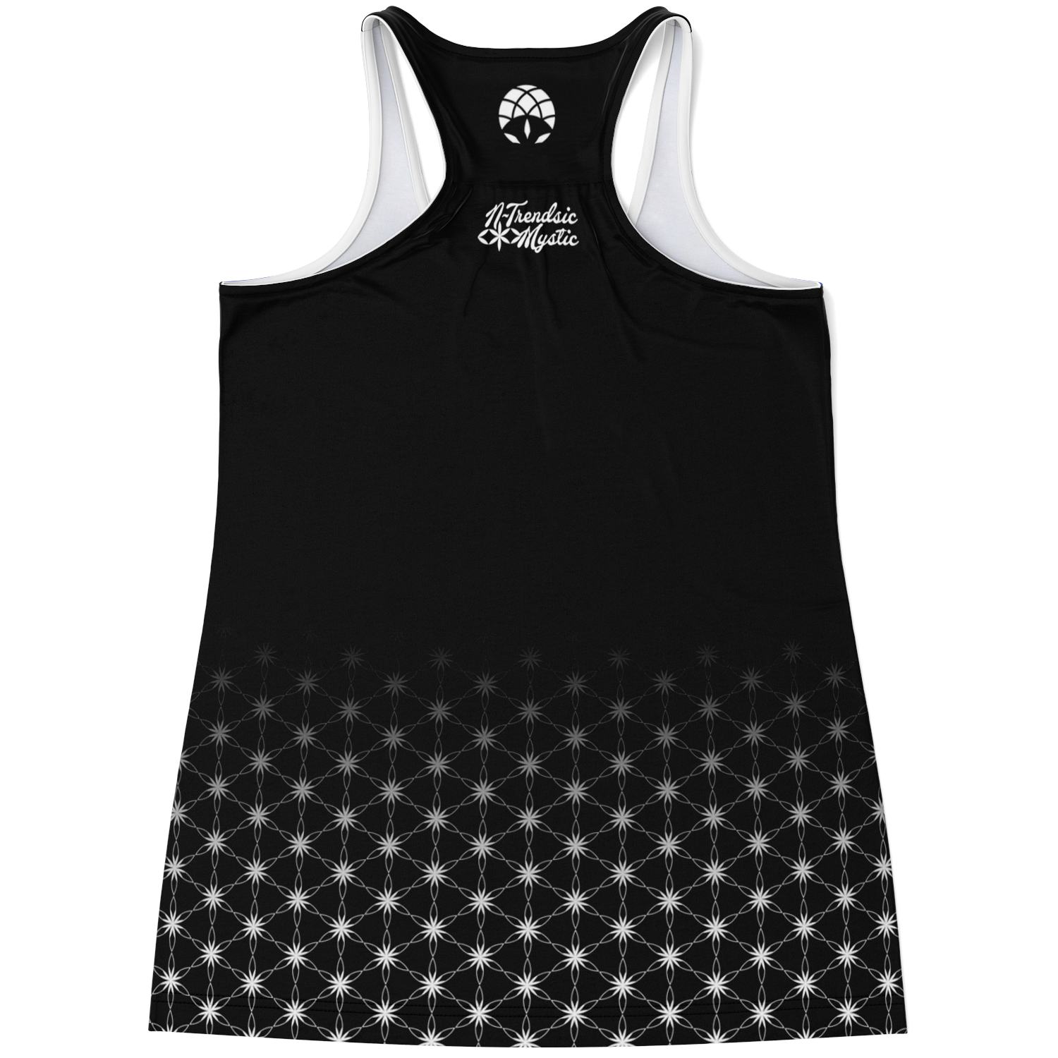 The front radiates a luminous mandala at the heart center, surrounded by interwoven sacred patterns that cascade into a Flower of Life gradient at the hem. The racerback cut flows naturally with your movement, while the back features a sleek black finish accented by subtle geometric detail.