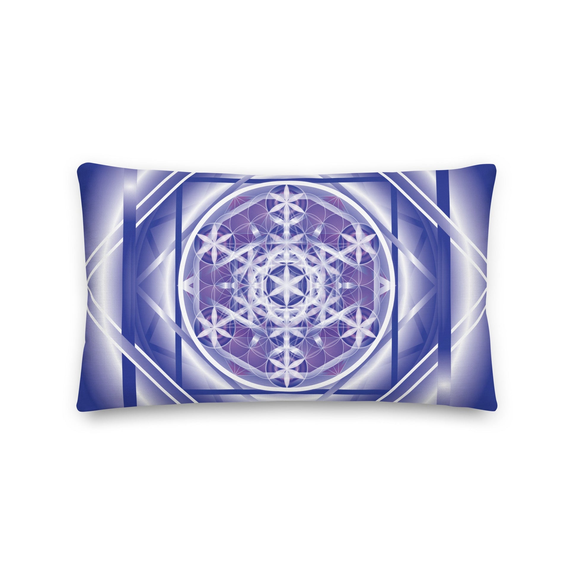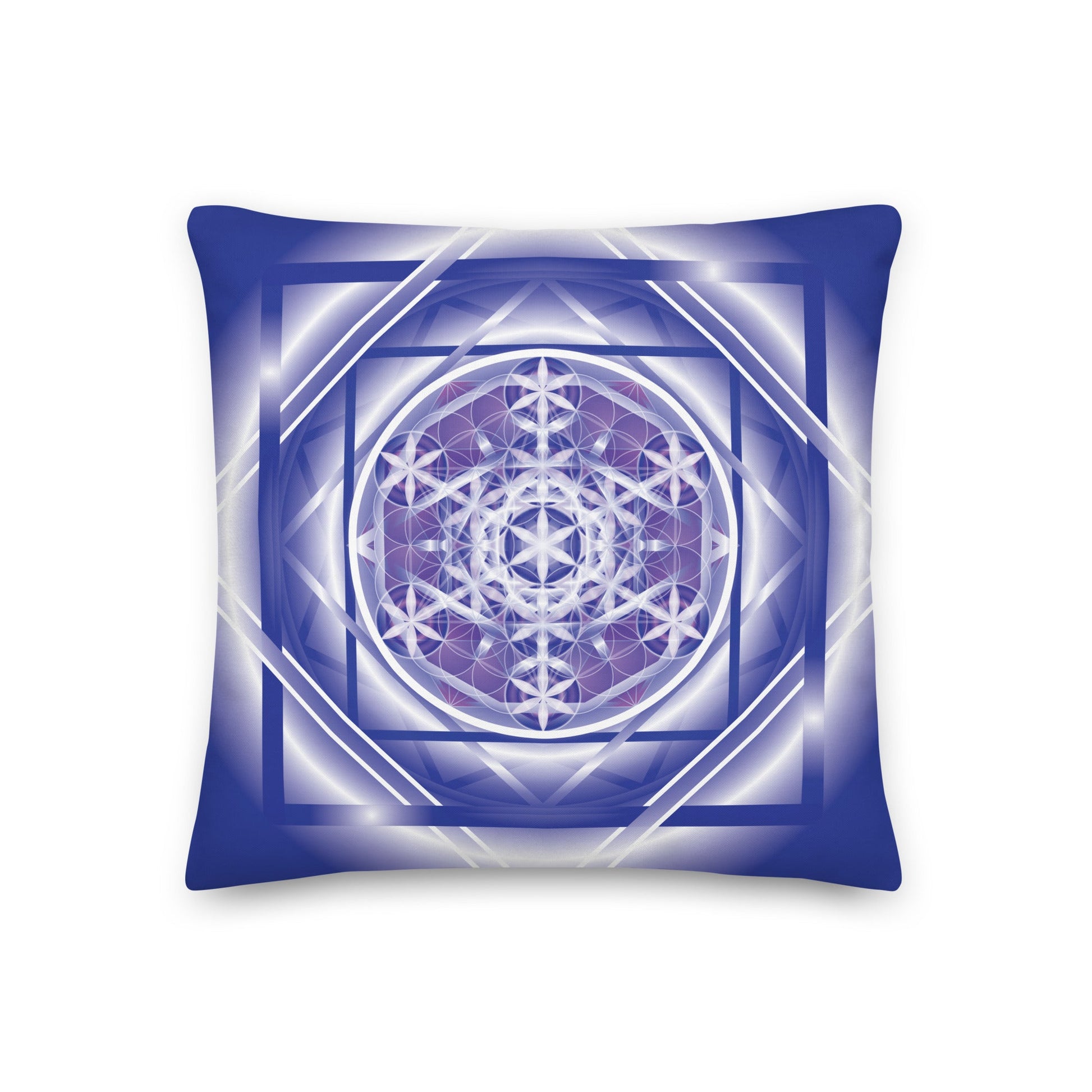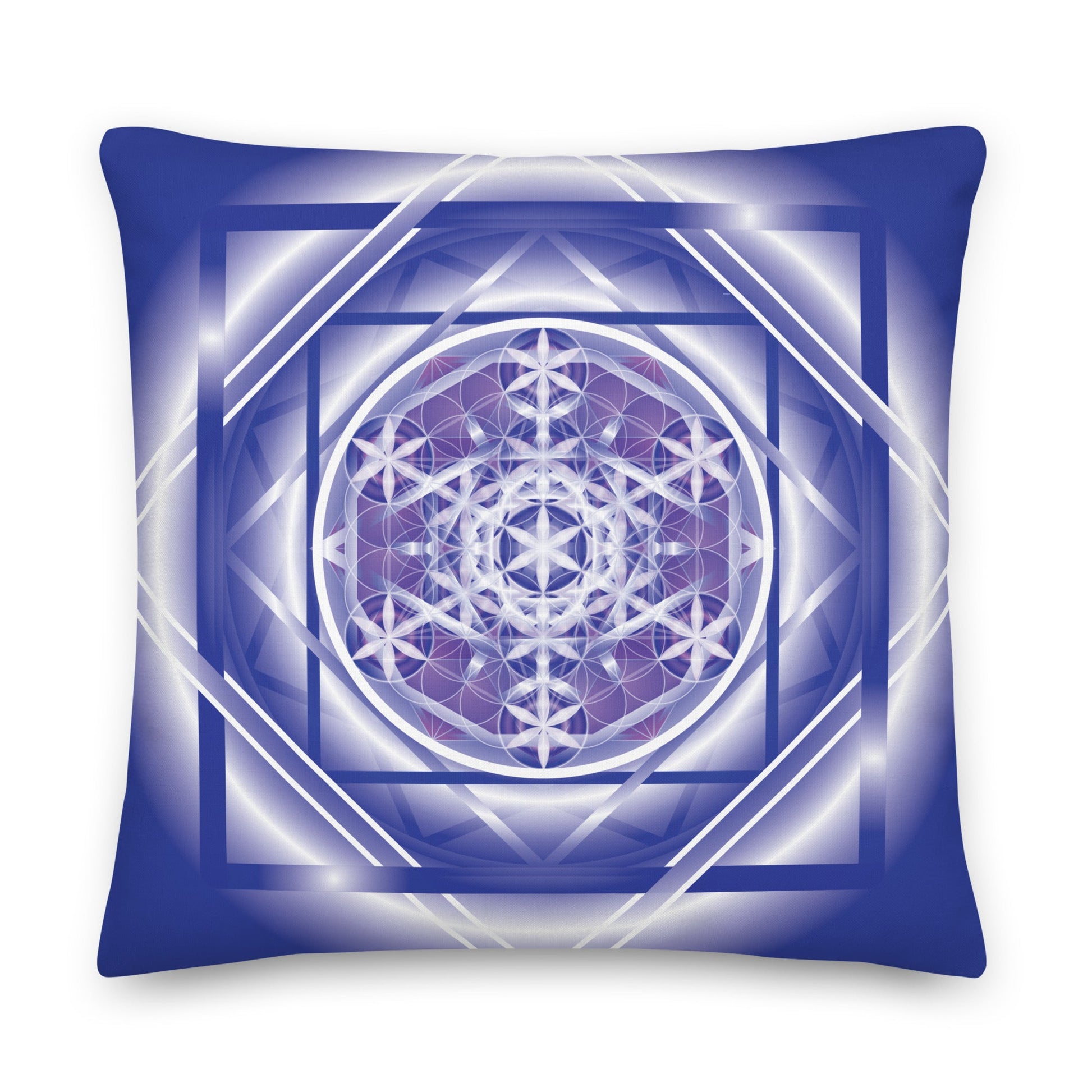 Cool light, quiet focus. The Melchizedek grid glows in layers of indigo and blue—crystalline geometry radiating from the center—turning this premium pillow into a calm, modern accent for sofa, studio, or altar.