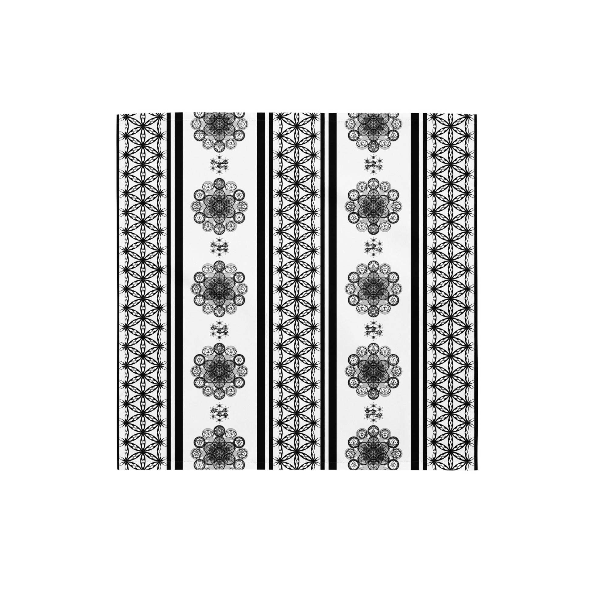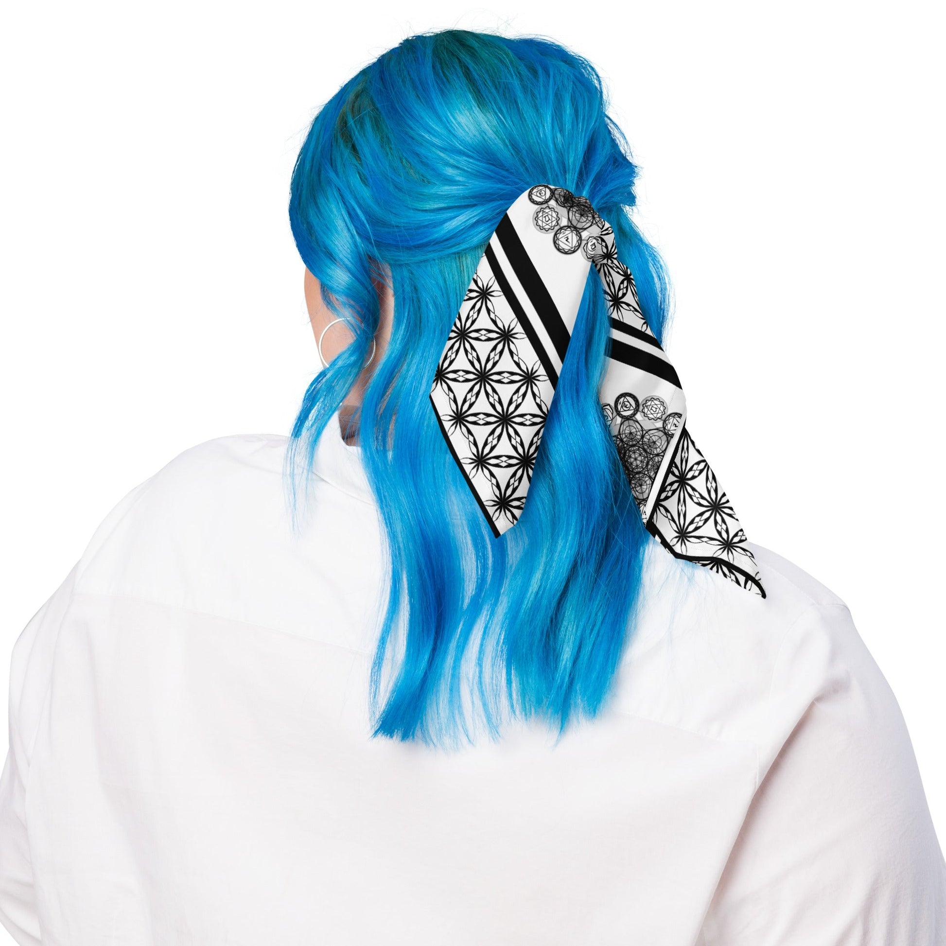 Wearable order. Mystic Alignment runs edge to edge in crisp geometry—a square of calm you can fold, tie, frame, or lay beneath your tools.