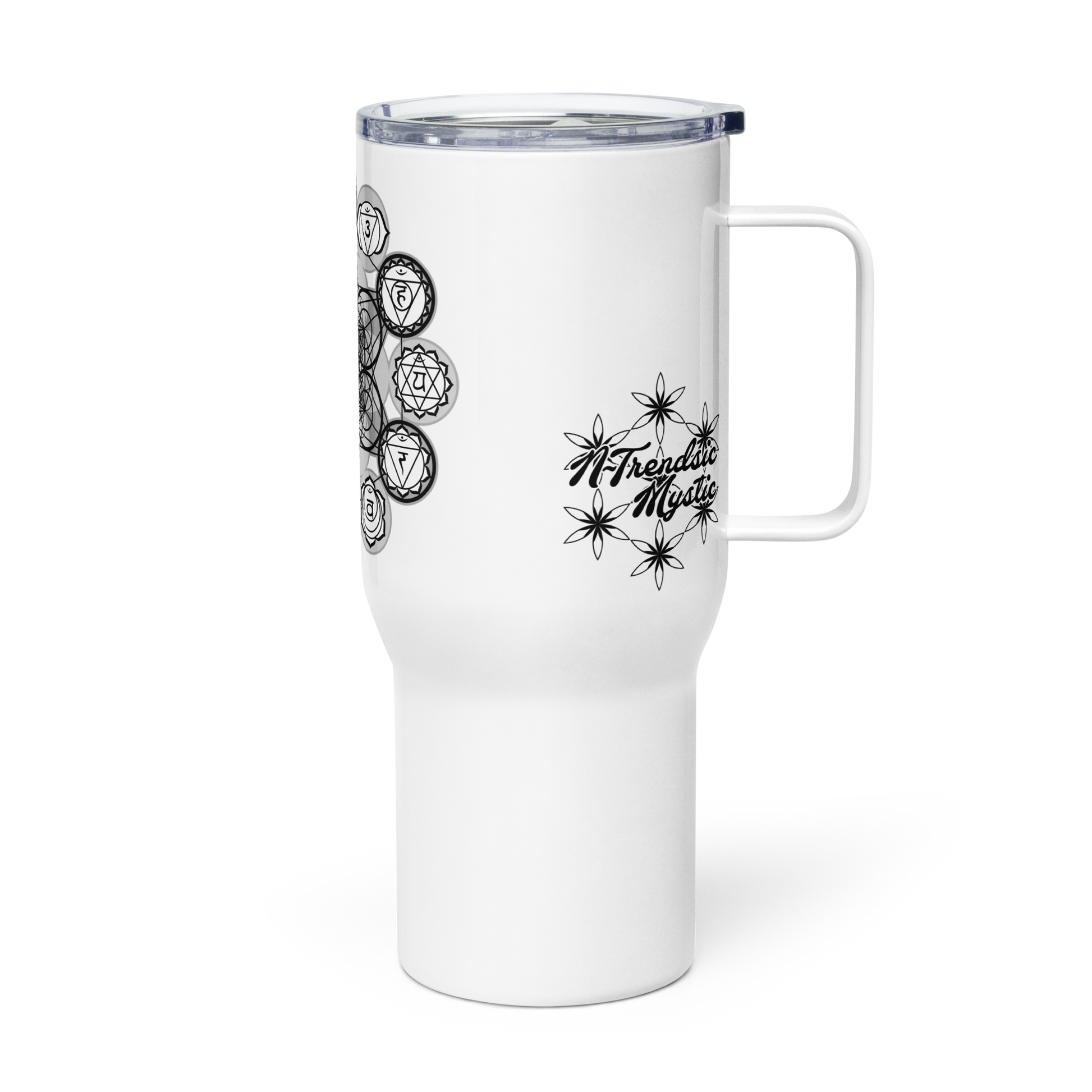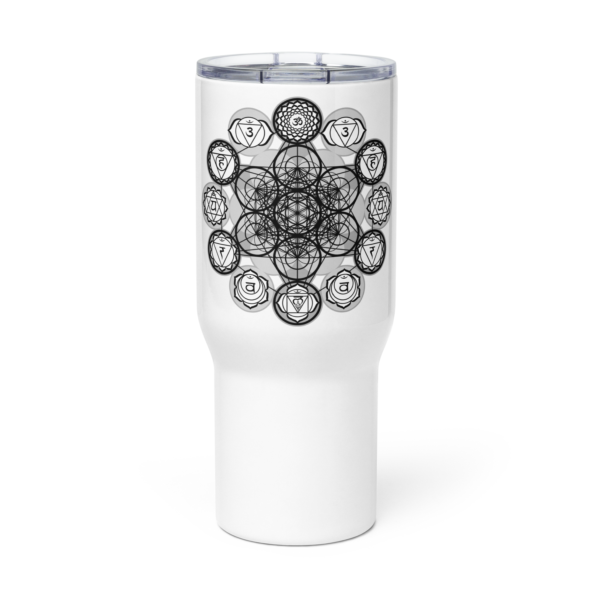 Clarity to go. Mystic Alignment wraps this handled travel mug in crystalline geometry.- your steady companion for sunrise coffee, studio sprints, market runs, and late edits.
