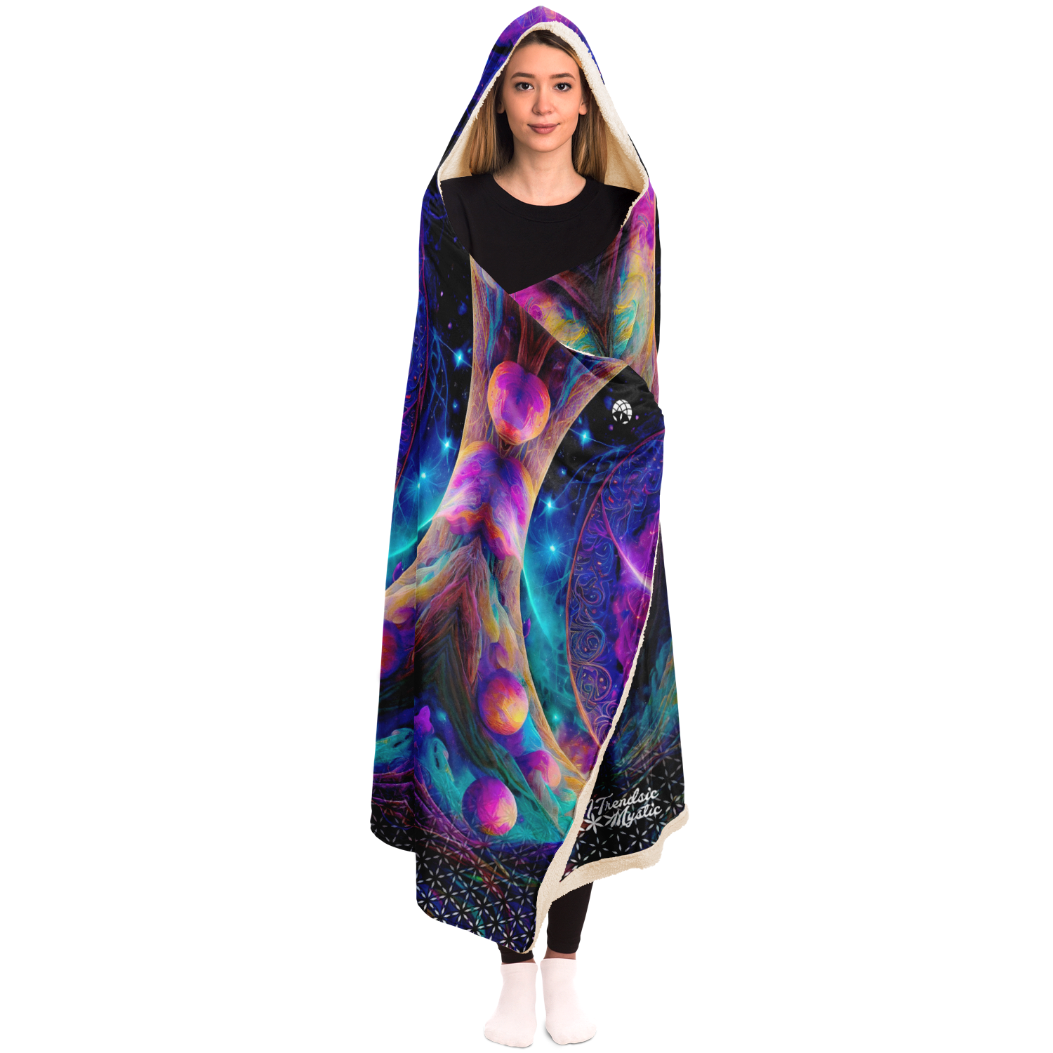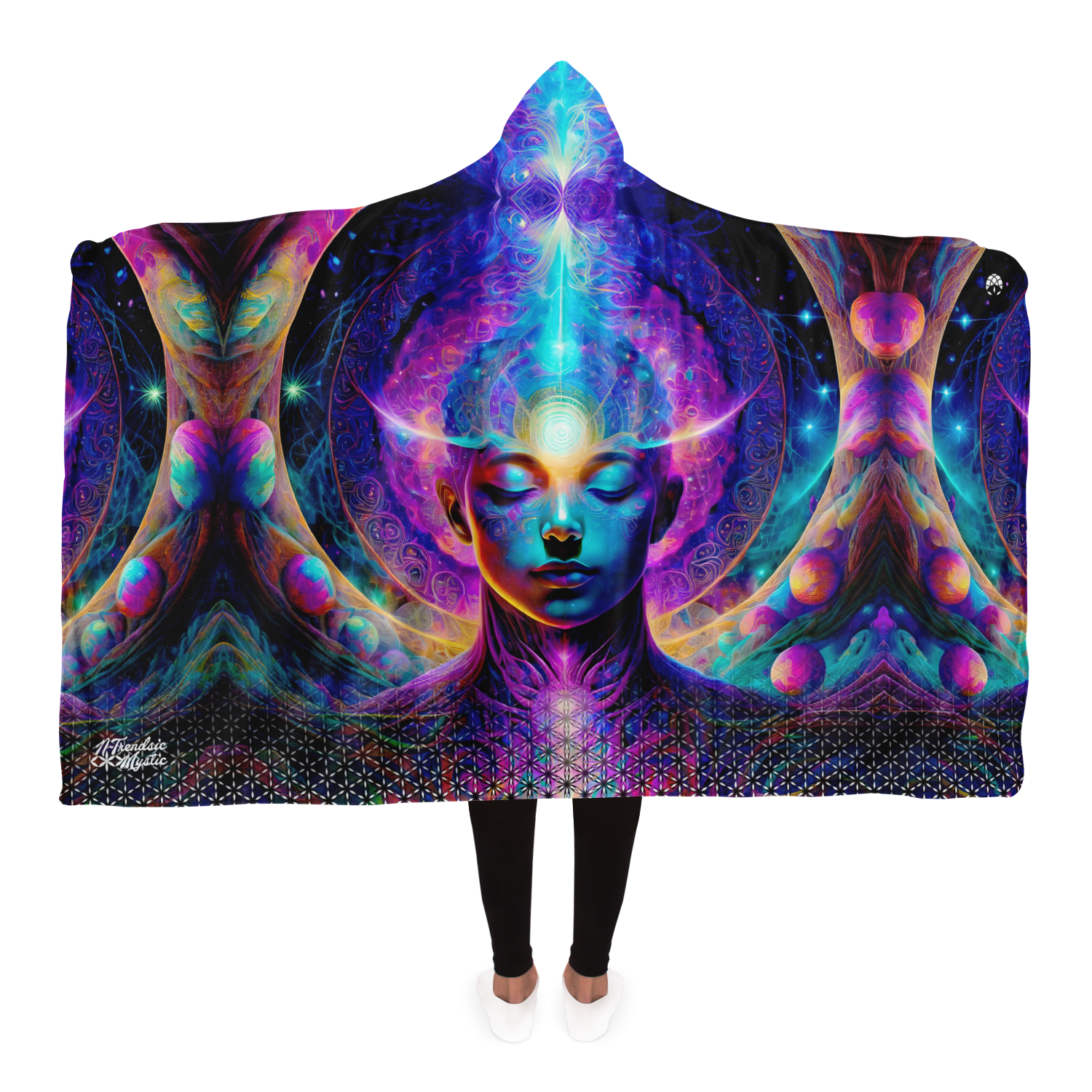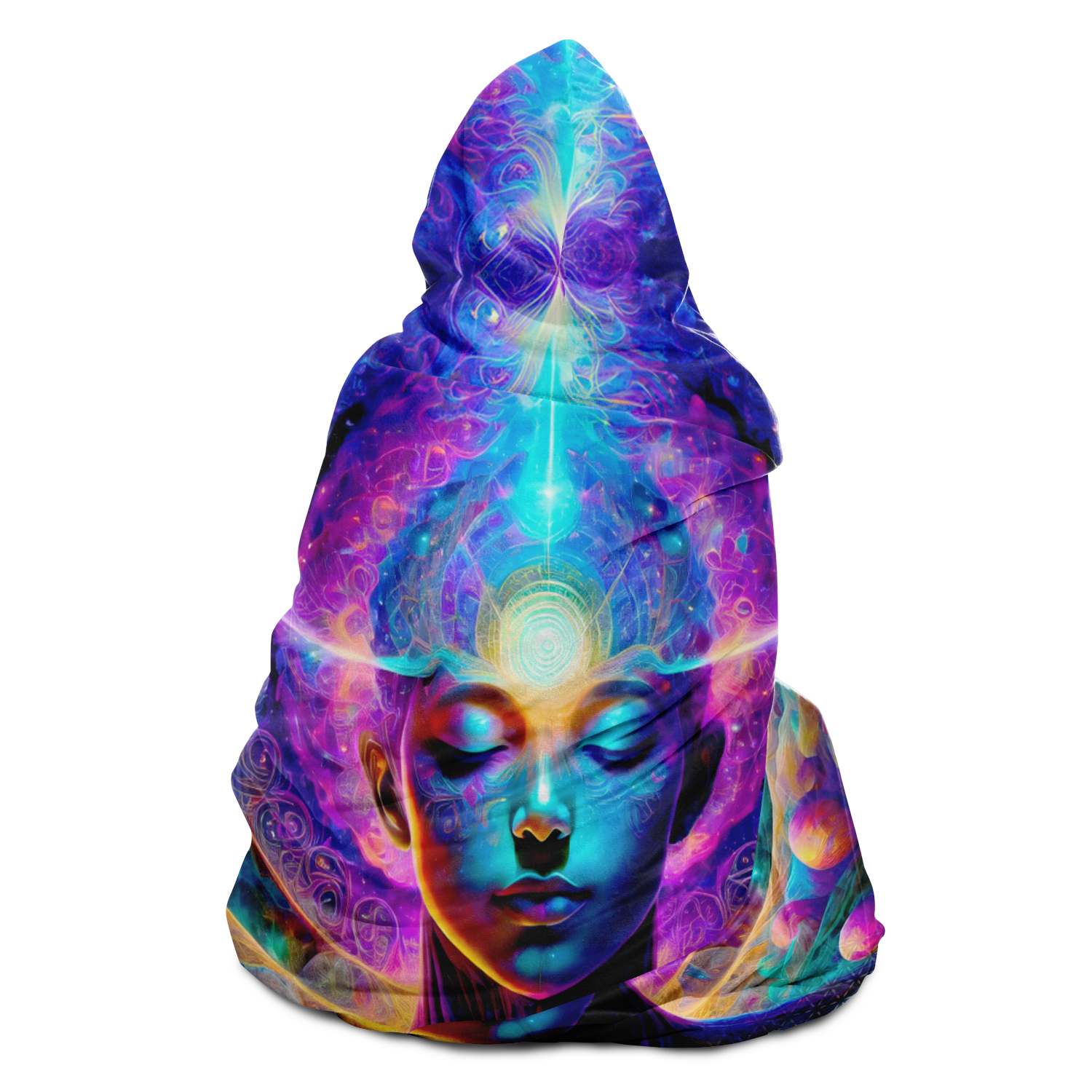 Enter the still point between breaths. The Mystic Contemplation hooded blanket wraps you in a vivid, high-definition cosmic portrait - a meditative figure radiating blue-violet light, framed by sacred geometry and galactic currents. The sherpa-lined interior holds warmth like a sanctuary, while the outer print projects pure visionary energy.