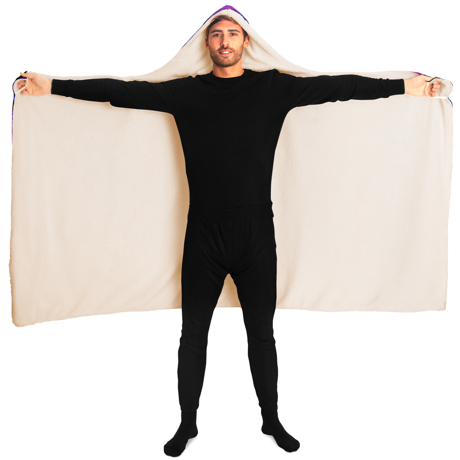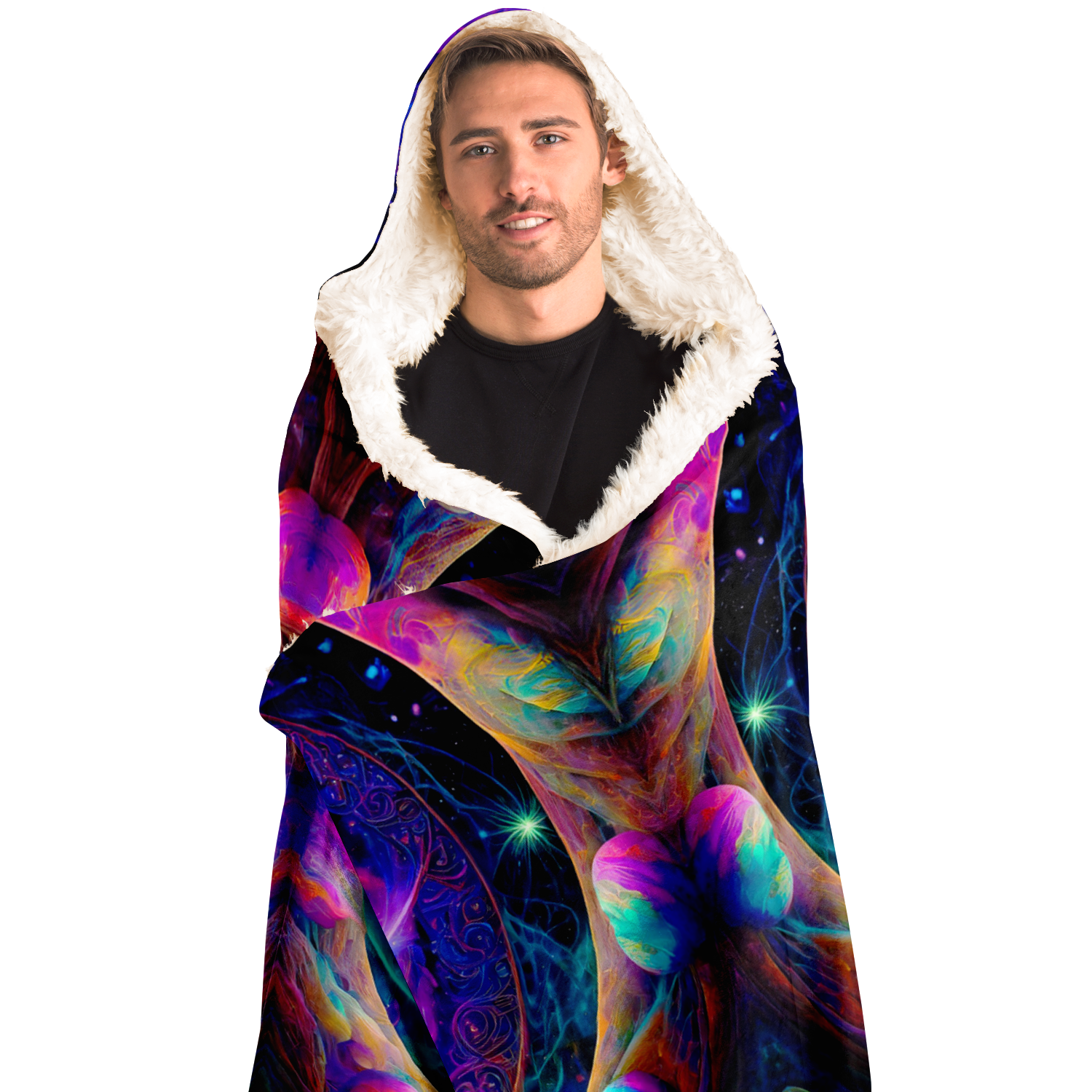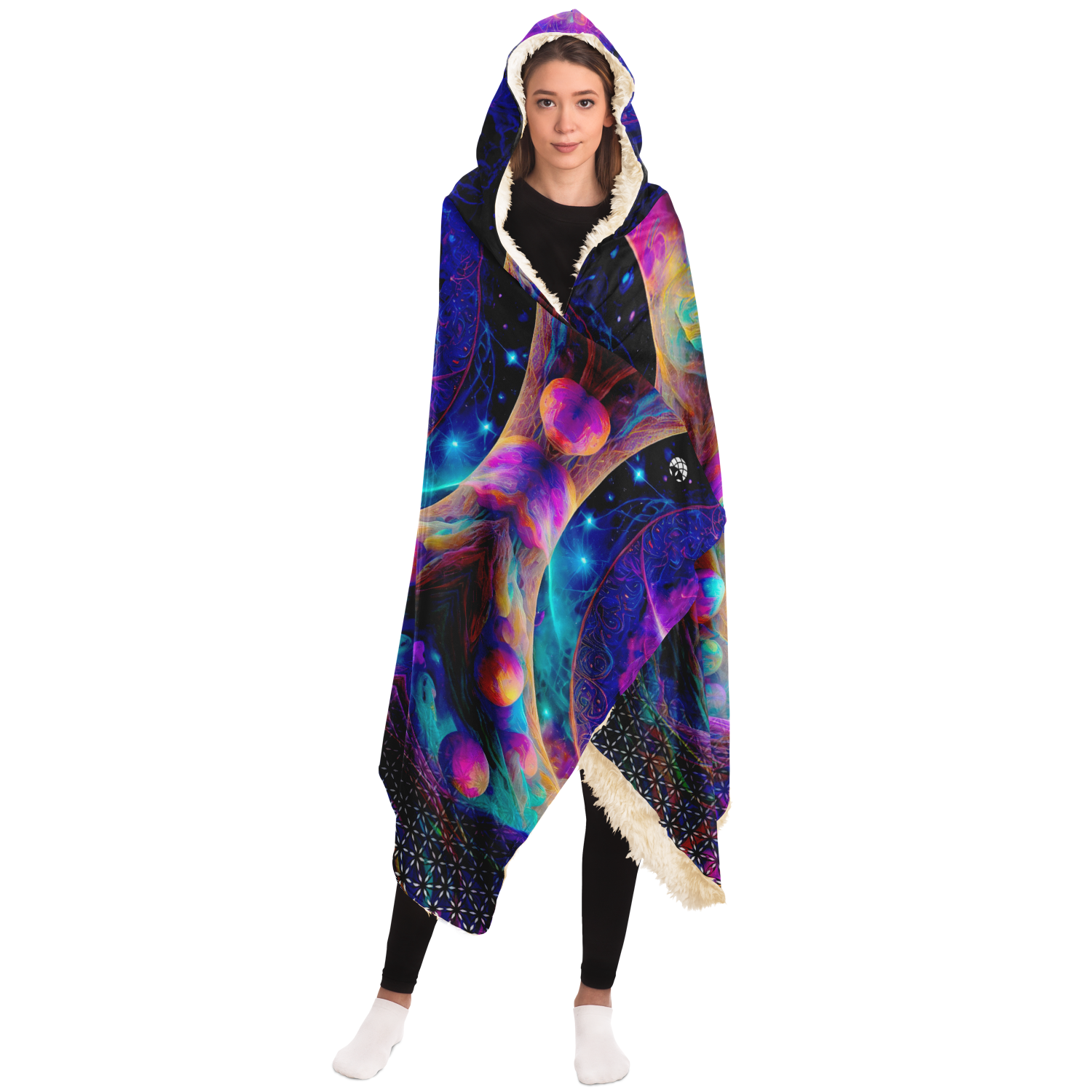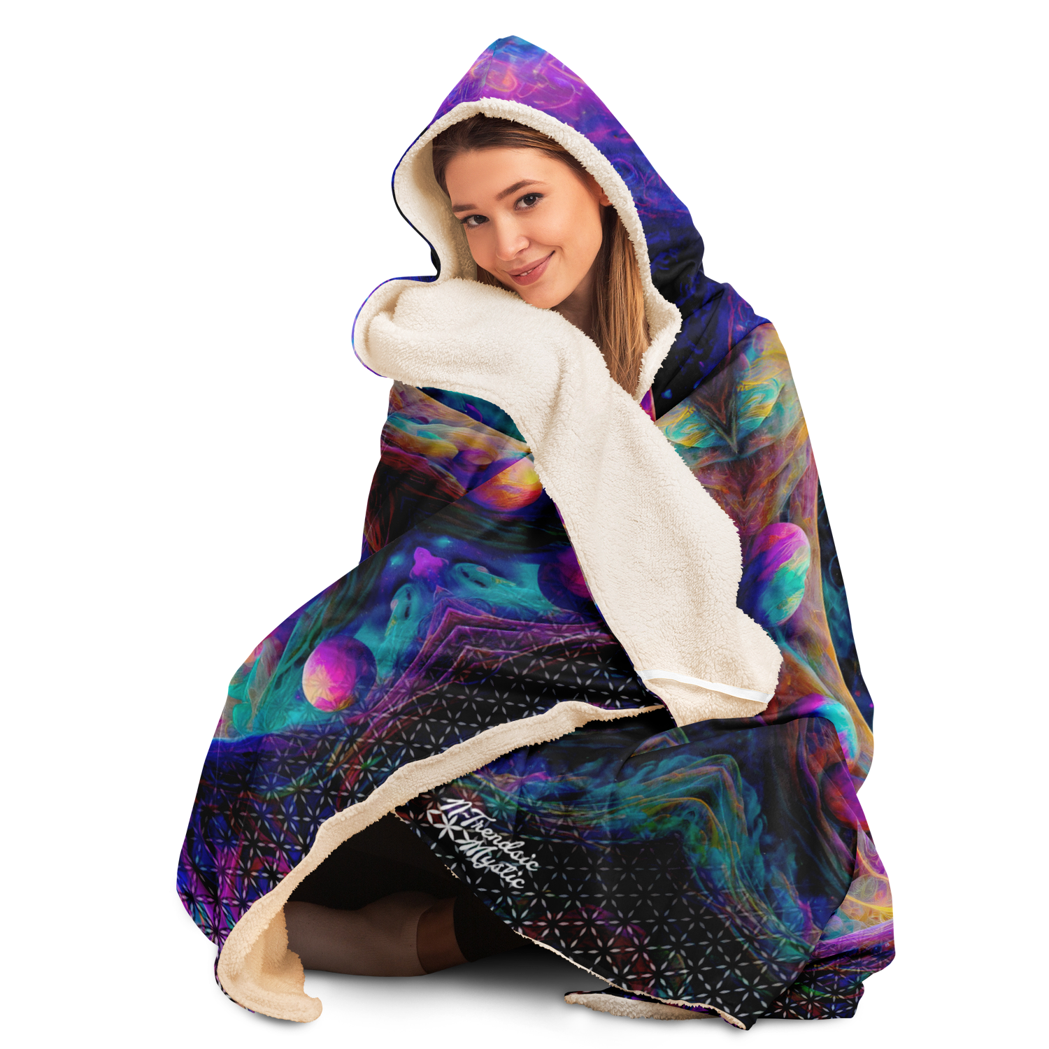 Enter the still point between breaths. The Mystic Contemplation hooded blanket wraps you in a vivid, high-definition cosmic portrait - a meditative figure radiating blue-violet light, framed by sacred geometry and galactic currents. The sherpa-lined interior holds warmth like a sanctuary, while the outer print projects pure visionary energy.
