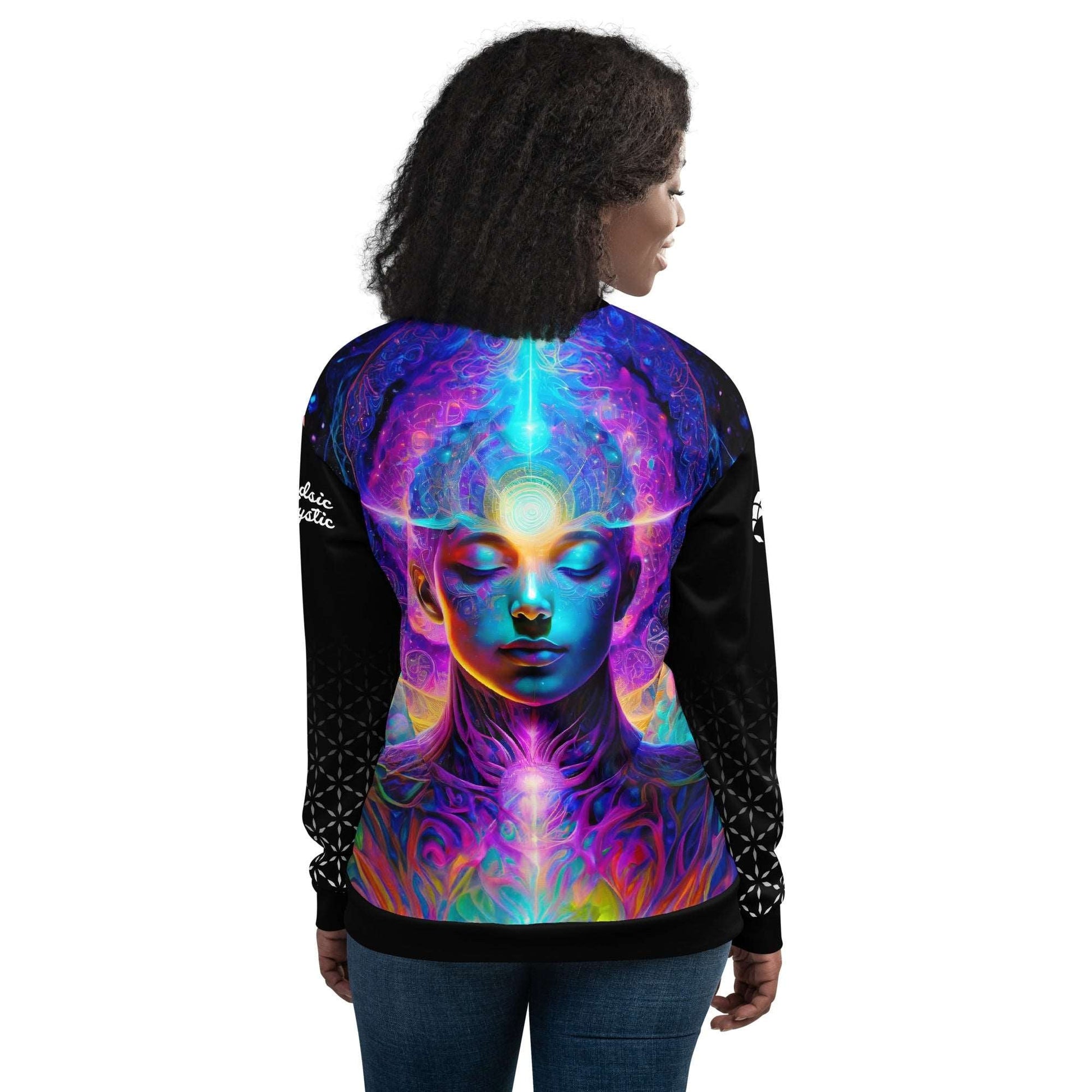 A wearable meditation. Mystic Contemplation carries an otherworldly, full-back artwork that radiates luminous vision, anchored by a sleek front with a super-stacked sacred geometry lightcode over the heart. Built in a unisex bomber silhouette, fleece-lined for comfort, it moves seamlessly between sacred ceremony and street expression.