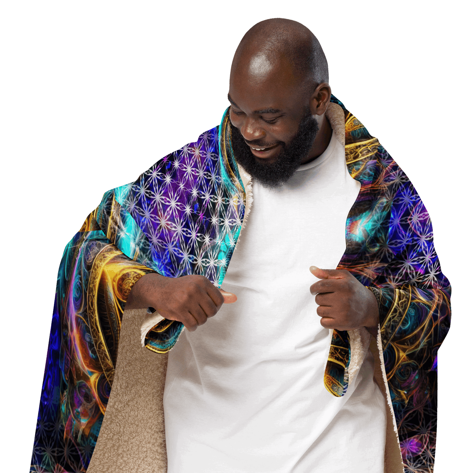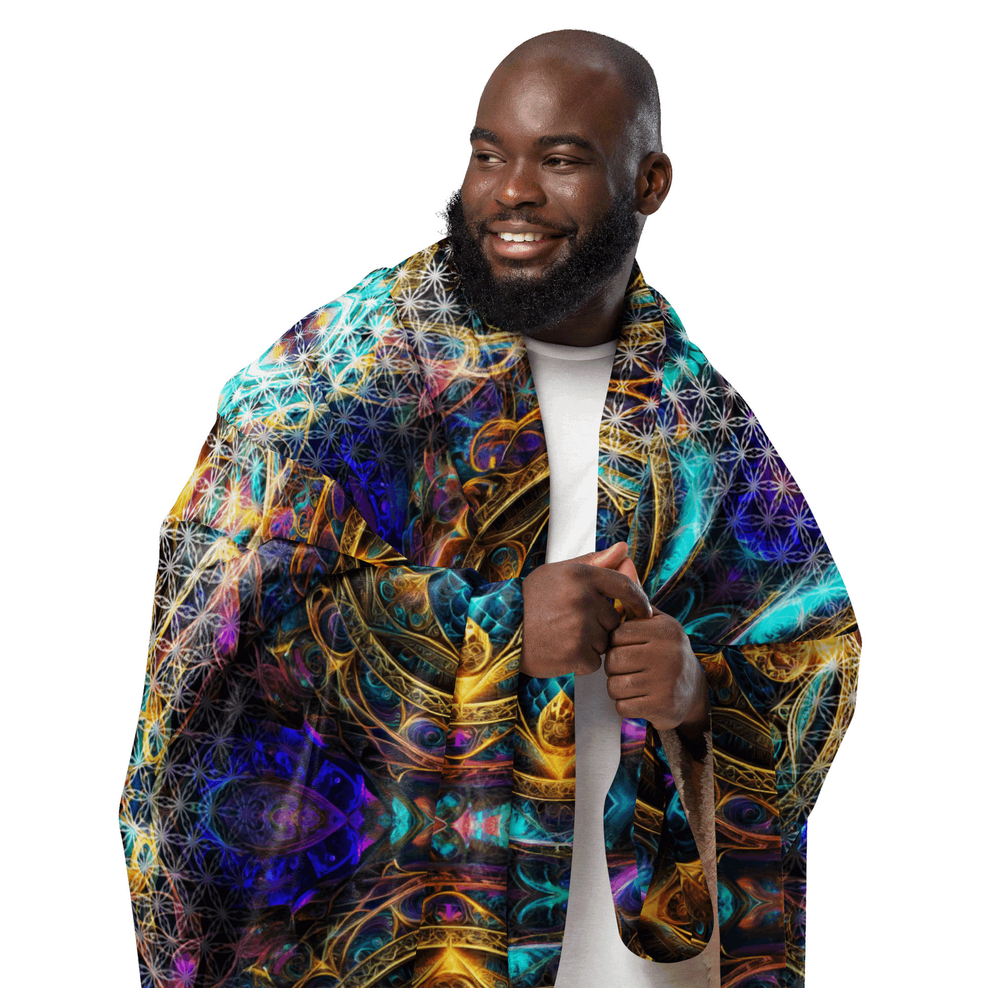 Wrap yourself in a radiant embrace of sacred patterning and luminous color. Mystic Euphony features a glowing central heart framed by golden mandalas and Flower of Life grids, woven into a tapestry of deep blues, purples, and teal highlights.