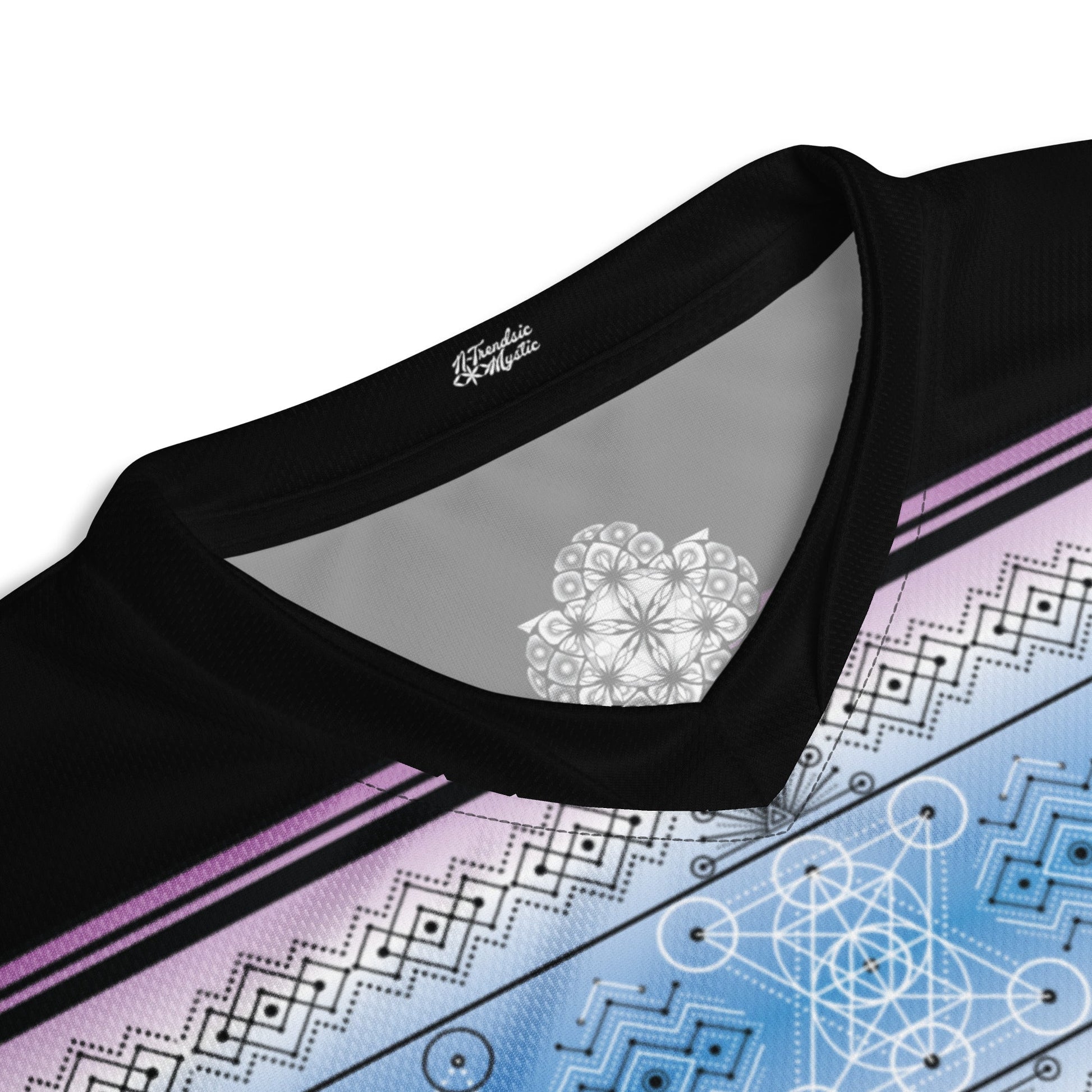 Step into the game with cosmic energy on your side. The Mystic Frequency Sports Jersey fuses sacred geometry, eco-friendly performance fabric, and streetwear edge into one statement piece. Designed for movement and made for impact, this recycled unisex jersey wicks moisture, shields with UPF 50+, and keeps you cool with a two-way stretch fit.