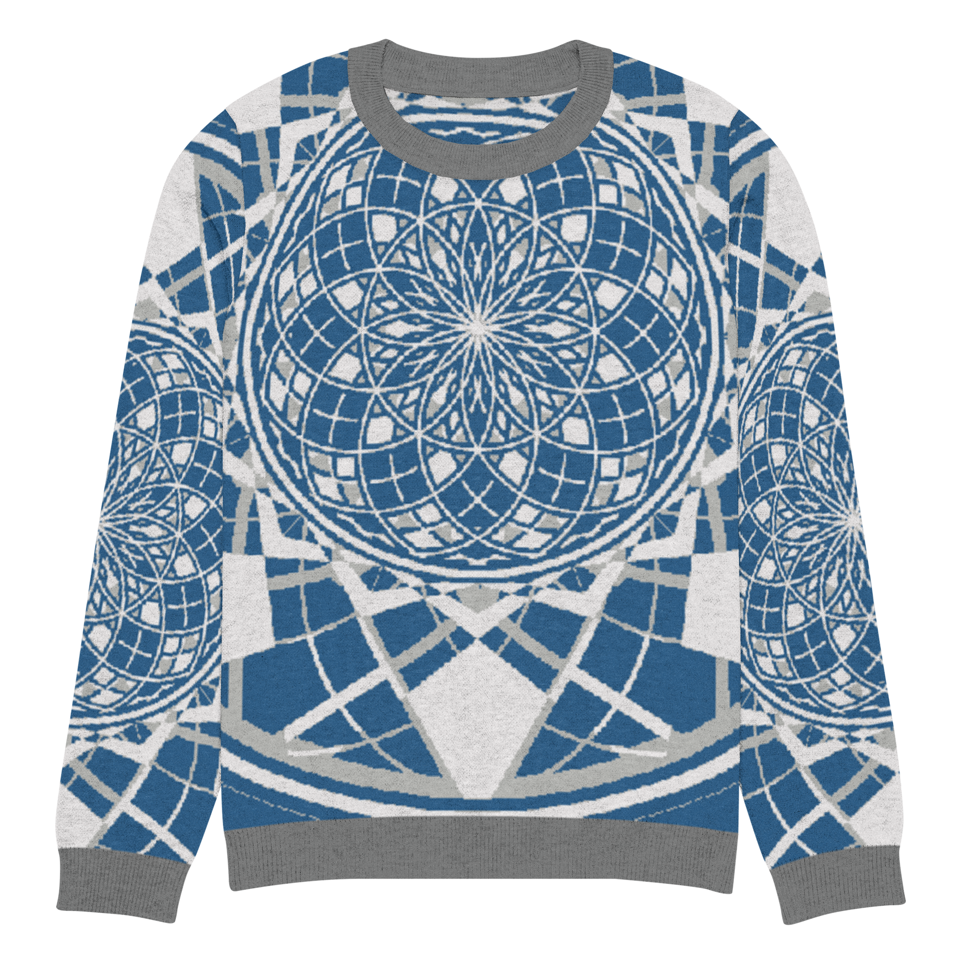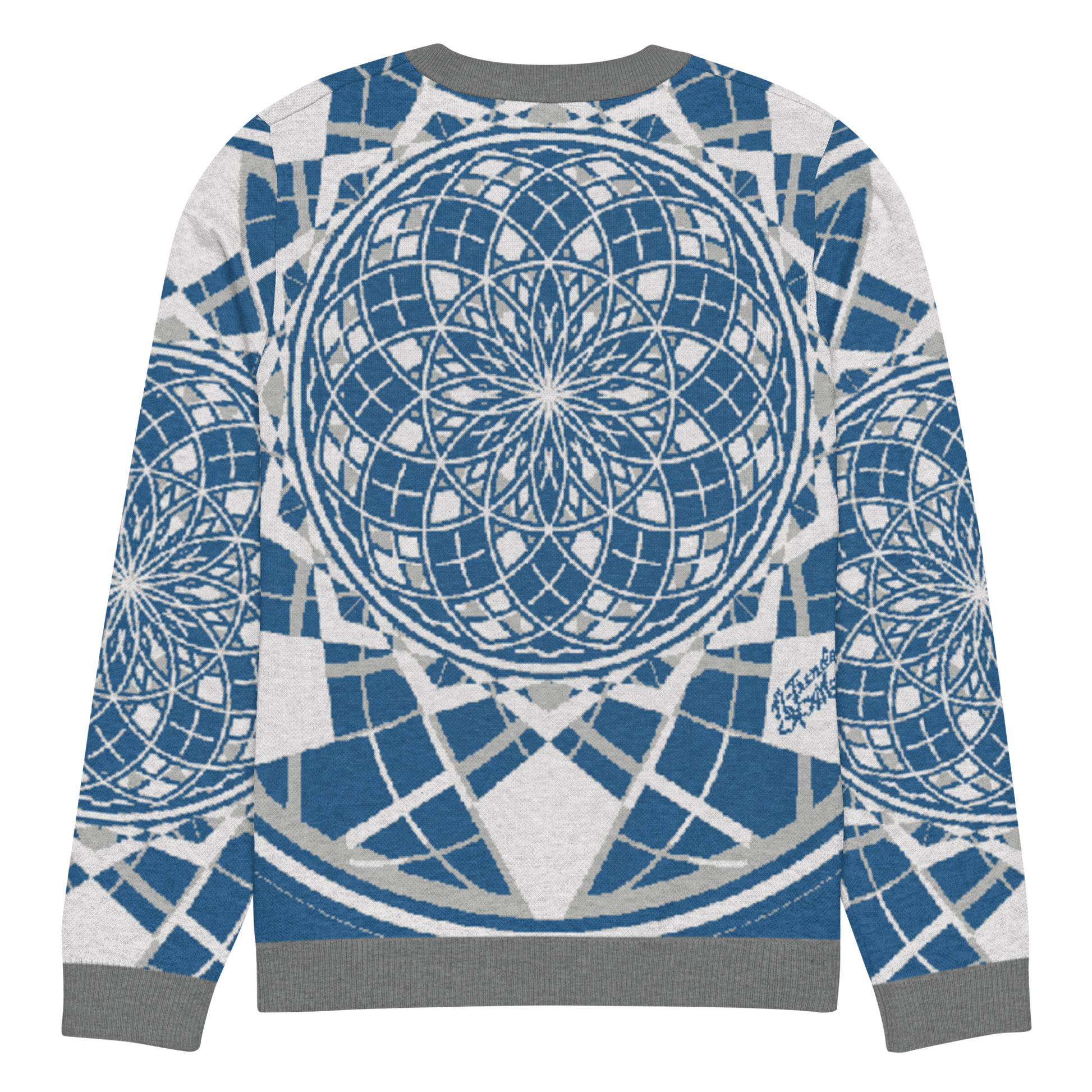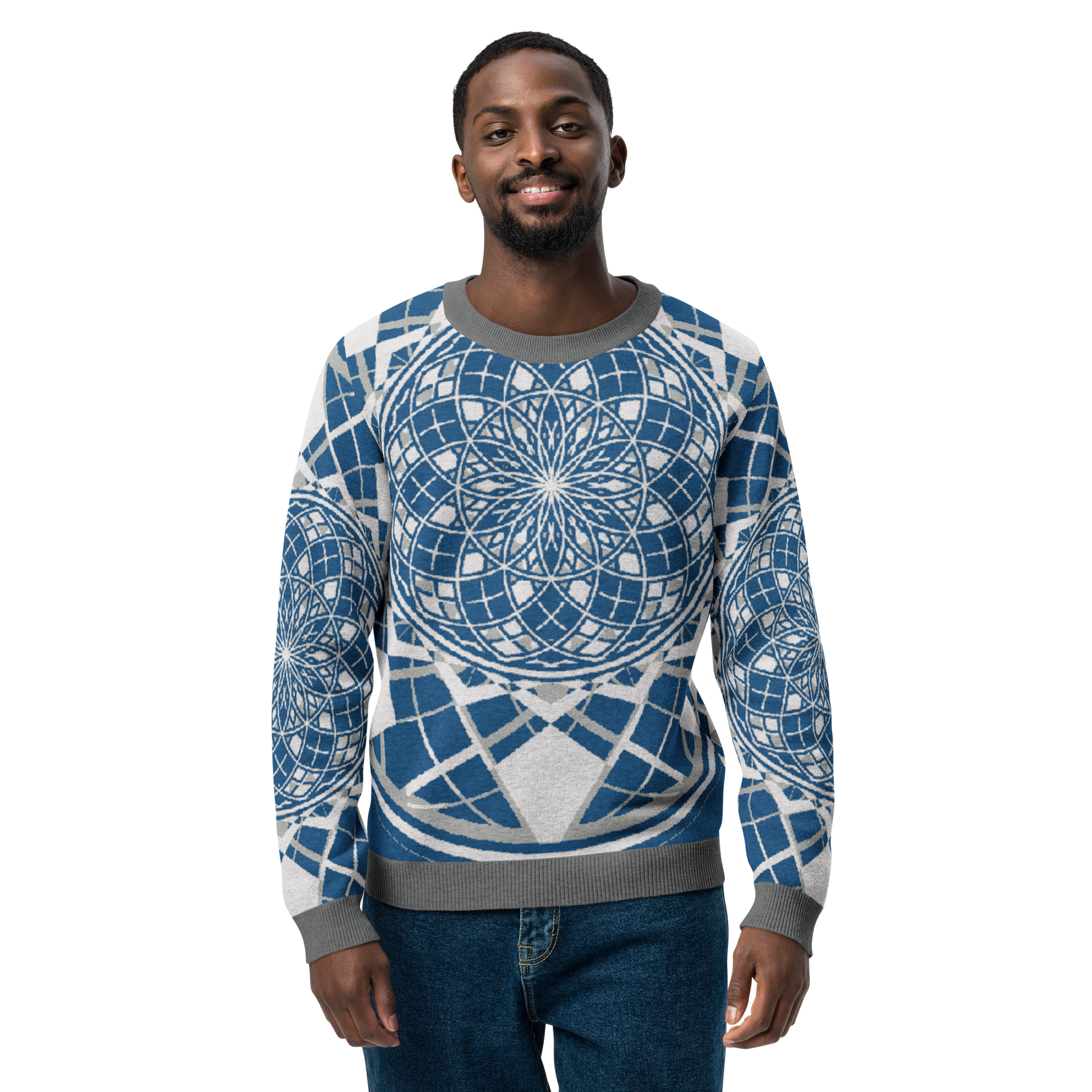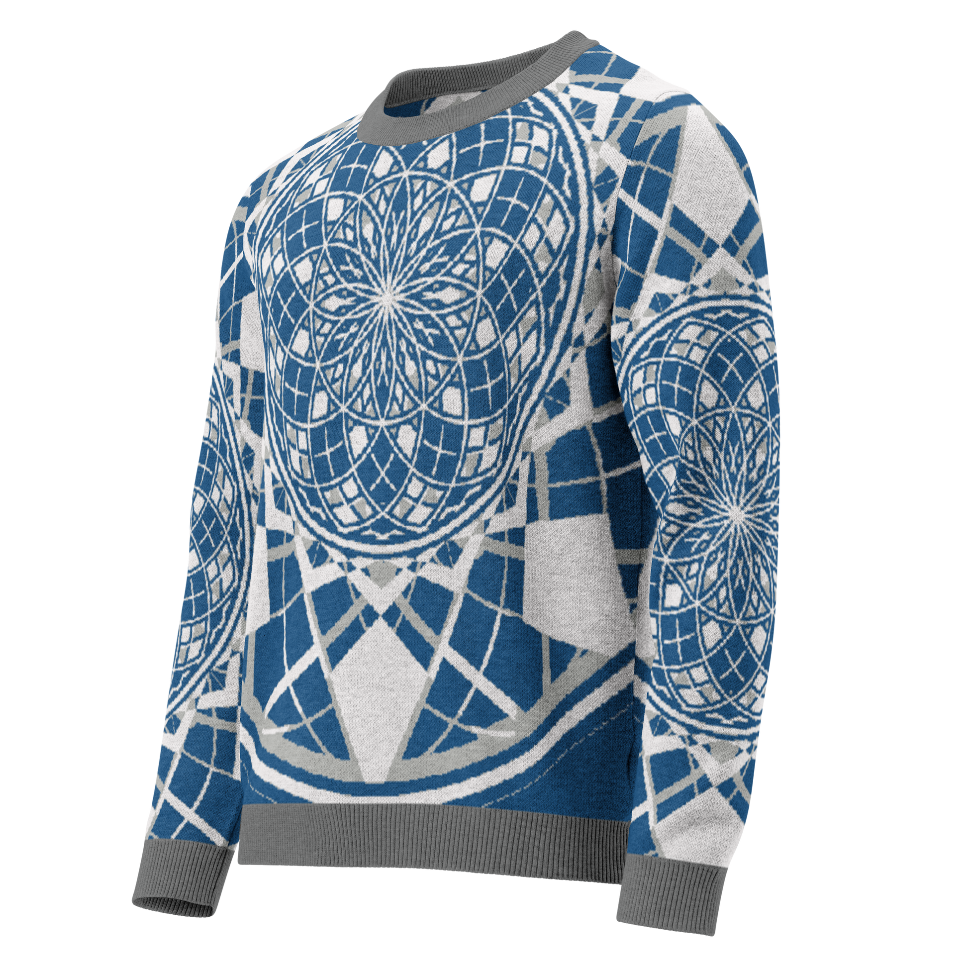 The Mystic Metamorphic Blue Sky Knitted Crew Neck Sweater fuses sacred geometry with tranquil sky-inspired tones, offering a wearable canvas of harmony and design. Its intricate mandala and geometric gridwork evoke the expansiveness of open air and the stillness of meditative breath.