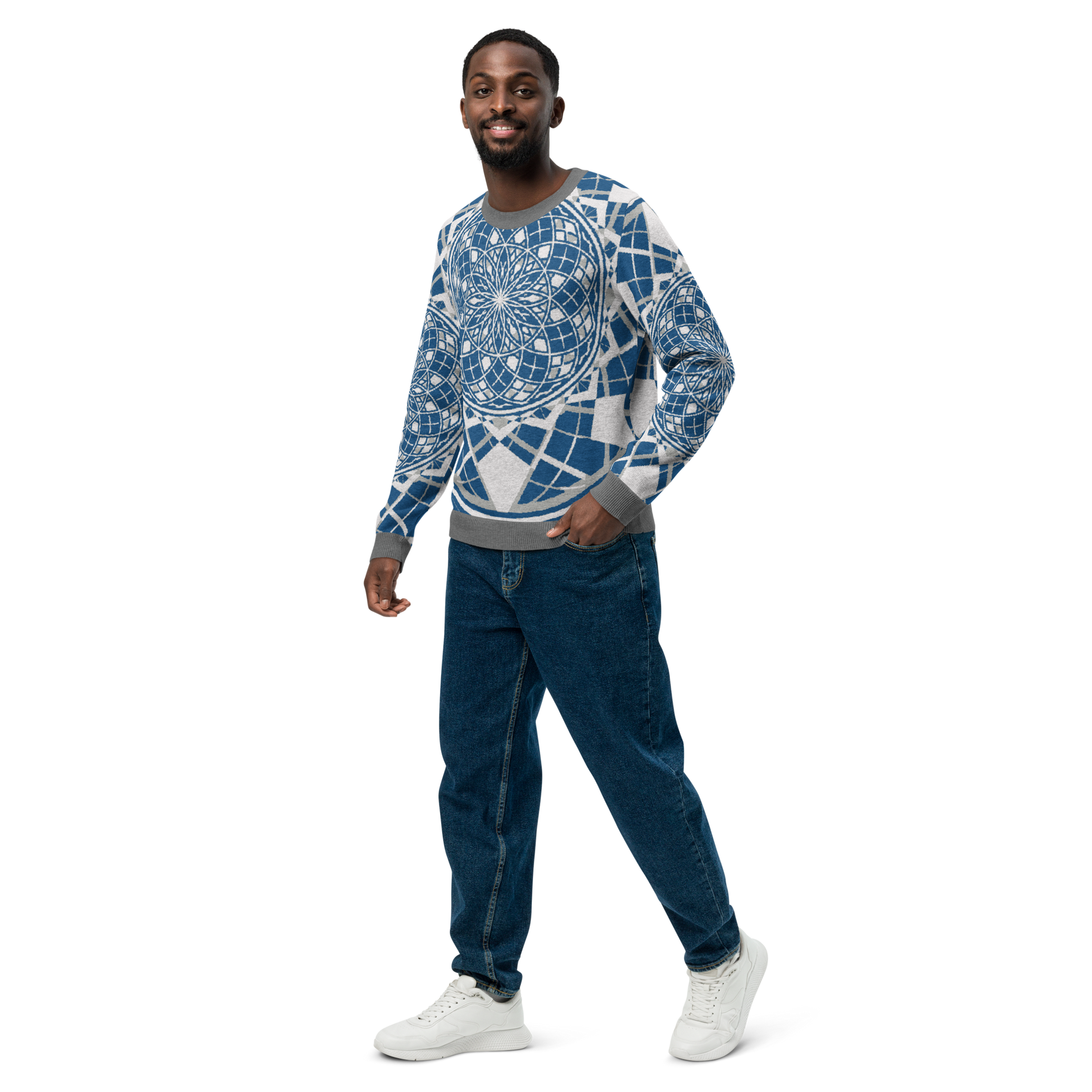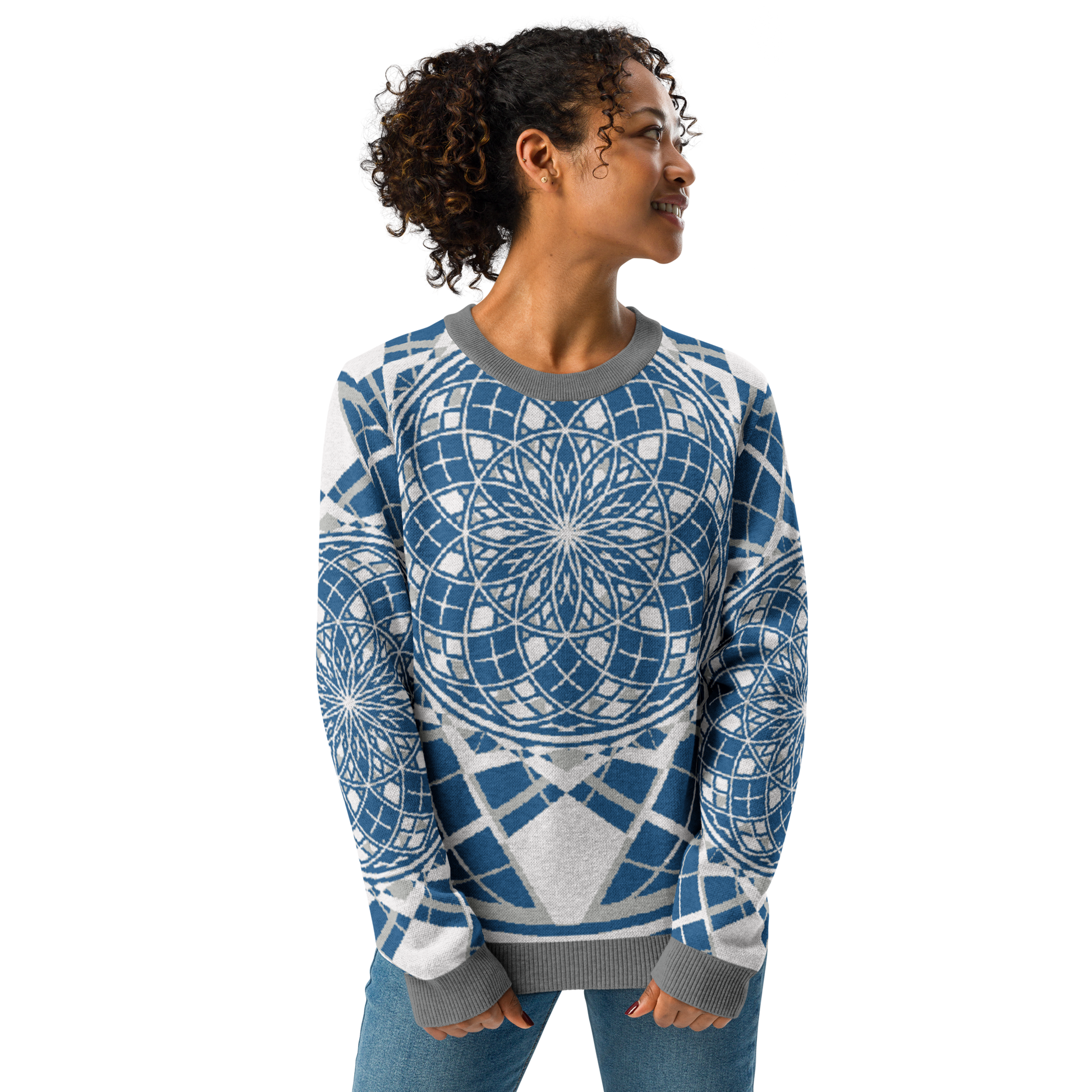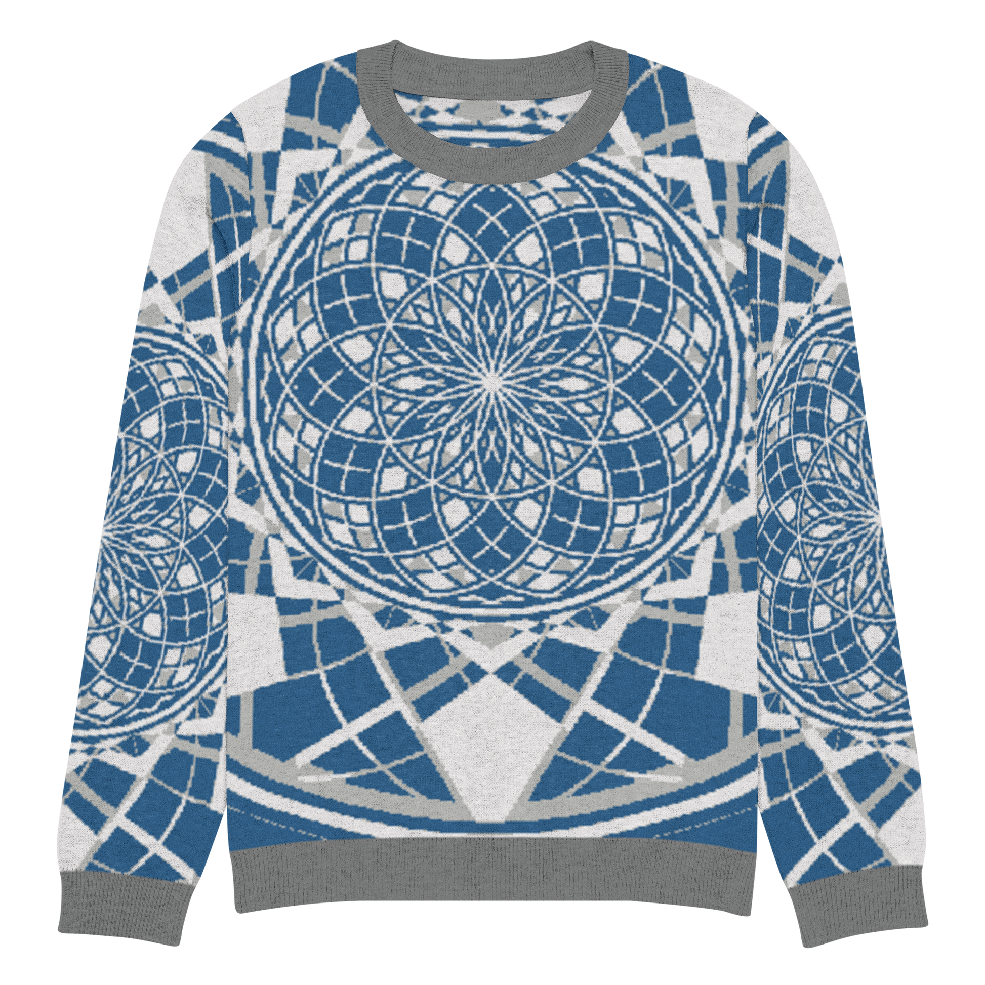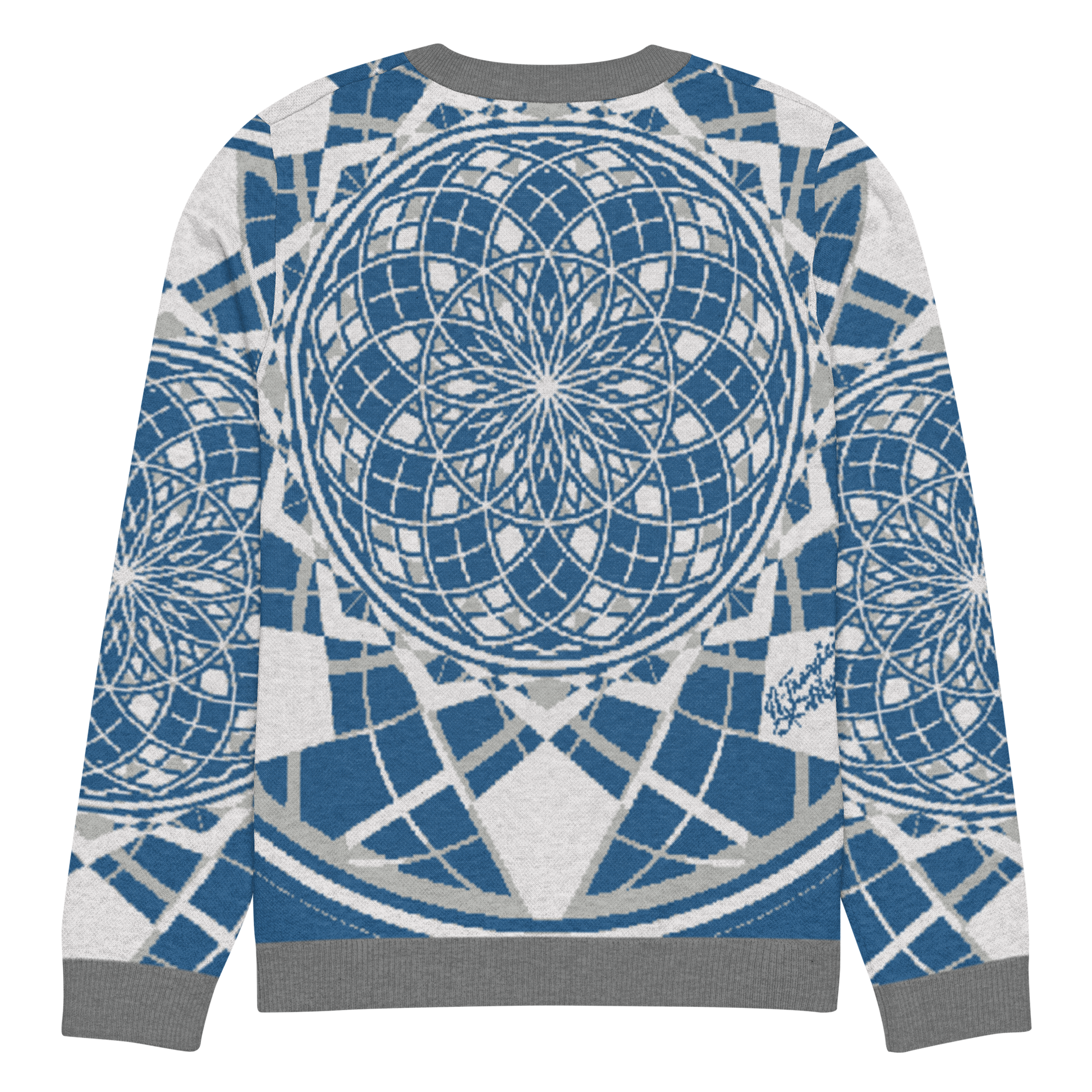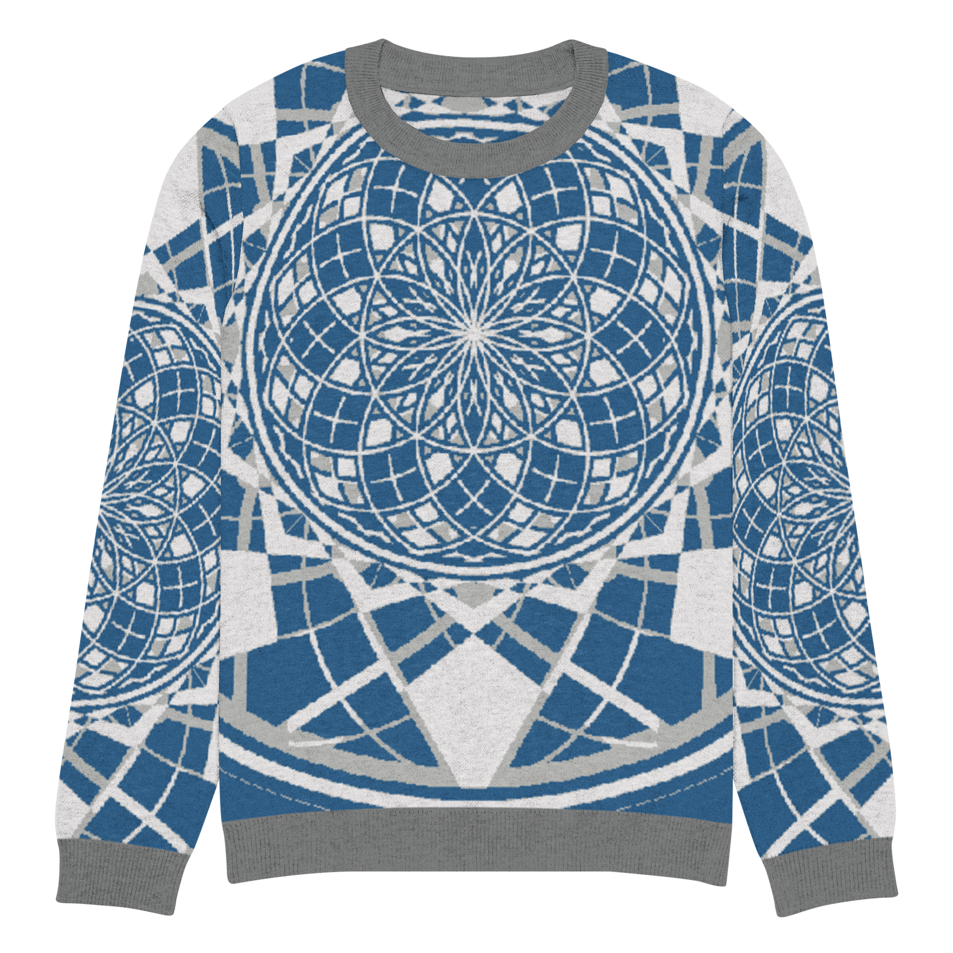 The Mystic Metamorphic Blue Sky Knitted Crew Neck Sweater fuses sacred geometry with tranquil sky-inspired tones, offering a wearable canvas of harmony and design. Its intricate mandala and geometric gridwork evoke the expansiveness of open air and the stillness of meditative breath.
