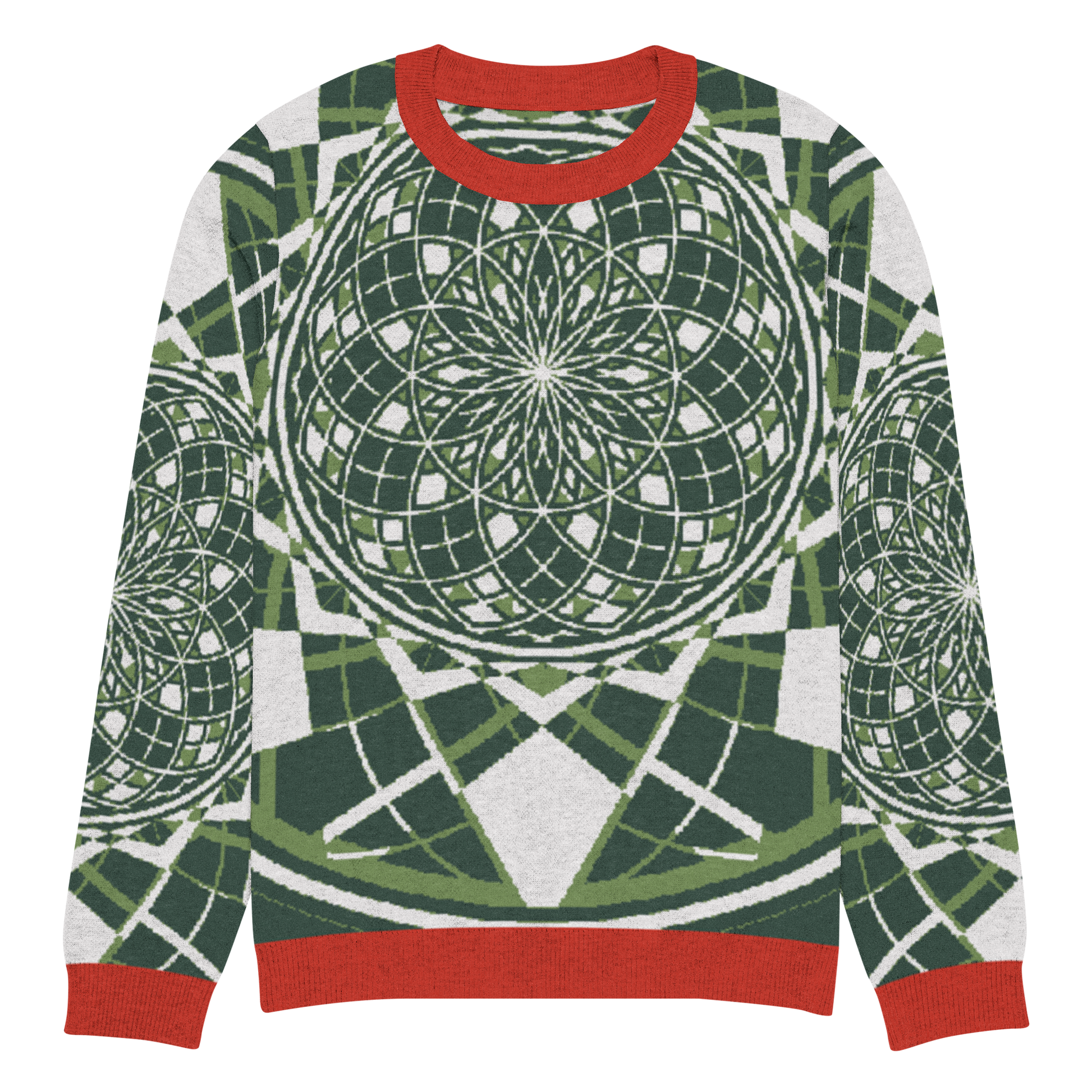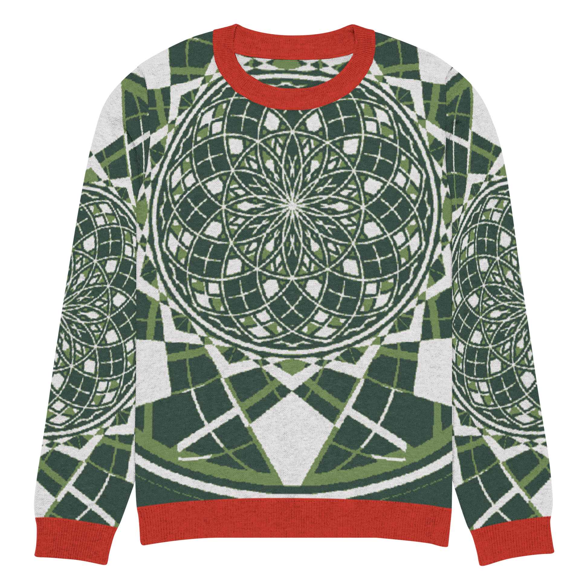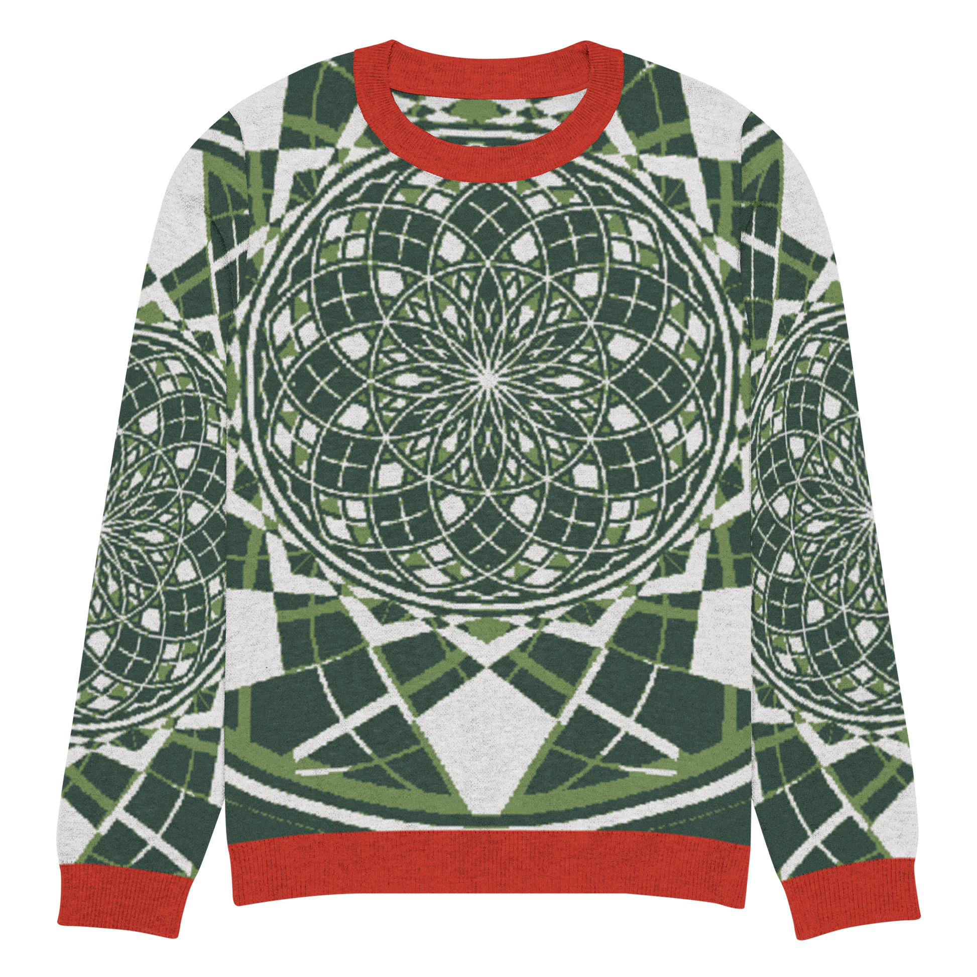 - Sacred geometry patterning woven directly into the knit