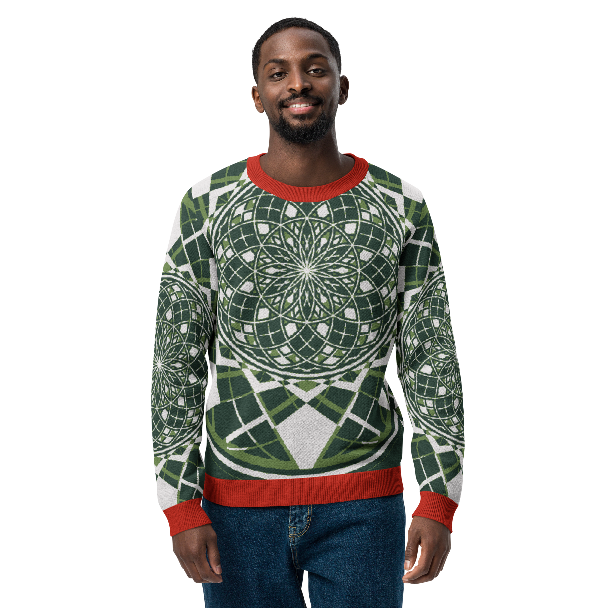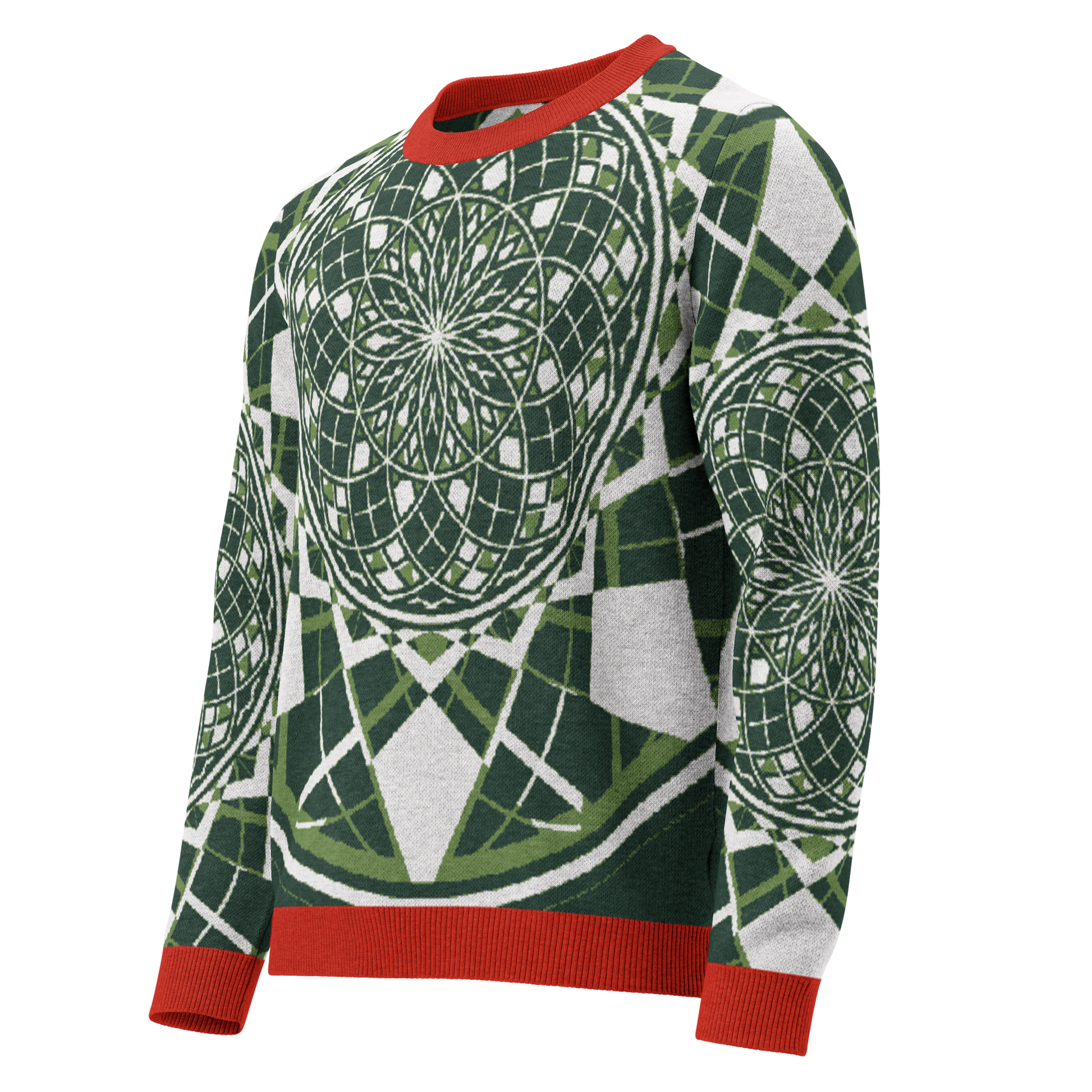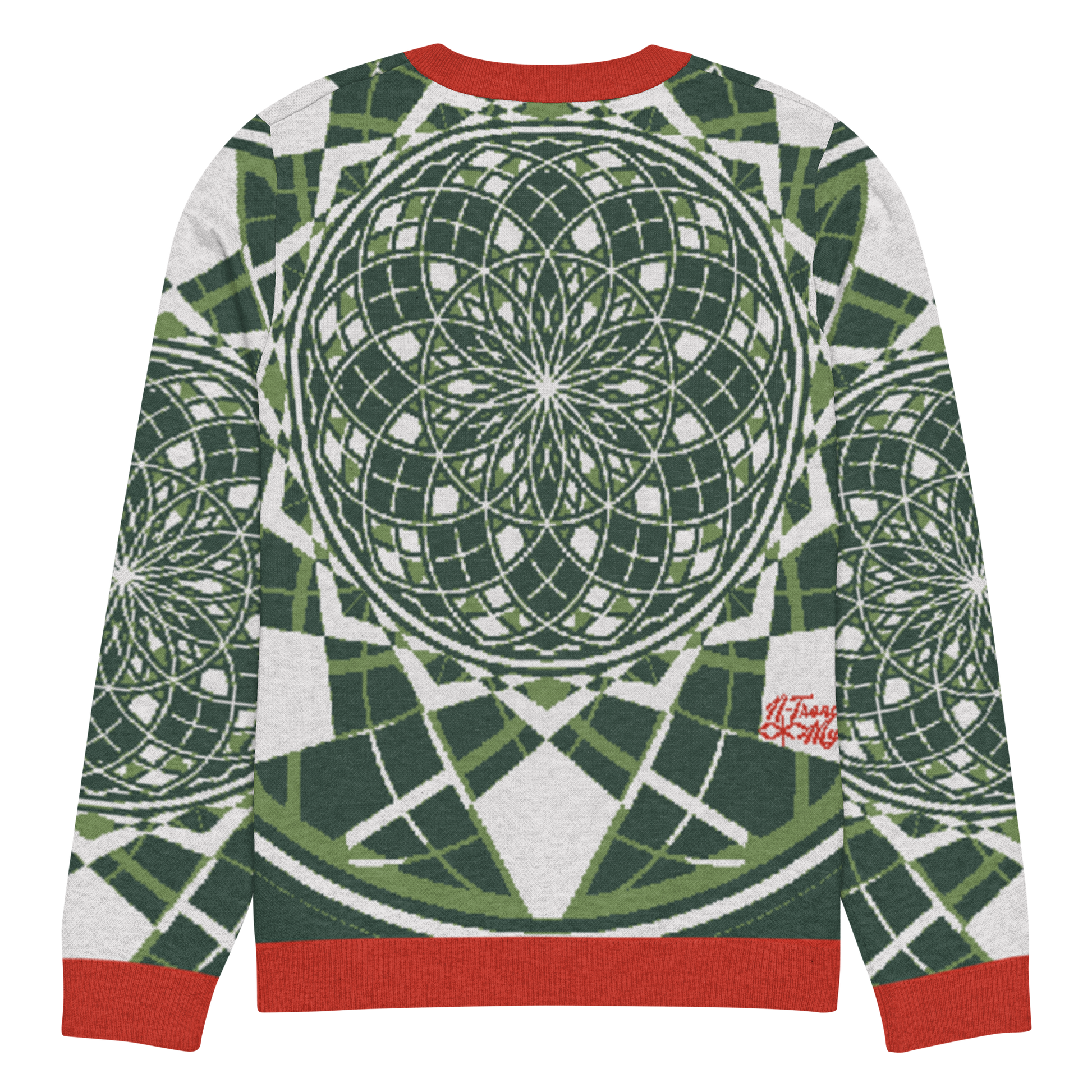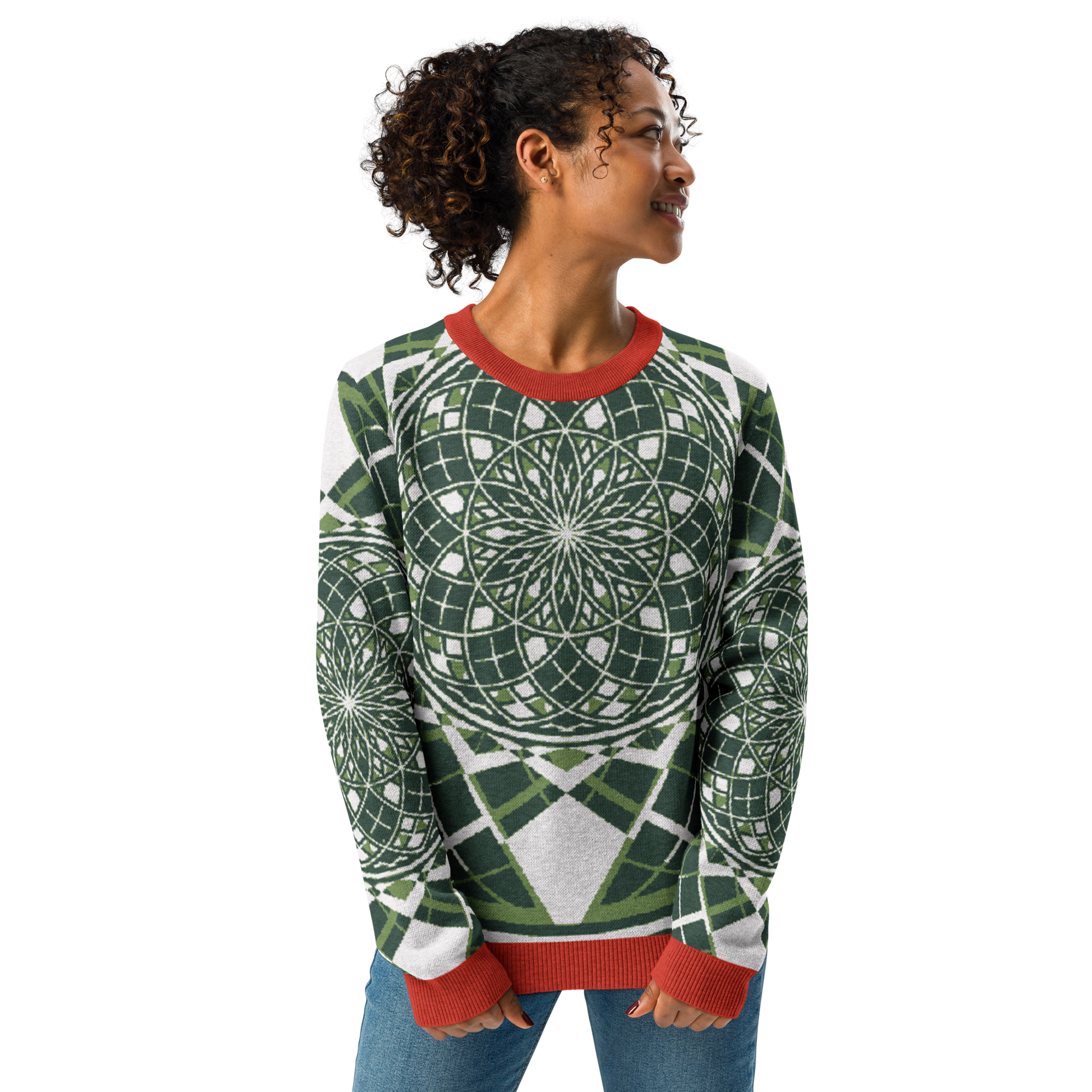 - Sacred geometry patterning woven directly into the knit
