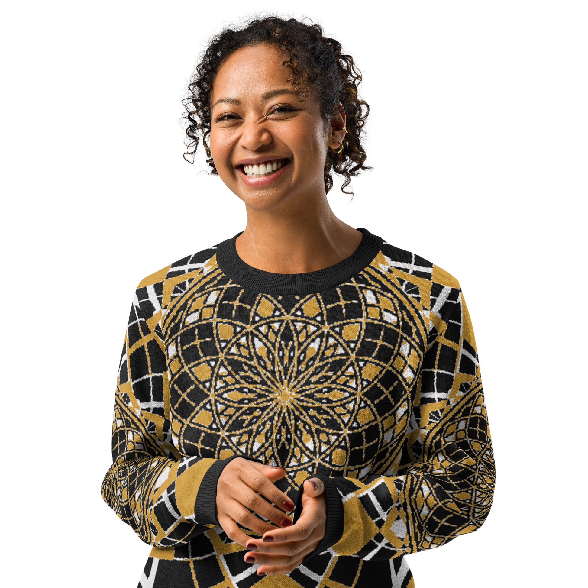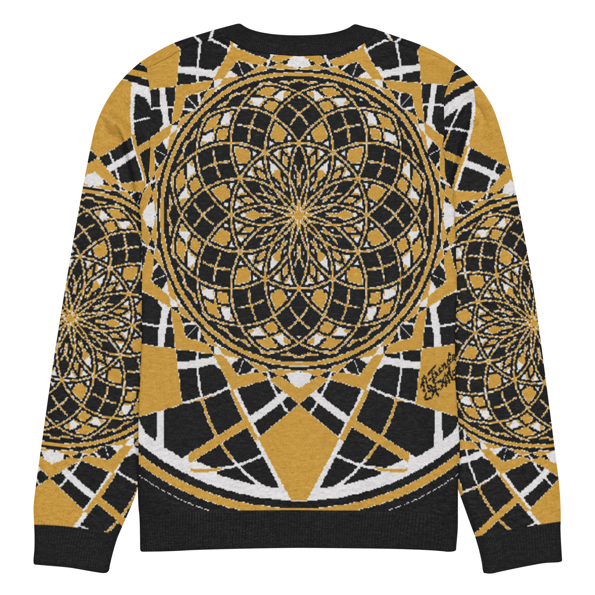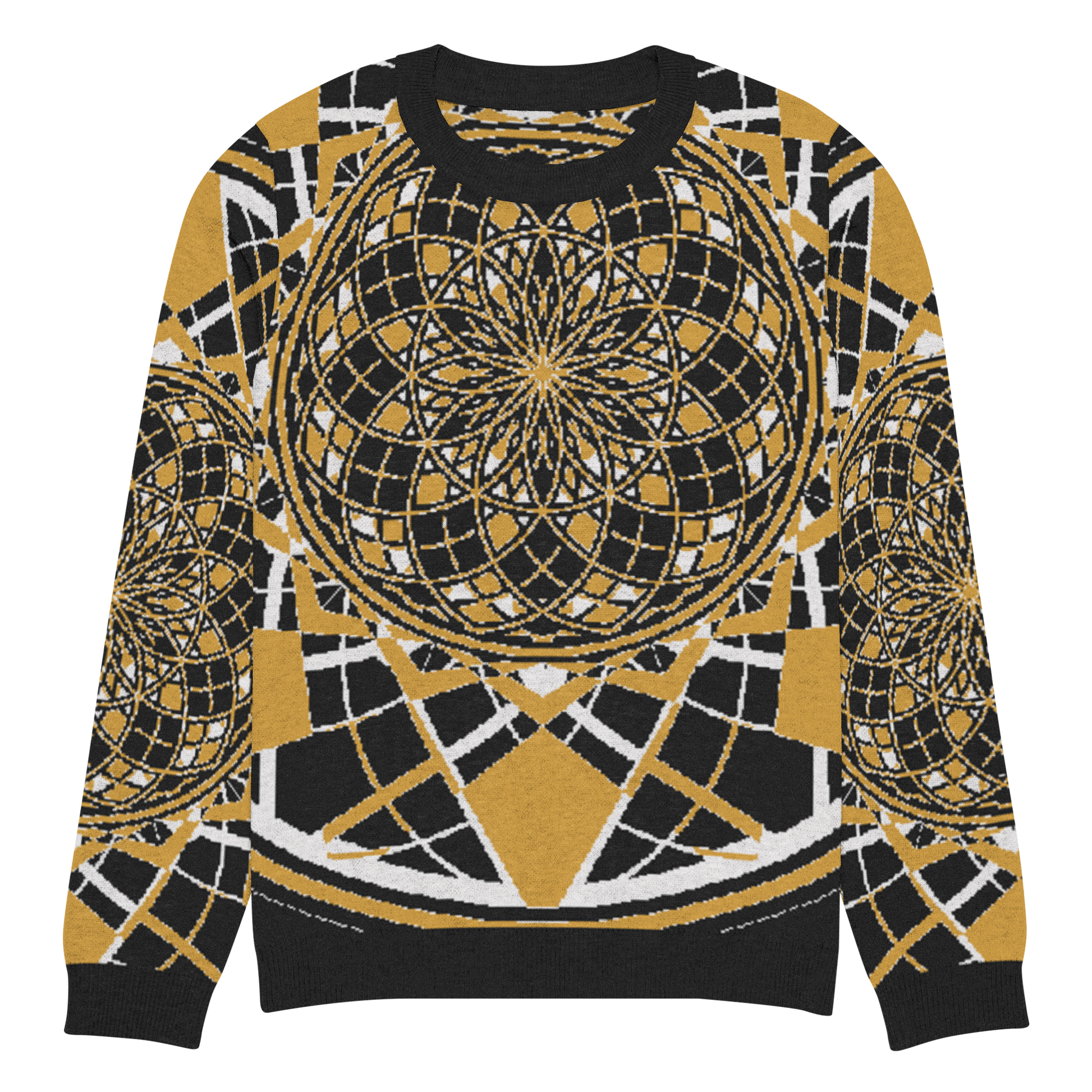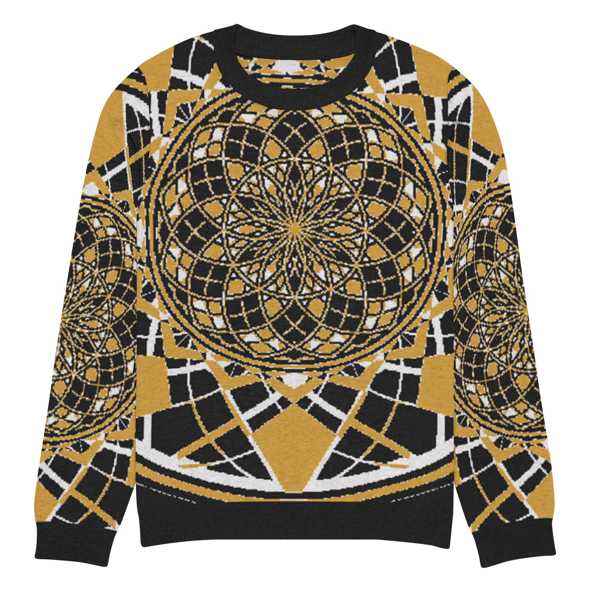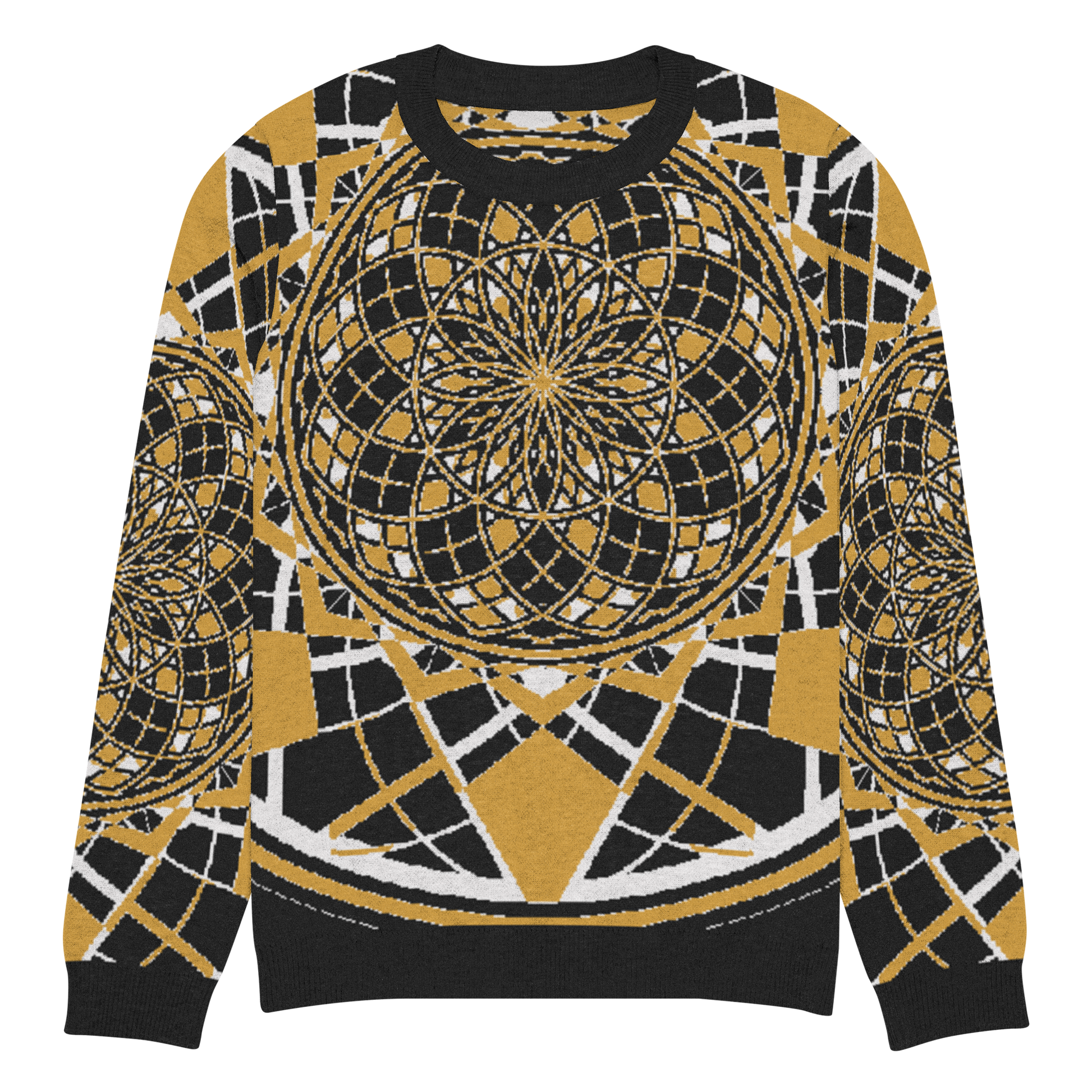 The Mystic Metamorphic Mustard Knitted Crew Neck Sweater radiates golden warmth and sacred geometry precision. Its rich mustard hue, contrasted with deep black and crisp white, channels a regal yet modern energy — perfect for those who carry the sun within and weave symmetry into their style.