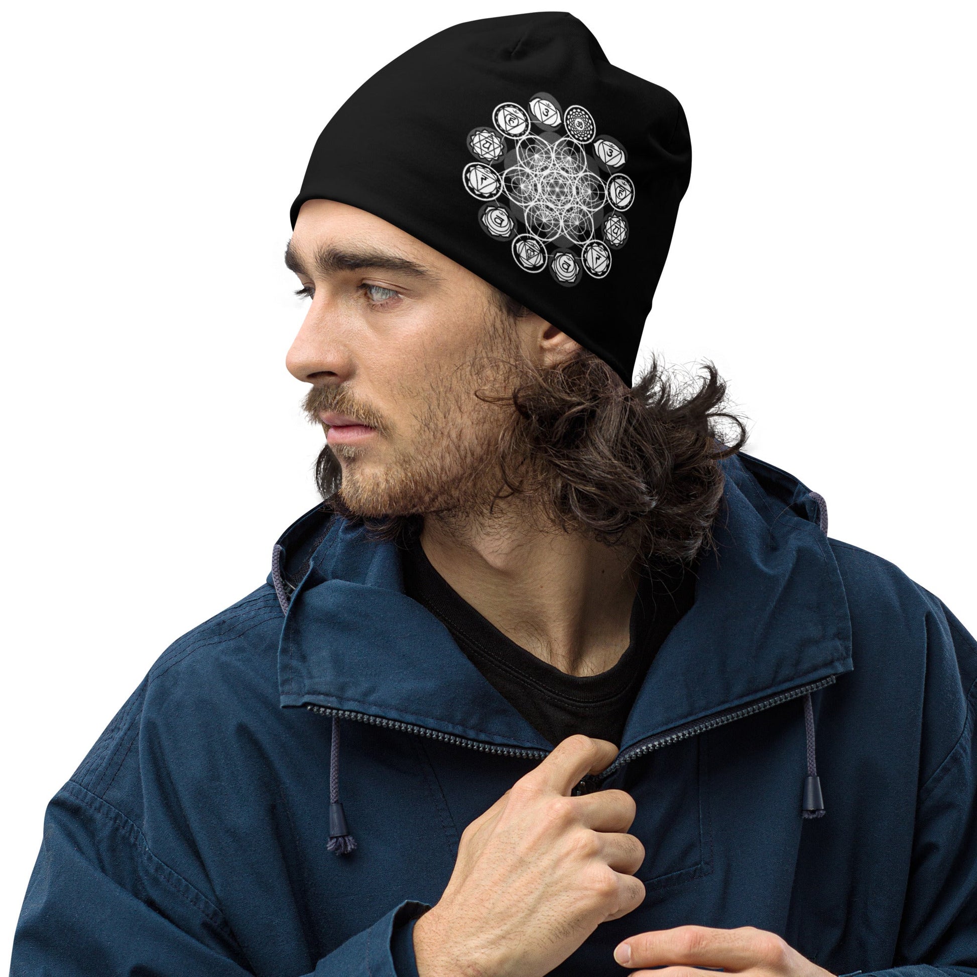 Symbols that travel well. This all-over print beanie turns your crown into a quiet sigil field - soft, double-layered, and ready for coffee runs, night walks, markets, and studio sessions.