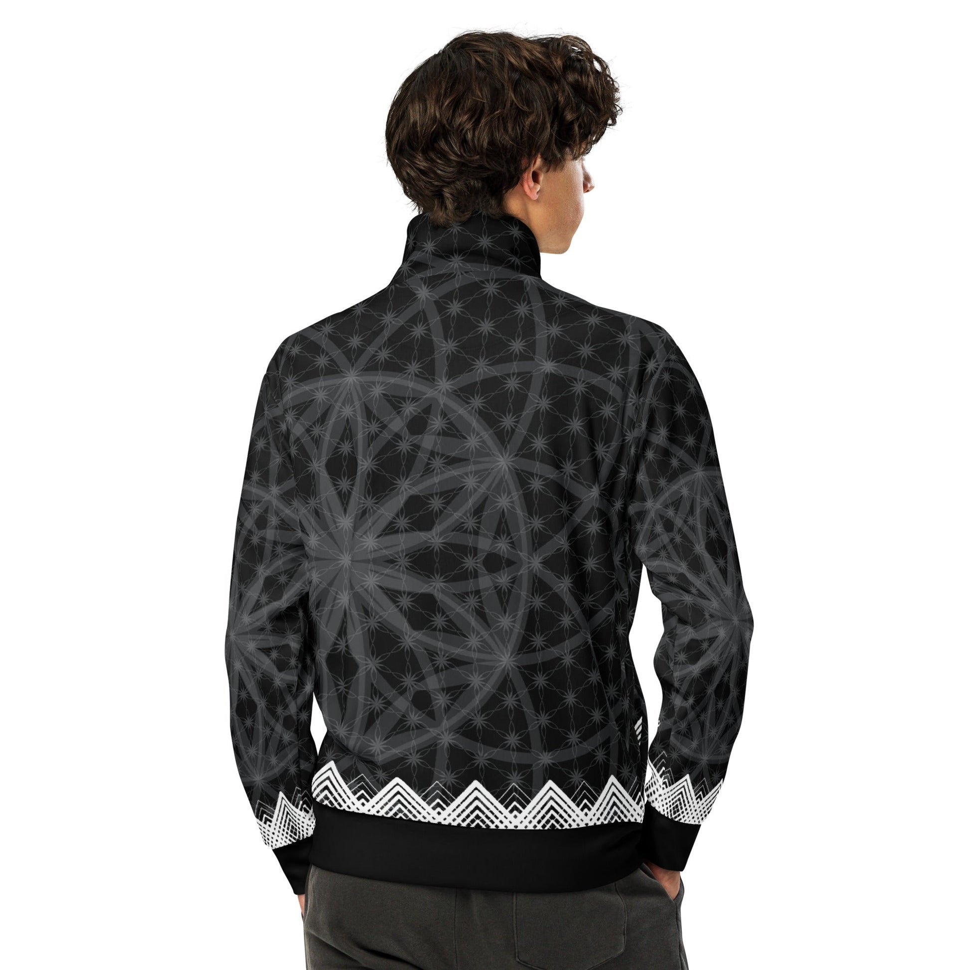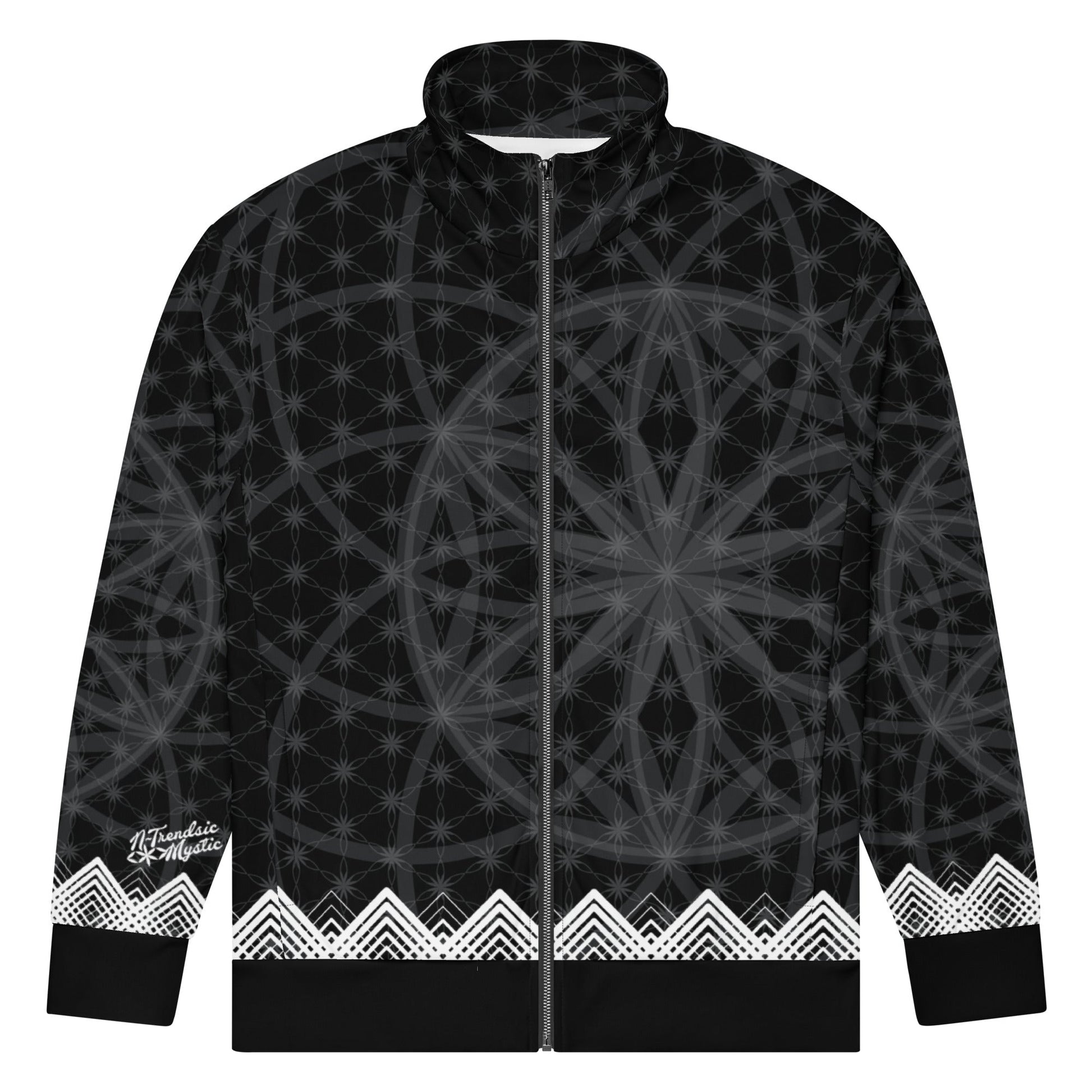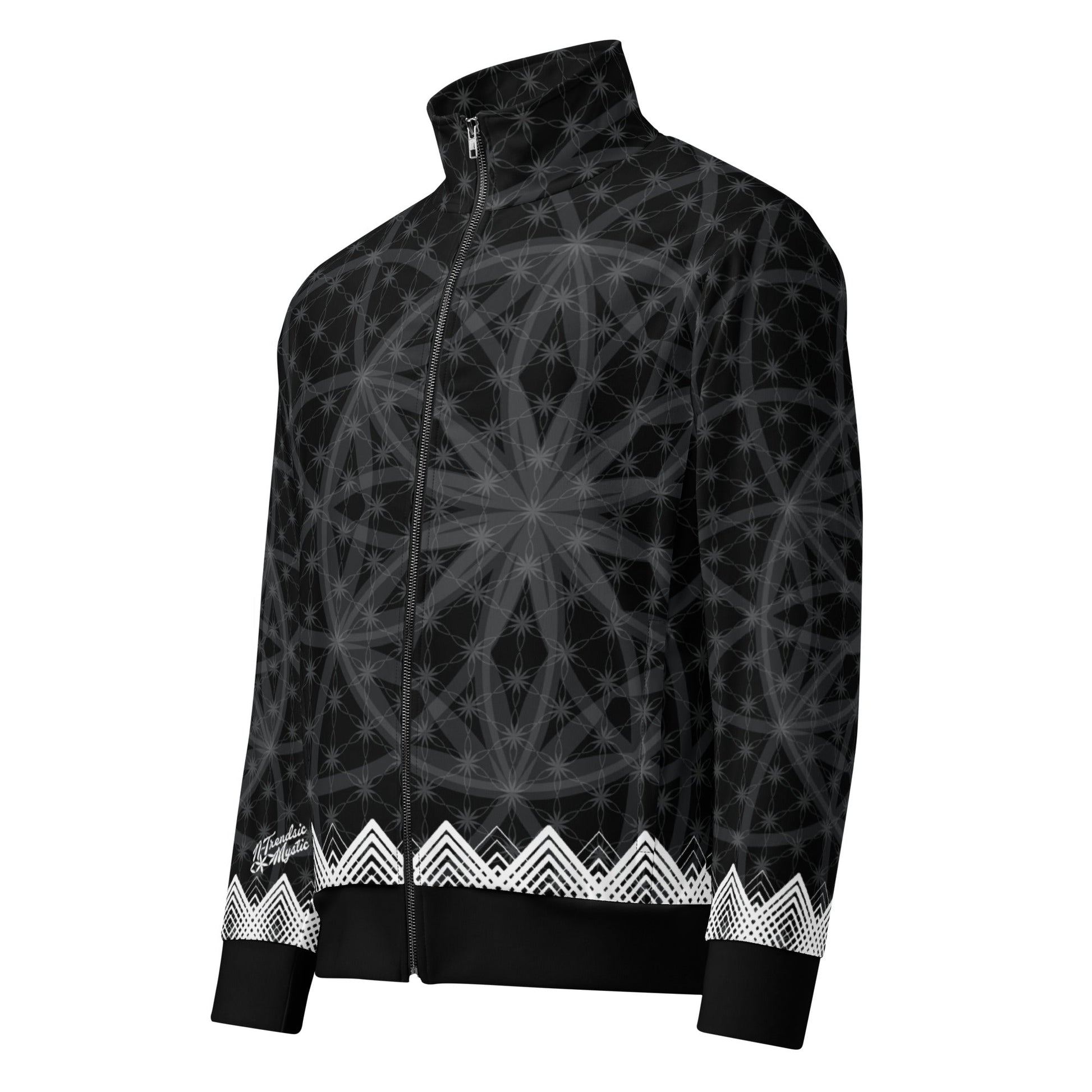 Wrap yourself in the Prima Mystica - a unisex track jacket where streetwear edge meets the timeless language of sacred geometry. The design radiates from a central Flower of Life foundation, expanding into intricate star formations and crowned by a rhythmic, chevron-like border. Crafted for versatility, it moves seamlessly from mindful moments to city streets.