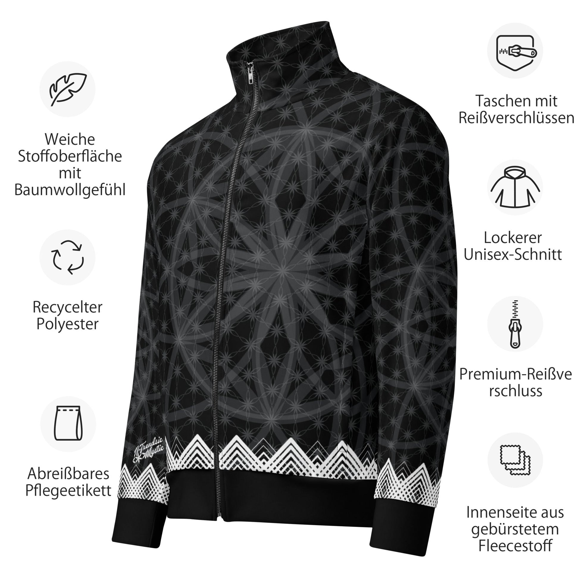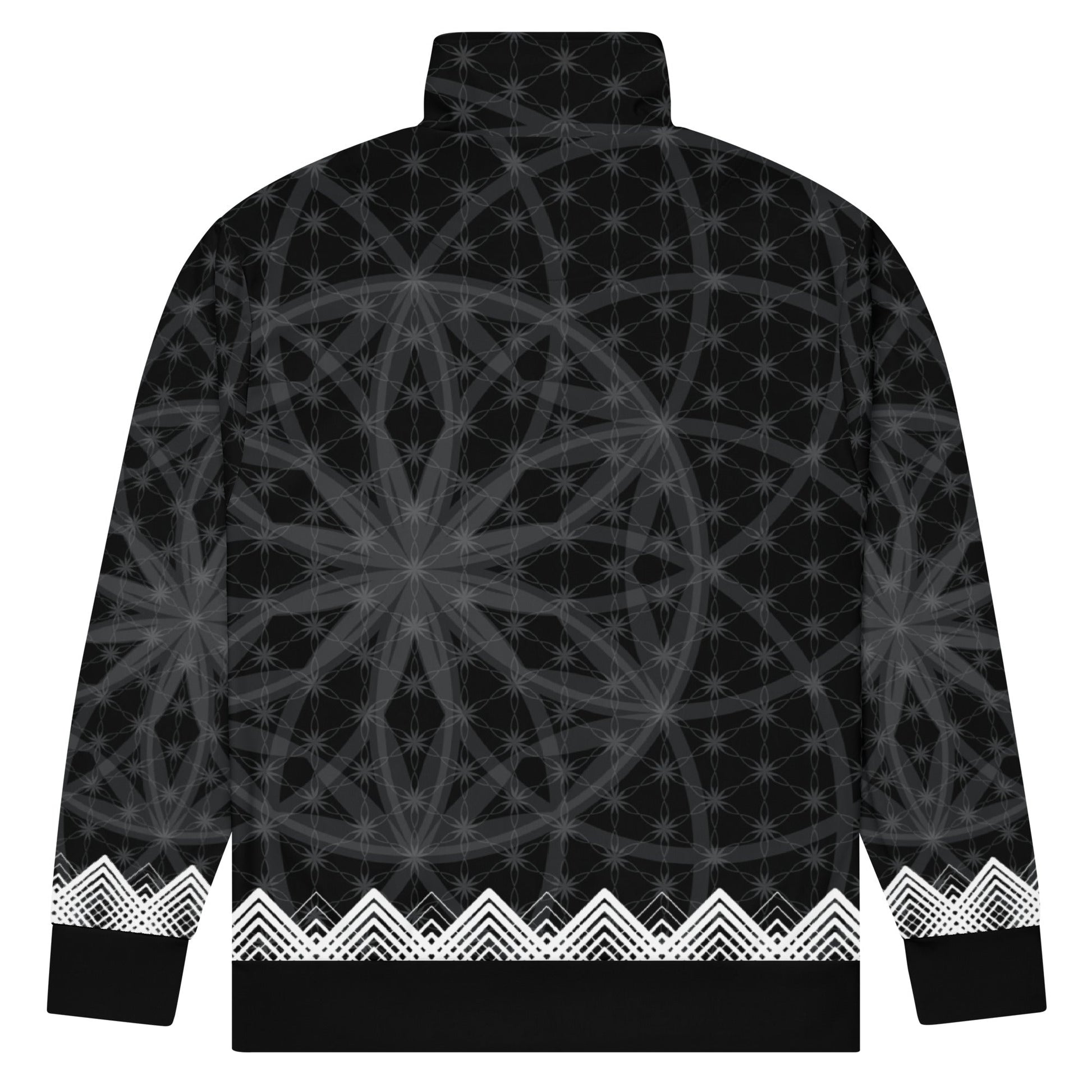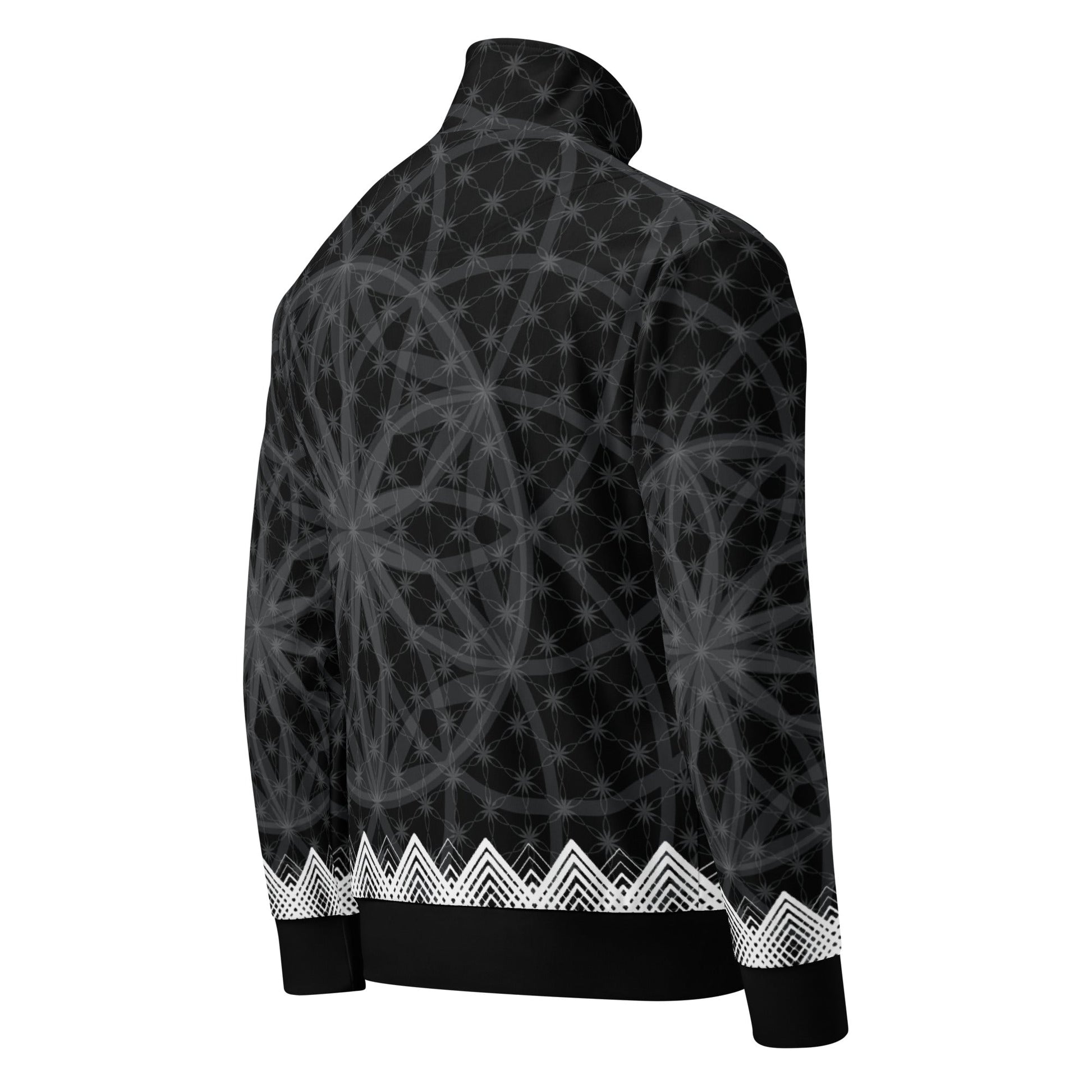 Wrap yourself in the Prima Mystica - a unisex track jacket where streetwear edge meets the timeless language of sacred geometry. The design radiates from a central Flower of Life foundation, expanding into intricate star formations and crowned by a rhythmic, chevron-like border. Crafted for versatility, it moves seamlessly from mindful moments to city streets.