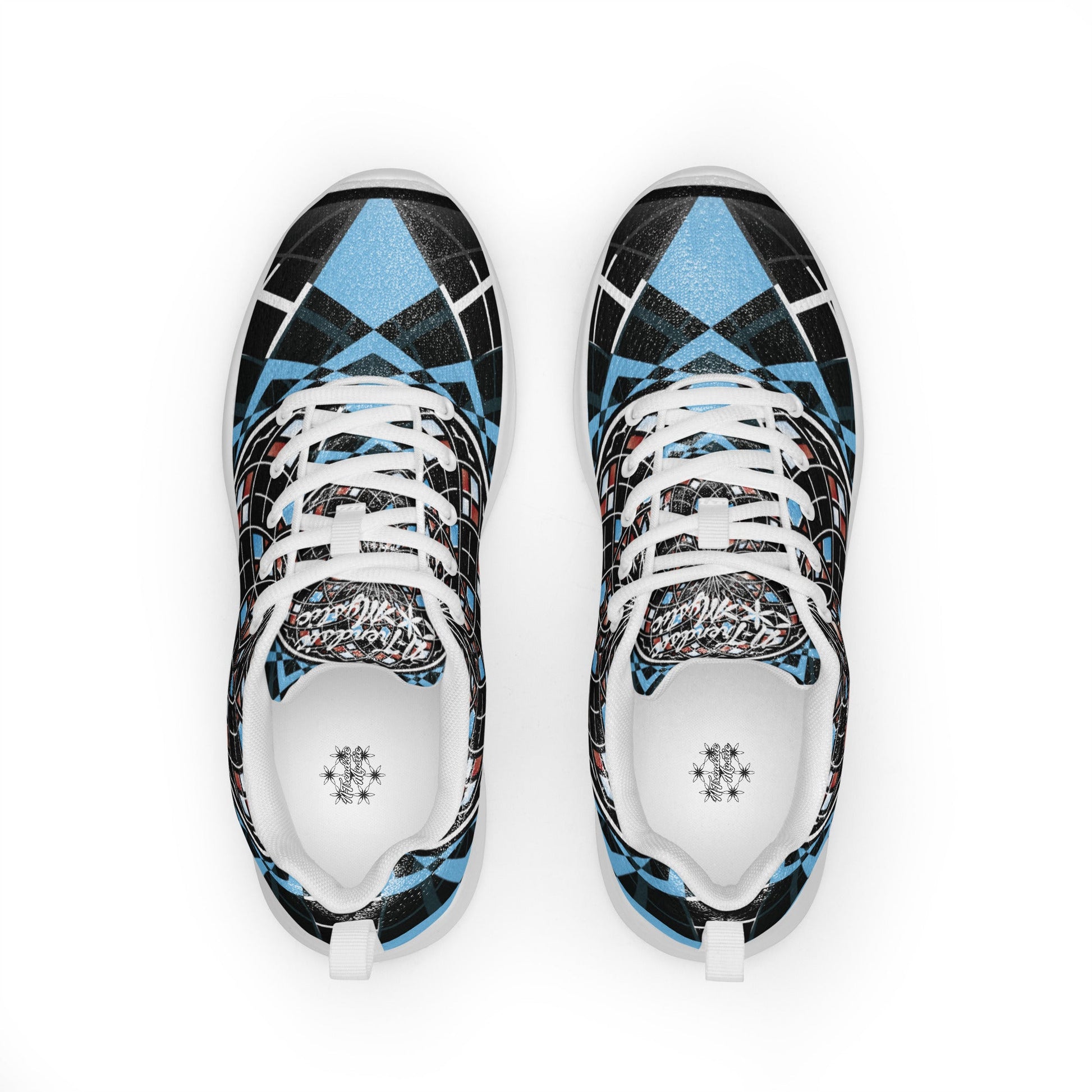 The Quantum Bloom Kicks fuse athletic performance with visionary design. Matching the Quantum Bloom Zip Hoodie, these sneakers carry the same cosmic mandala and geometric precision — black as the void, energized with sky blues and crimson accents that bloom across the uppers.