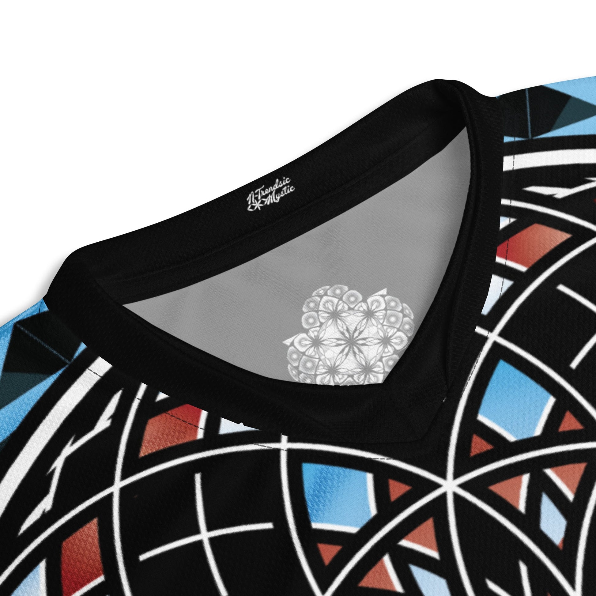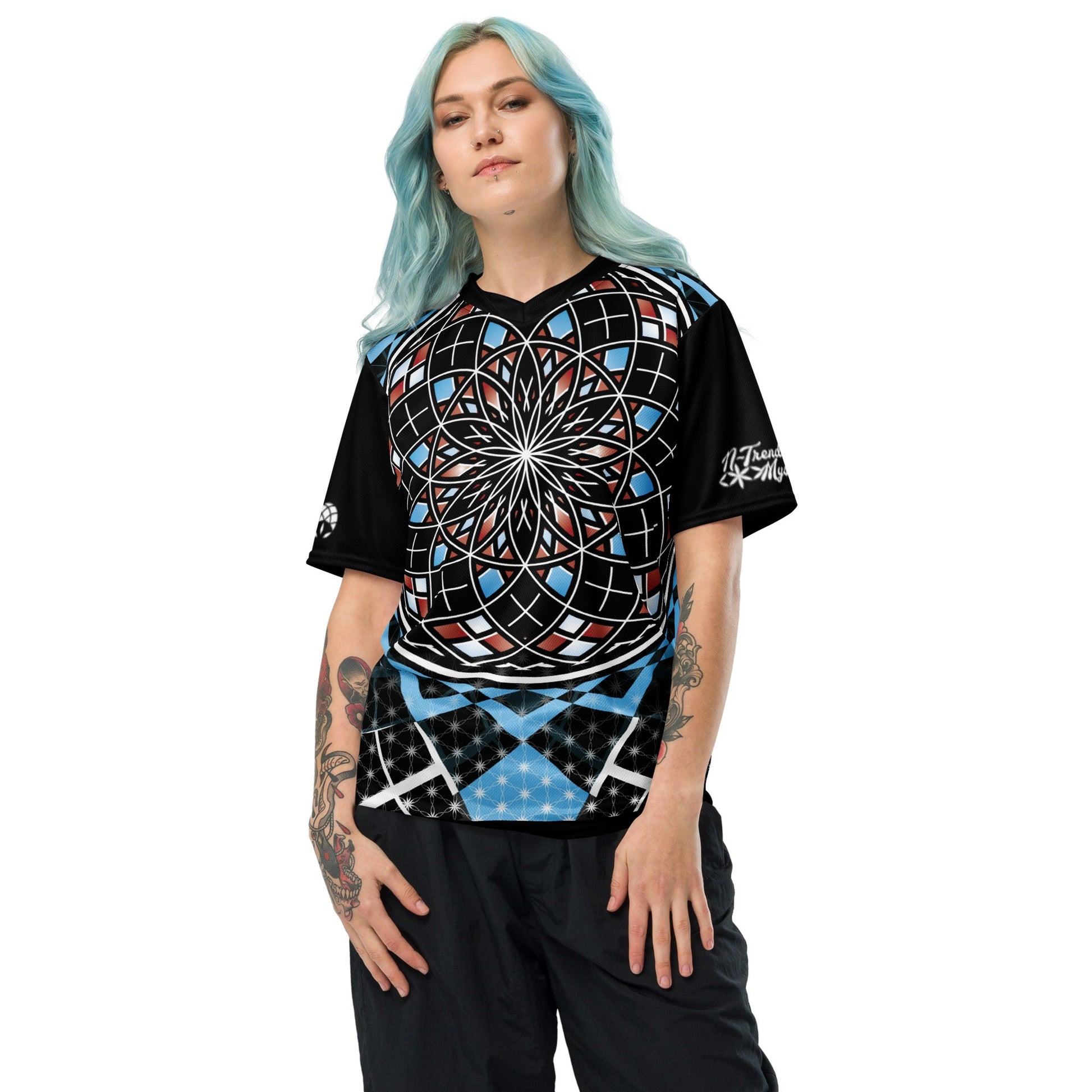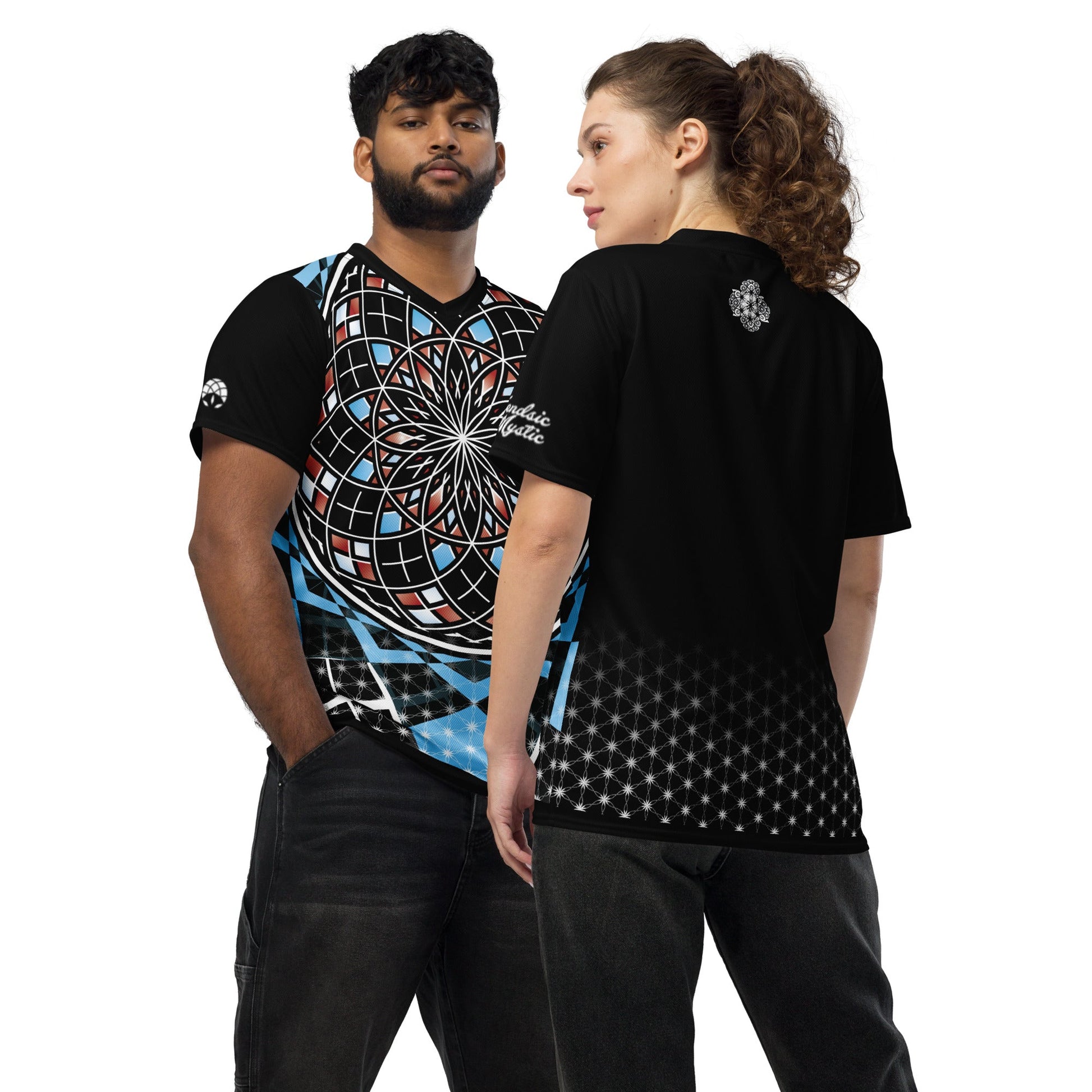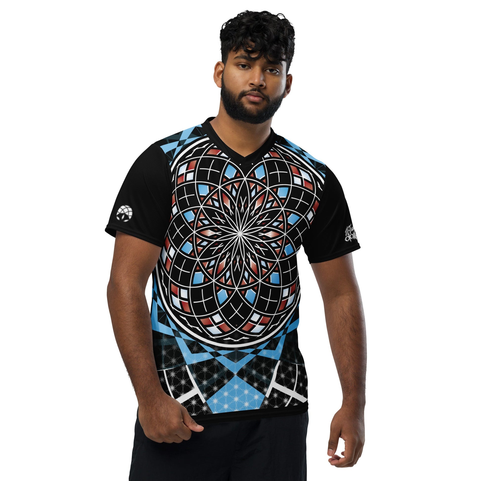 The Quantum Bloom Recycled Unisex Sports Jersey fuses athletic performance with visionary art. Featuring your original sacred geometry in an electrifying bloom of intersecting petals, it’s designed for movement, breathability, and a statement that transcends the playing field.