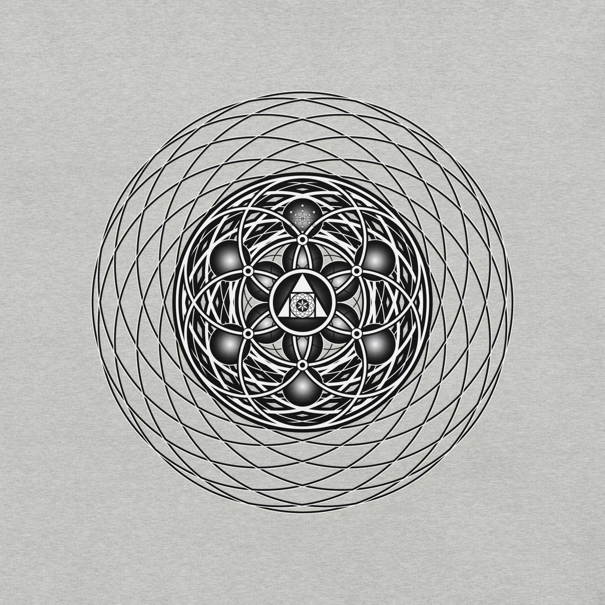 At the heart of the design lies the Flower of Life, overlaid with an interlocking weave of circles that spiral outward into infinity. This central mandala holds the alchemical triangle - the glyph of fire - with the all-seeing eye at its core, representing awakened perception. Encircling it is a toroidal lattice, evoking the flow of energy through all living systems. Together, these layers form a map of unity: earth, air, fire, water, and ether, perfectly balanced in the harmony of the quintessence.