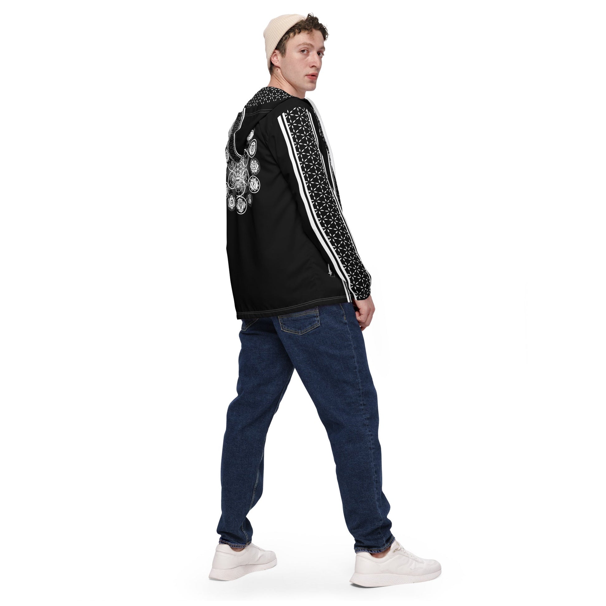 Sharp lines, light ride. Sacred Stripes puts a clean monochrome stripe down a featherweight, water-resistant shell - with the mystic emblem rising on the back. Street to studio, carry-everywhere layer.