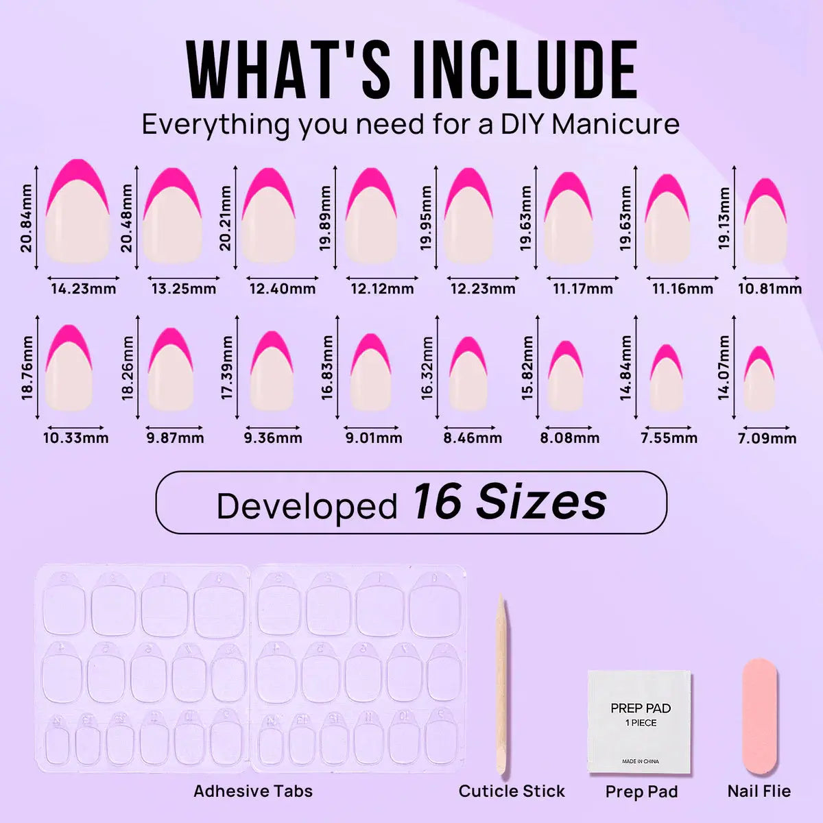 - Includes 32 tip nails, nail glue, nail file, alcohol pad, adhesive tabs,and nail removing/cuticle pusher tool
