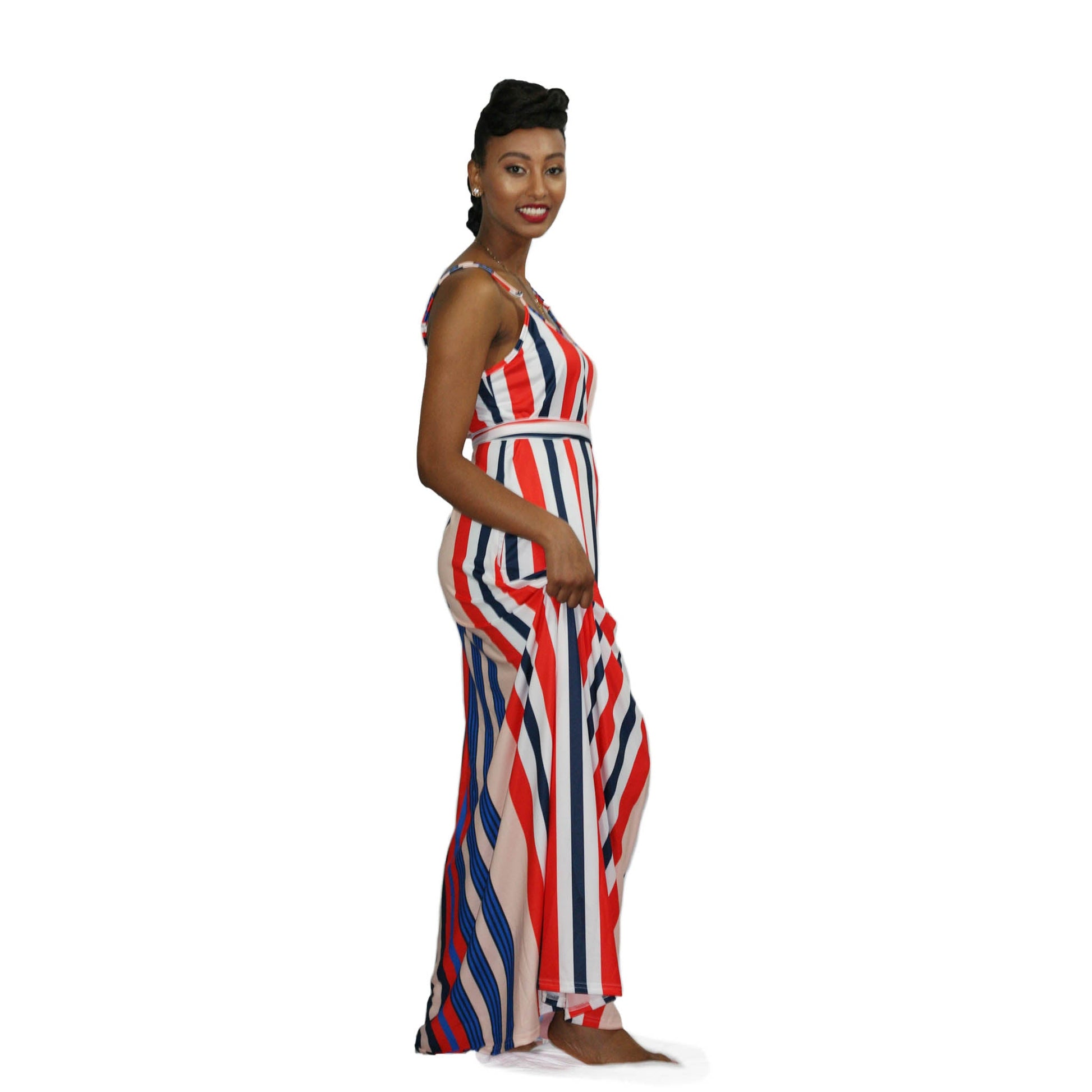 A gorgeous sleeveless striped maxi dress, designed with a matching belt which can also be used has a headband with pockets at the sides. Perfect for summer weather. This dress is chic and classy, an essential piece for your wardrobe. Very easy to wear and feels supper soft on skin, you will love love this classy dress.