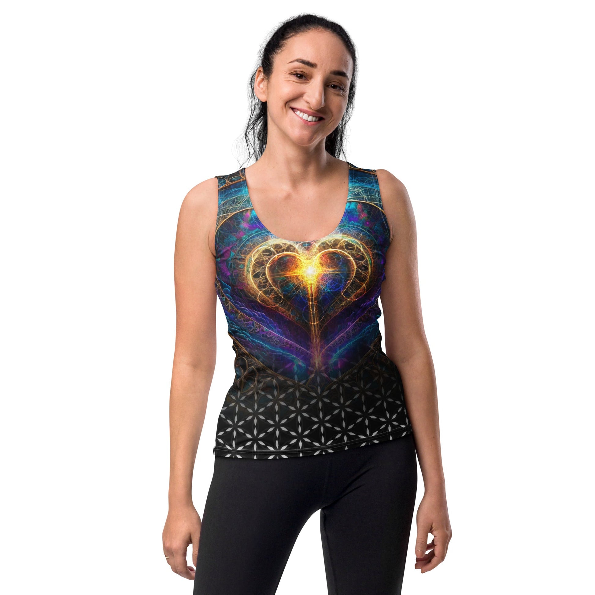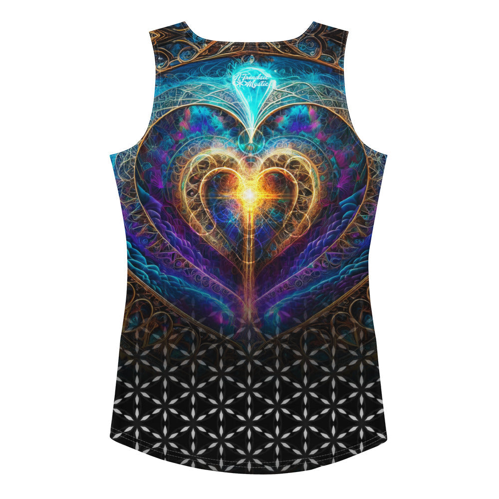 Transmission: The heart geometry pulses with unity; its golden lines weave into a map of ascent, each curve a bridge between individual soul and universal heart. On the cut & sew tank, the art becomes an intentional beacon, keeping your core illuminated throughout the day.