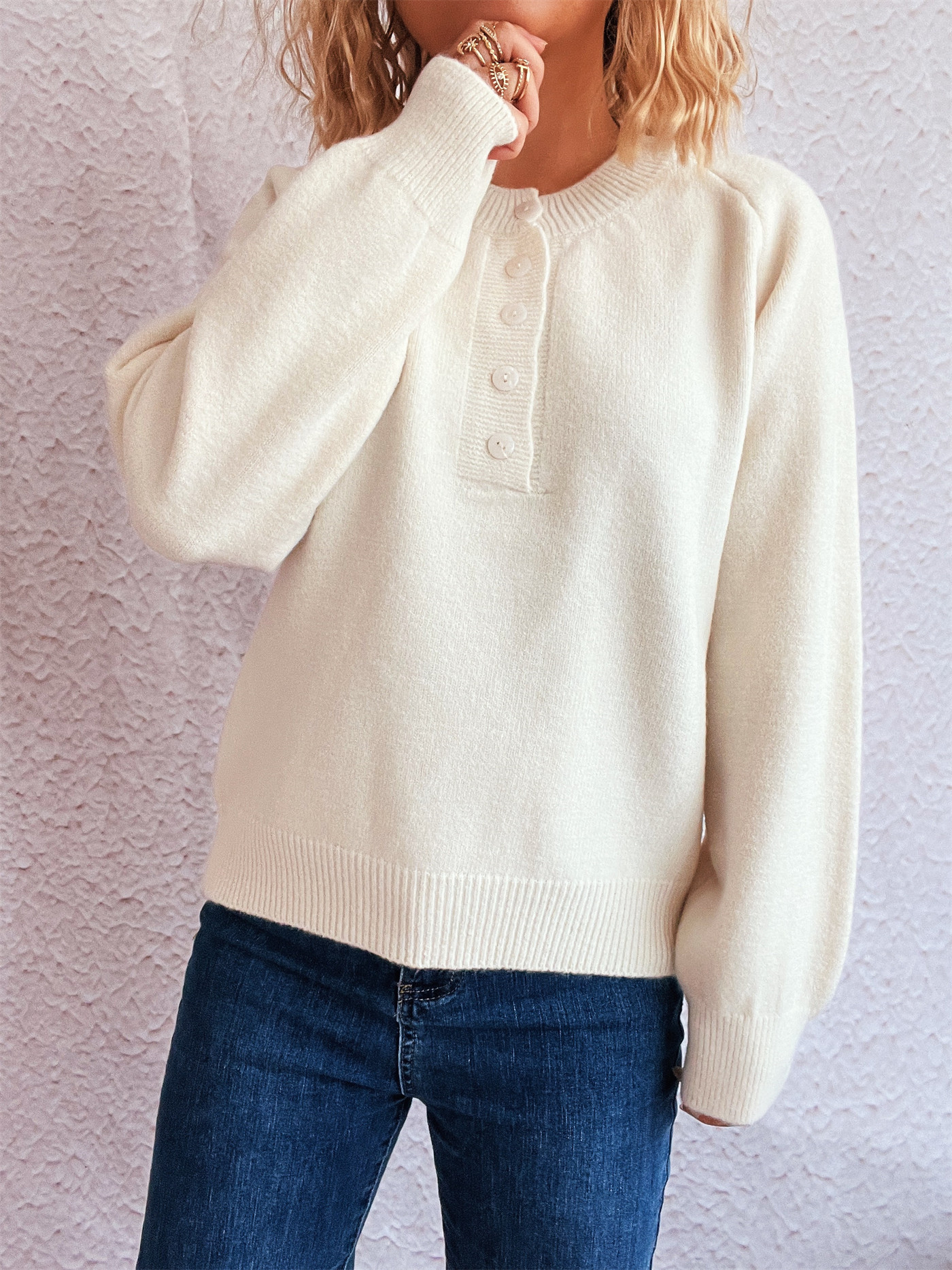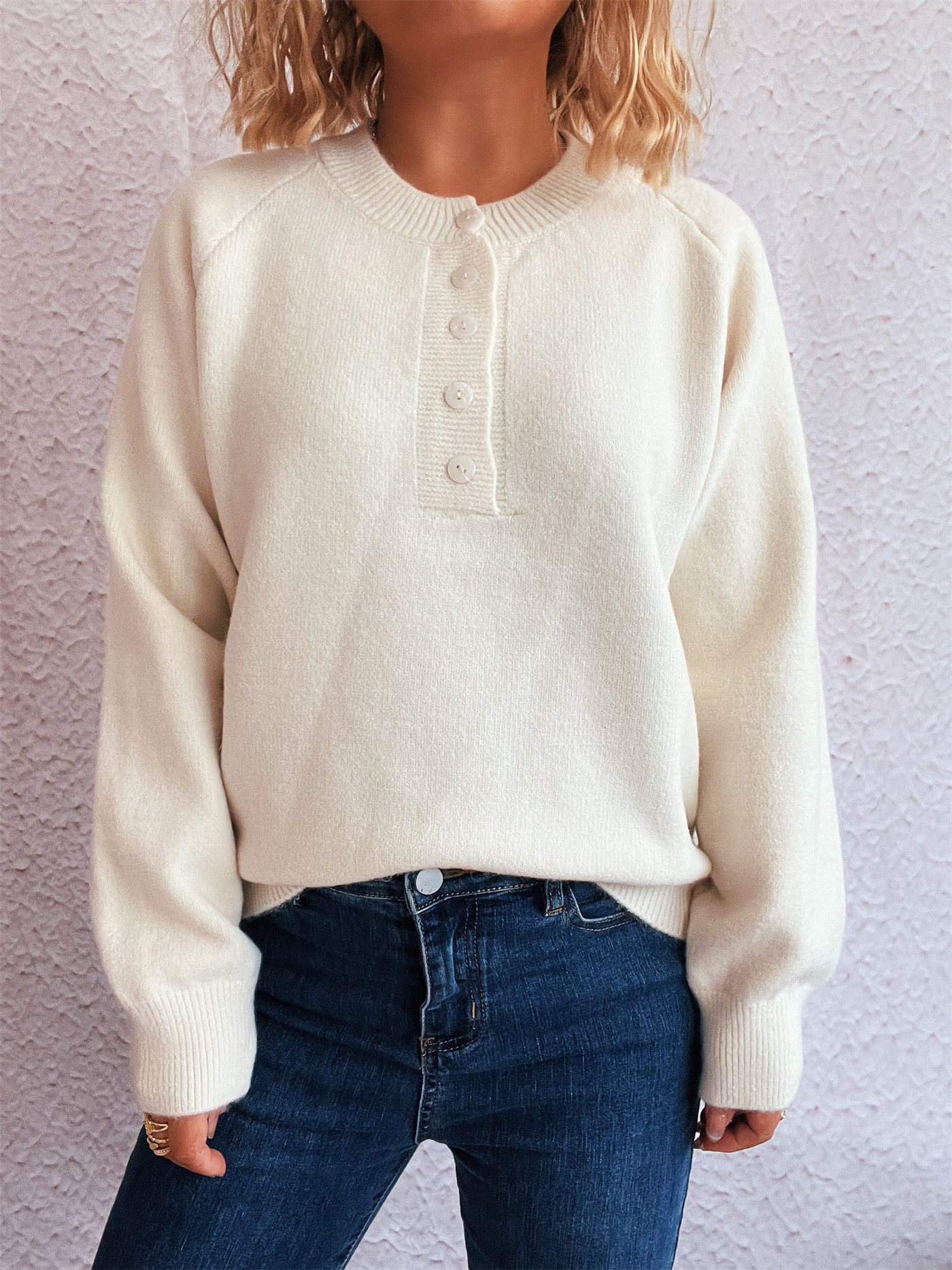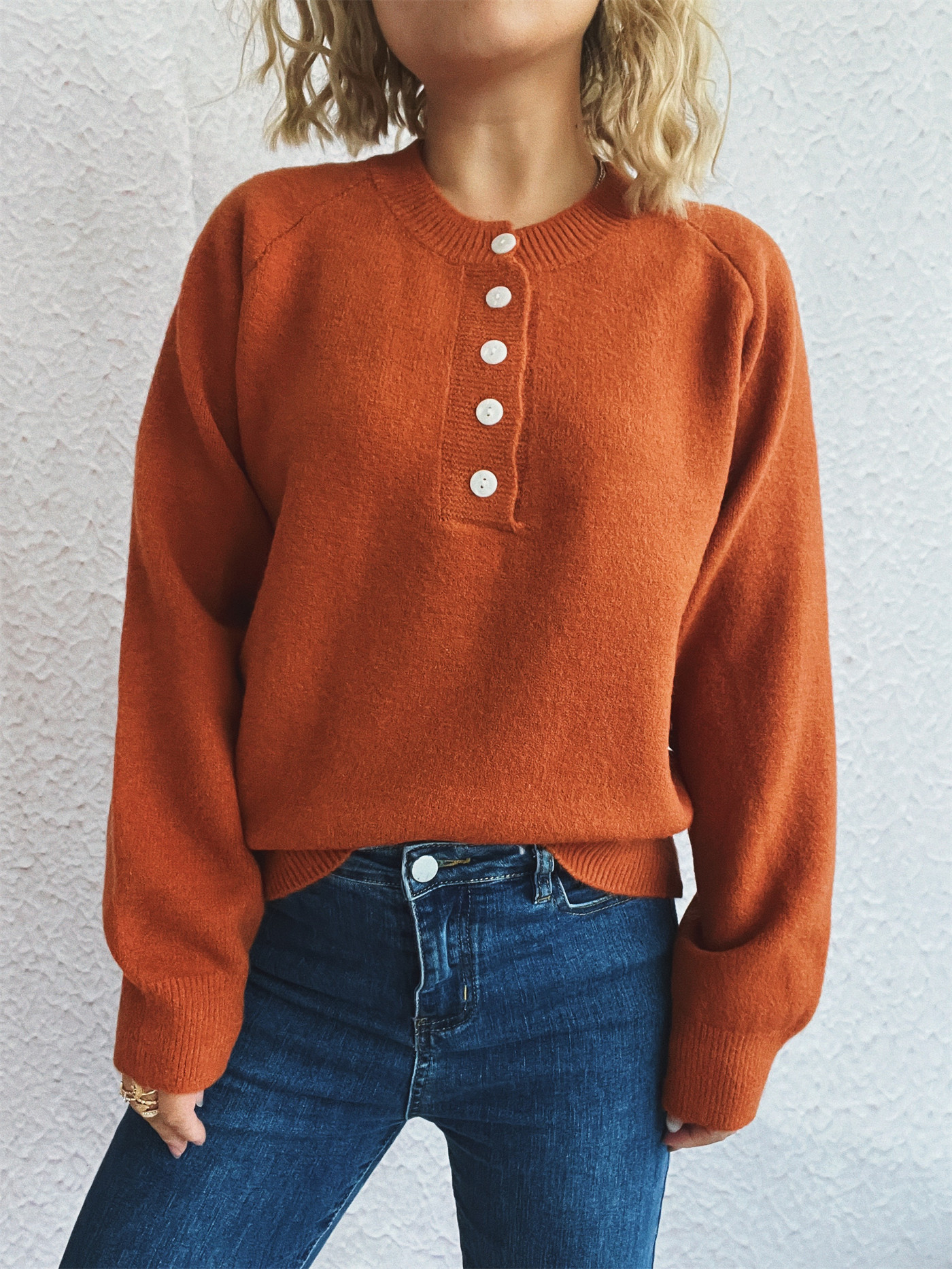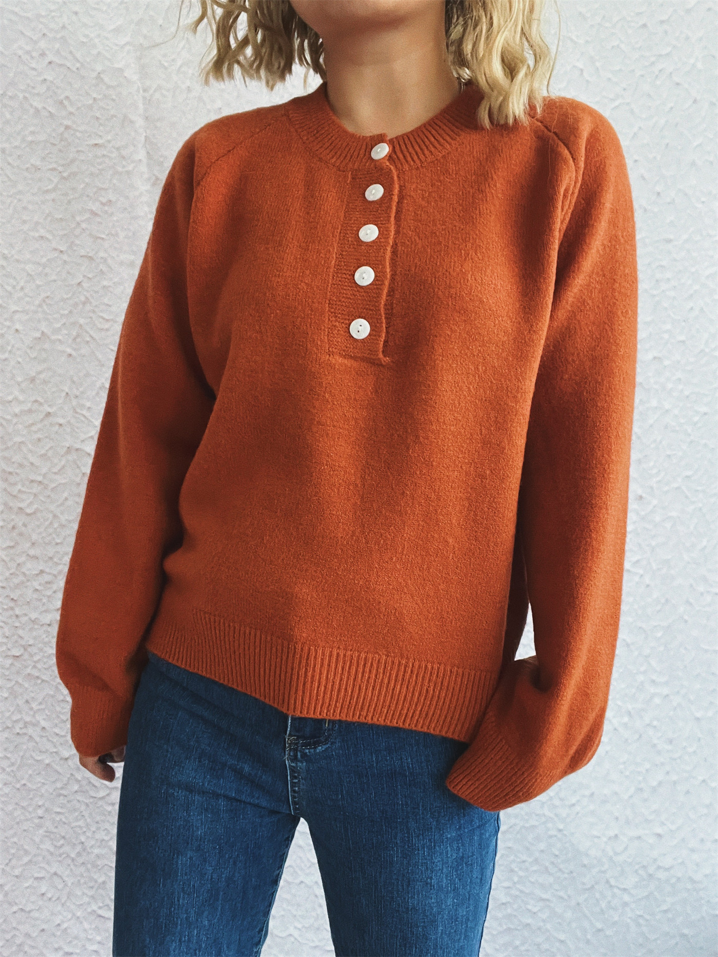 Women's Solid Color Buttons Casual Knitted Round Neck Long Sleeve Warm Sweater
