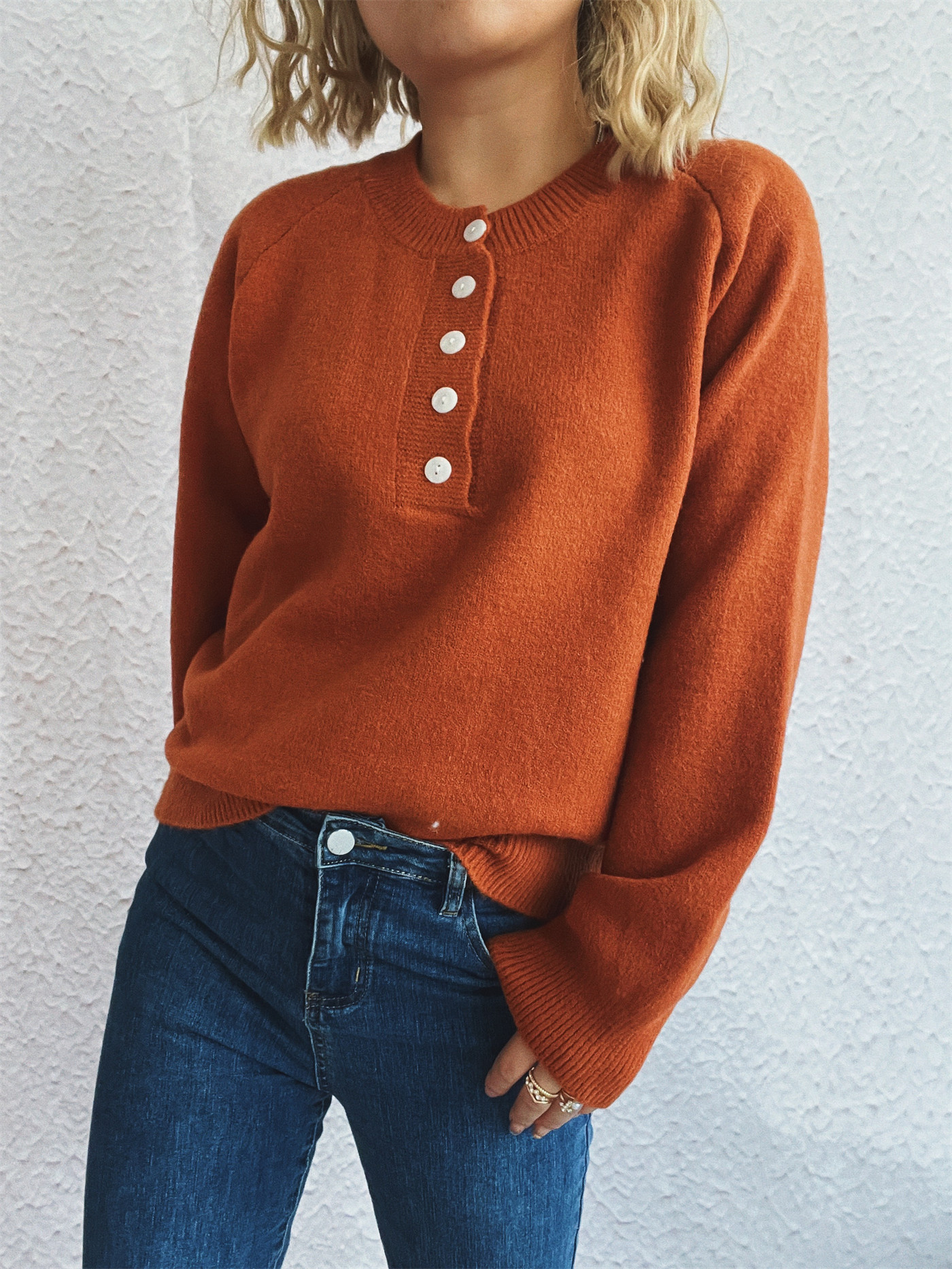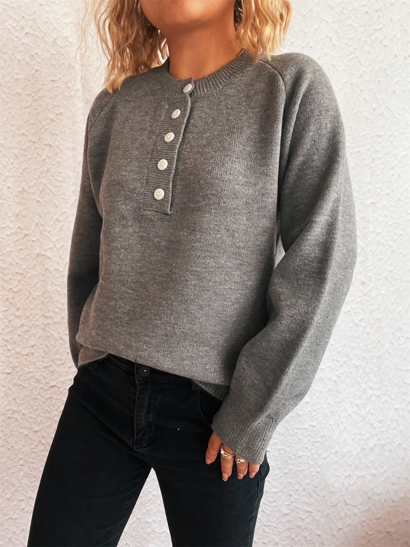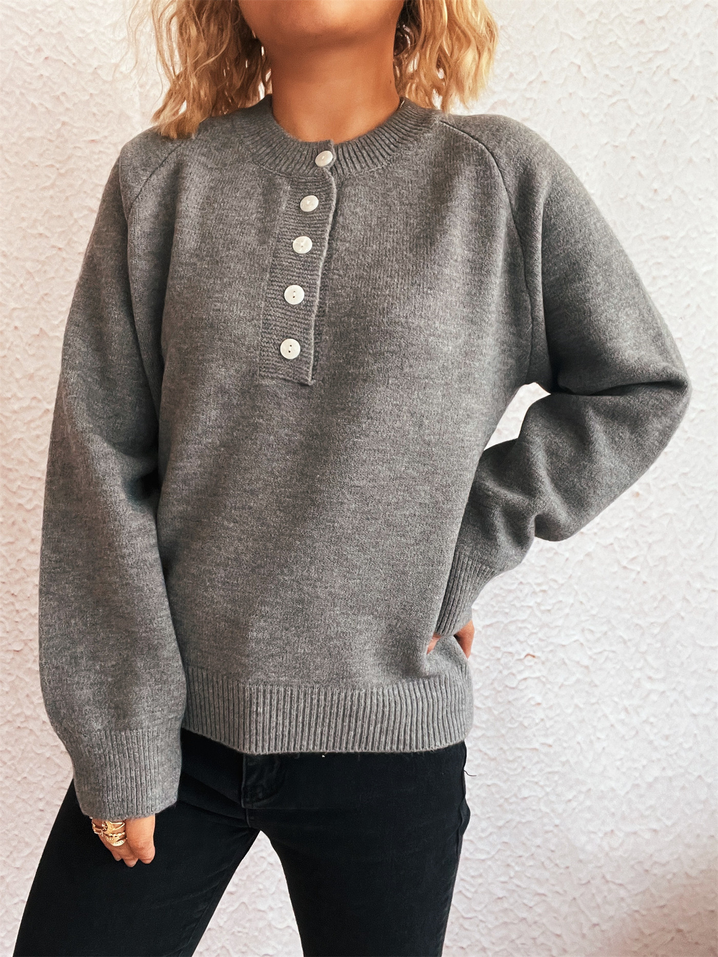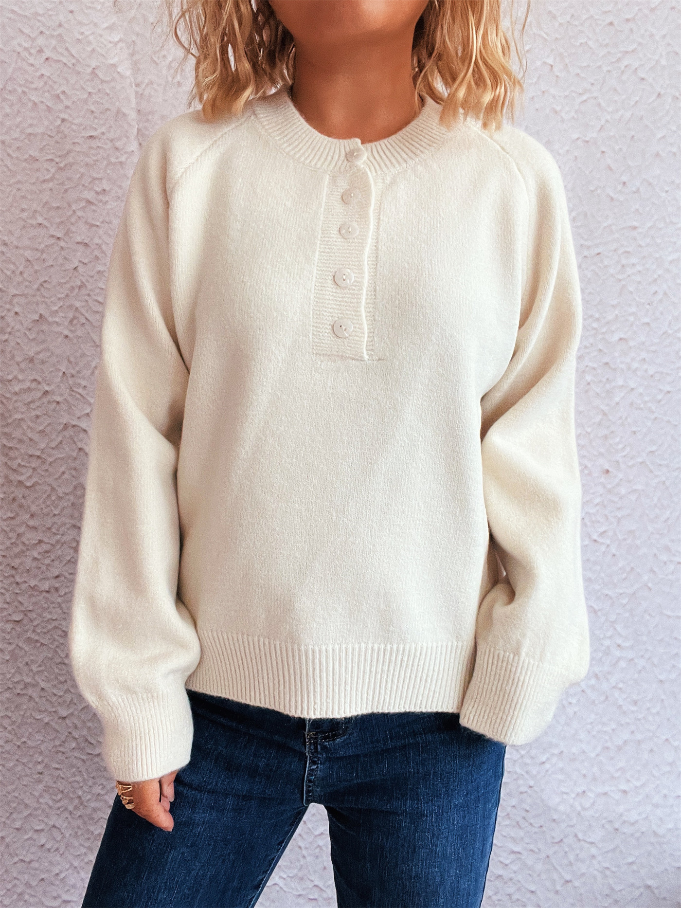 Women's Solid Color Buttons Casual Knitted Round Neck Long Sleeve Warm Sweater